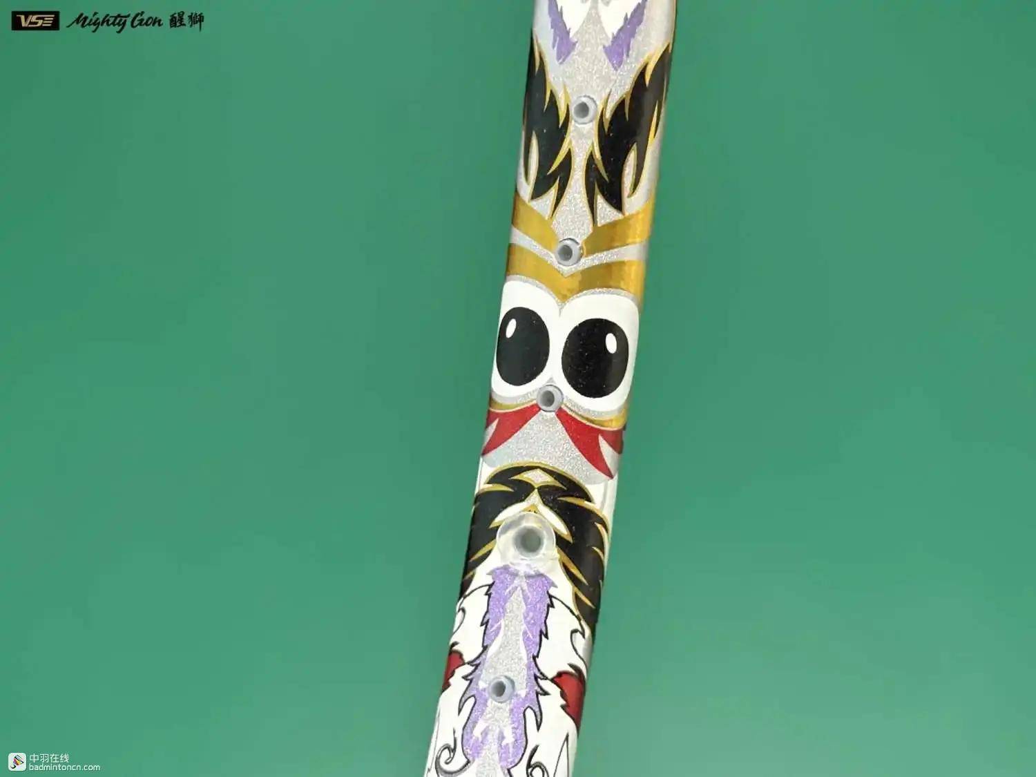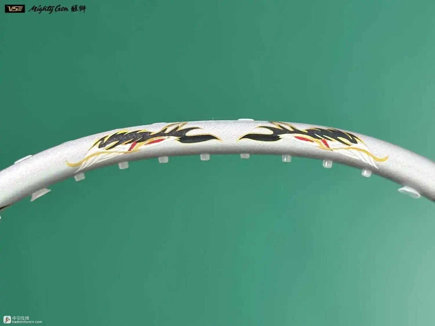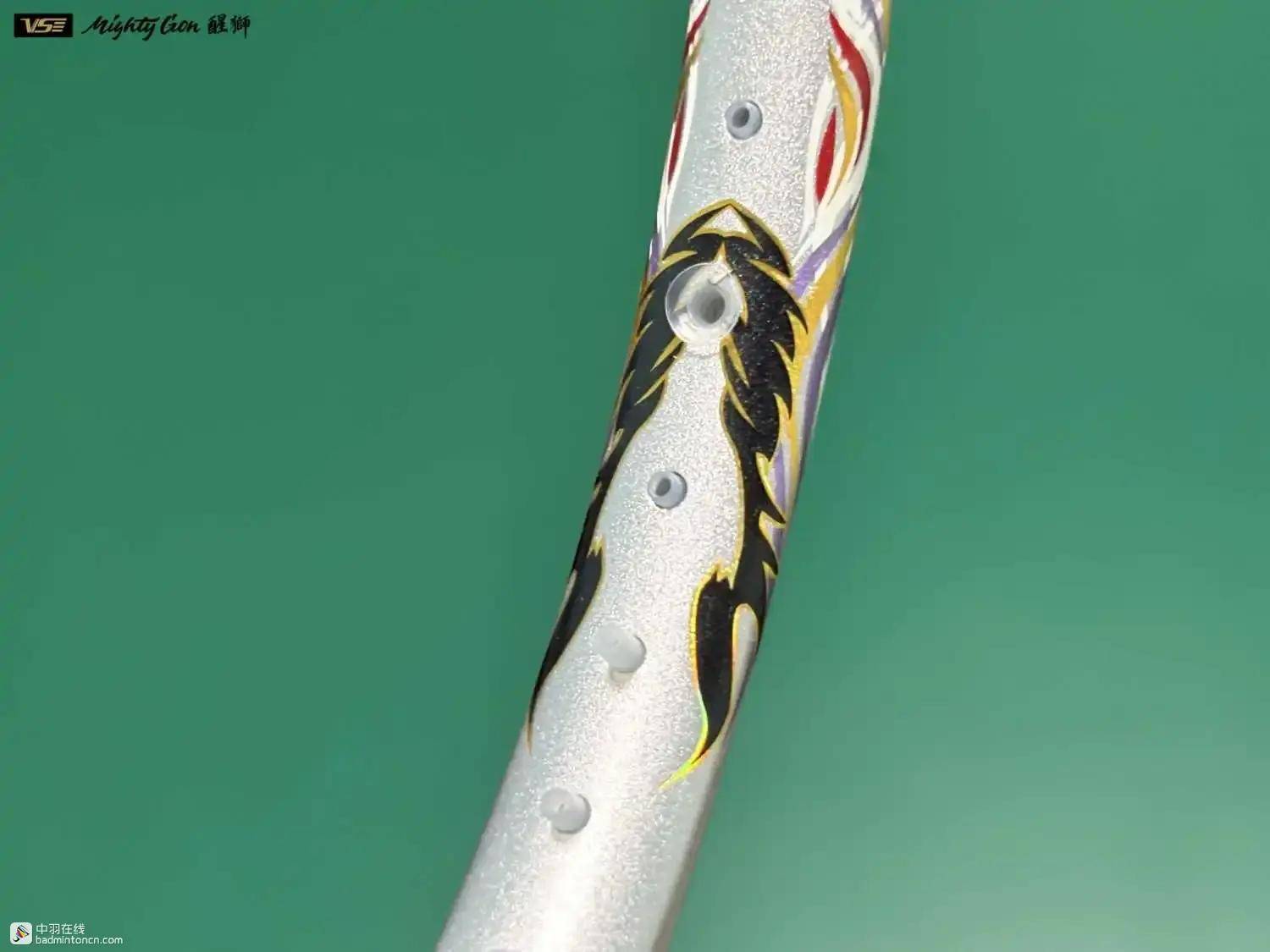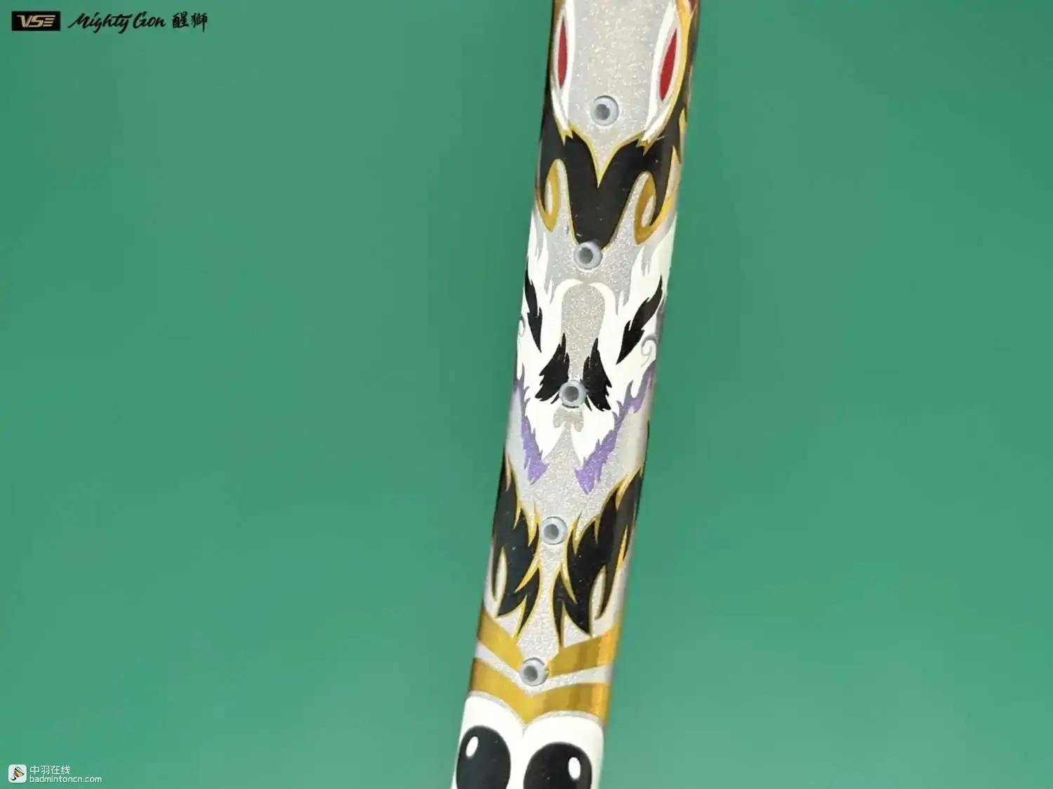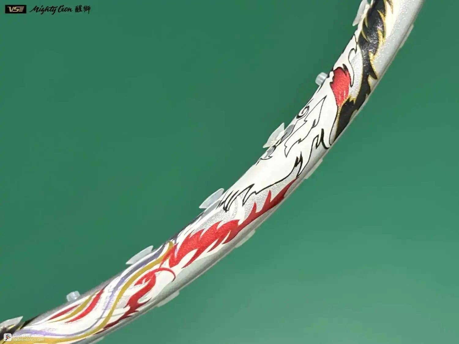 银醒狮的拍框采用对称式涂装设计,融入醒狮狮头造型,颜色方面除金色镭射水标之外,还大量运用黑、红、白和紫色,色彩丰富。