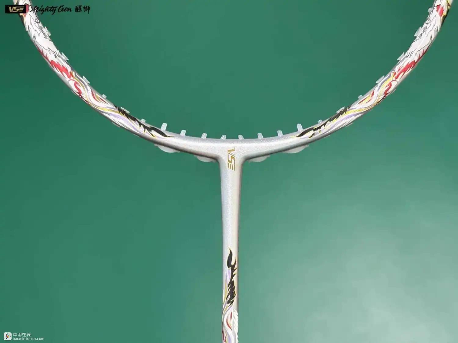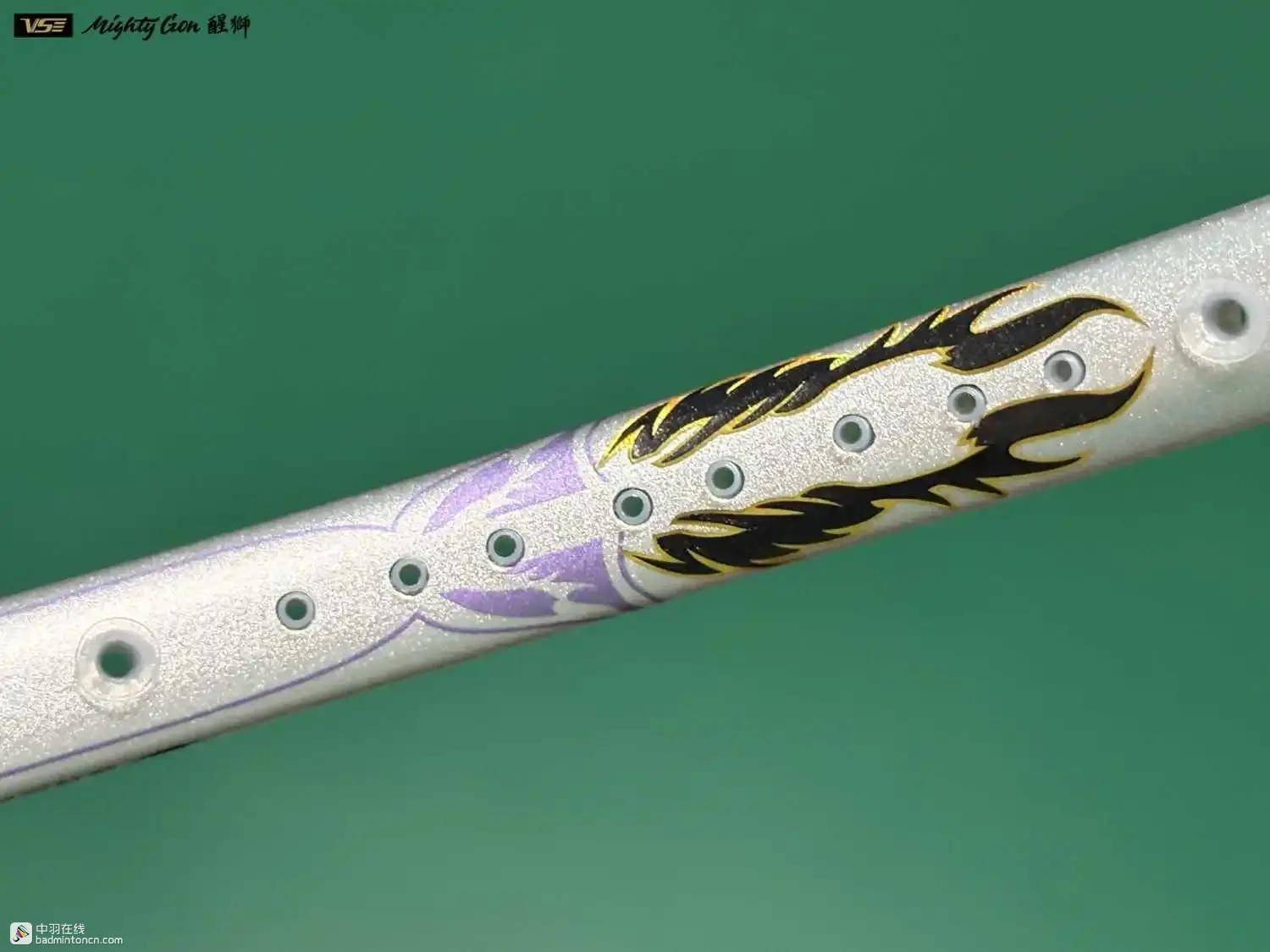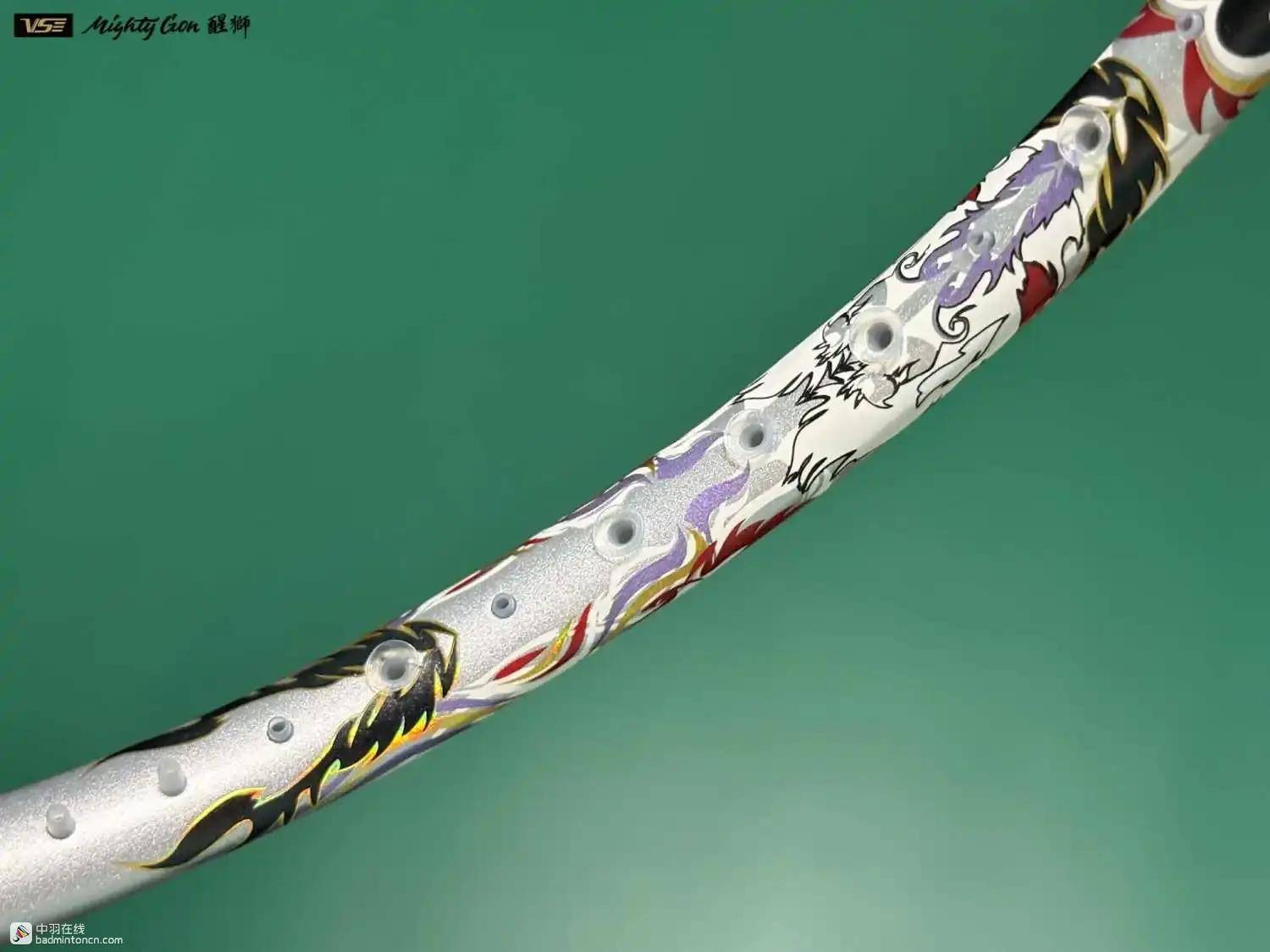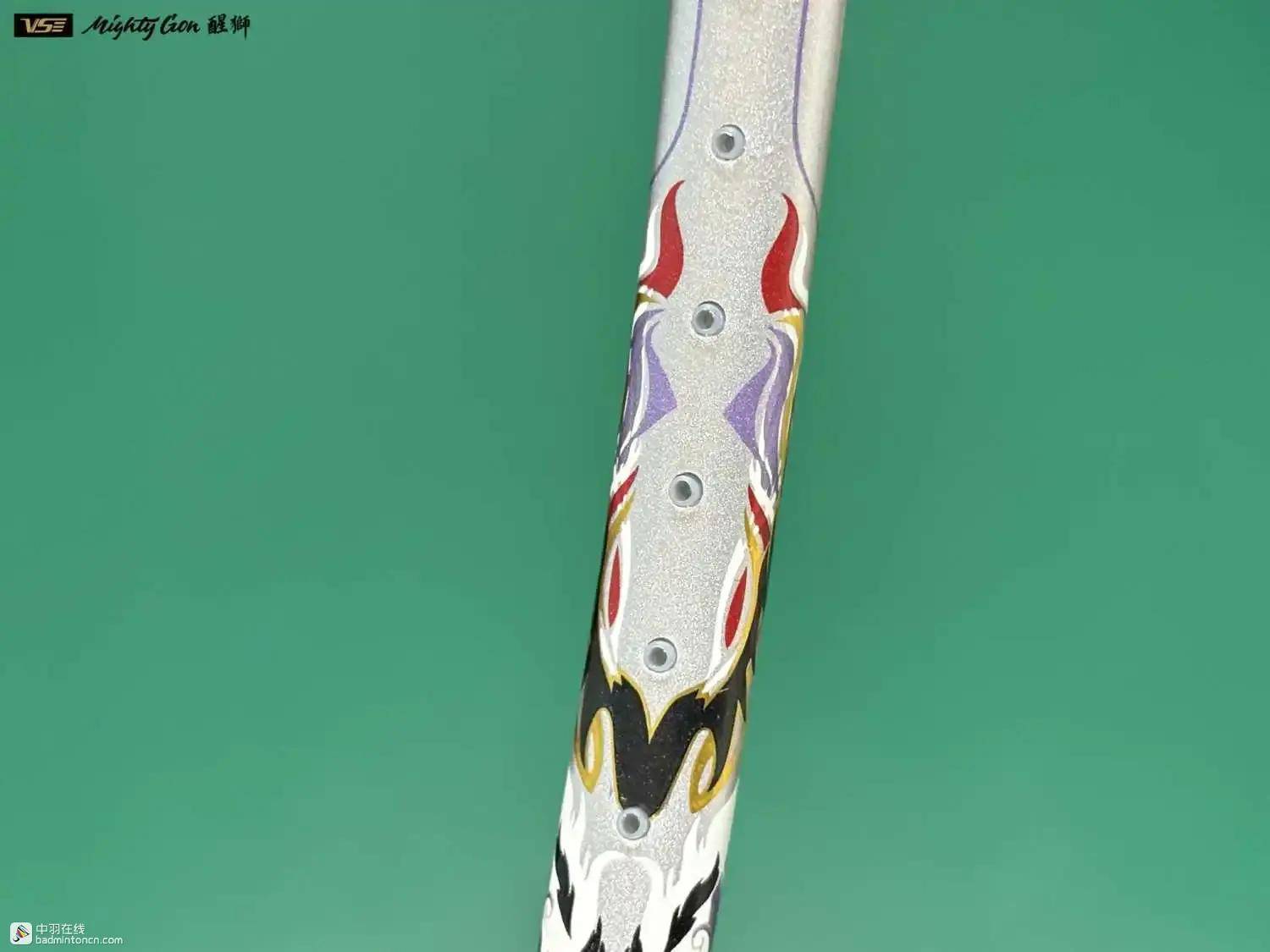 银醒狮的拍框采用对称式涂装设计,融入醒狮狮头造型,颜色方面除金色镭射水标之外,还大量运用黑、红、白和紫色,色彩丰富。