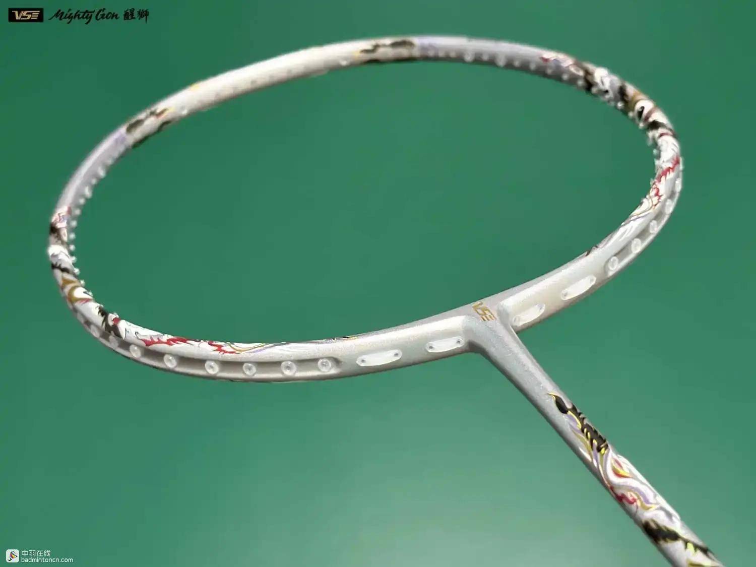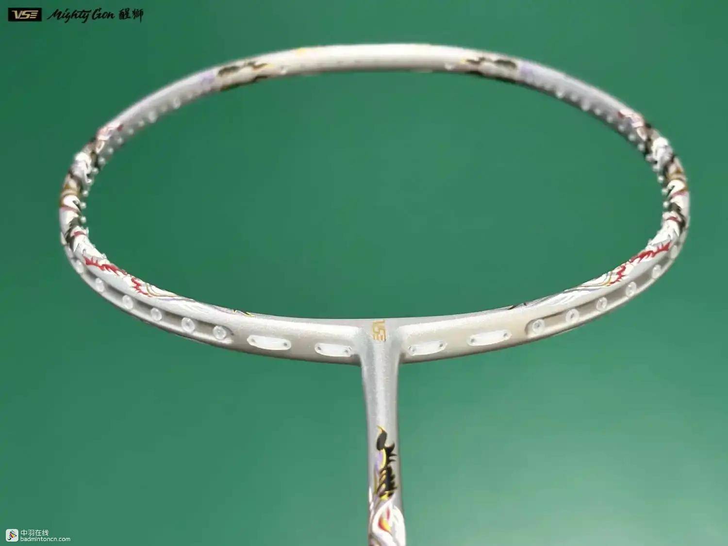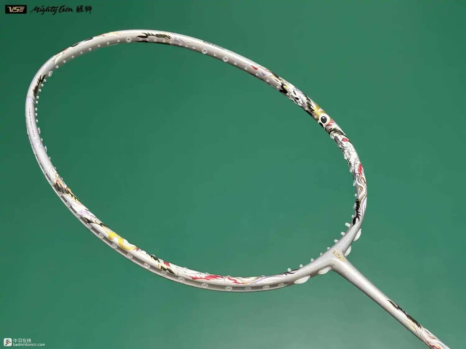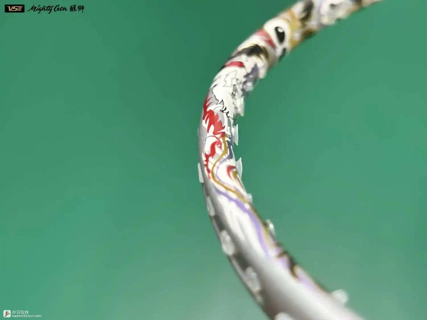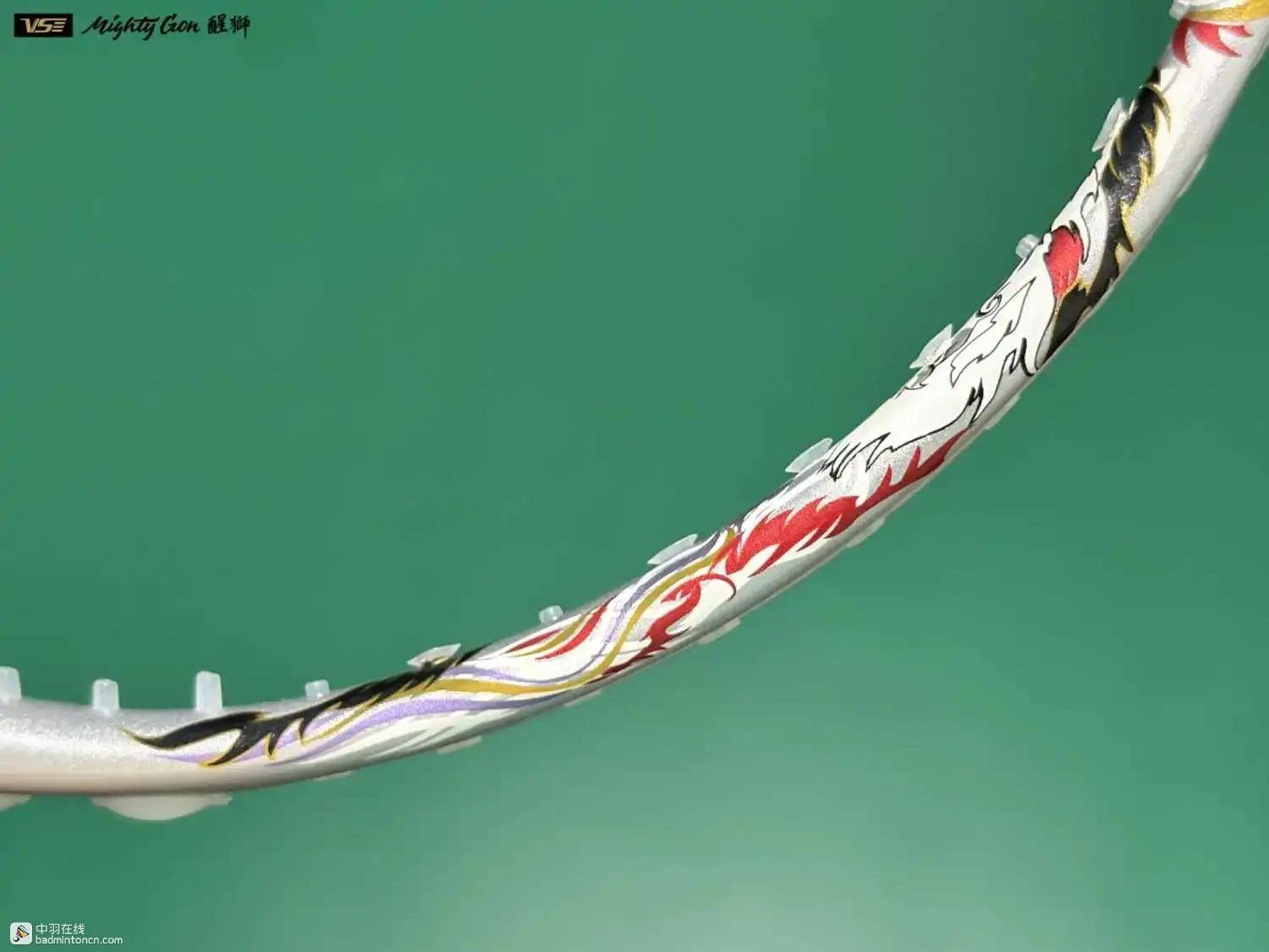 银醒狮的拍框采用对称式涂装设计,融入醒狮狮头造型,颜色方面除金色镭射水标之外,还大量运用黑、红、白和紫色,色彩丰富。