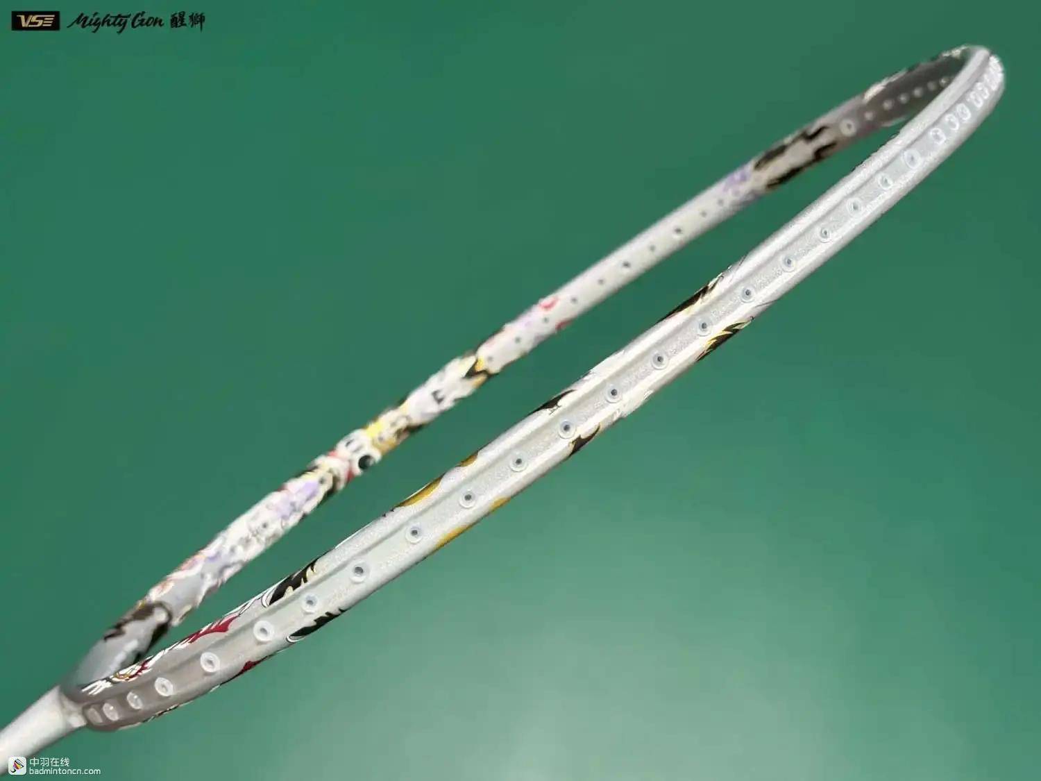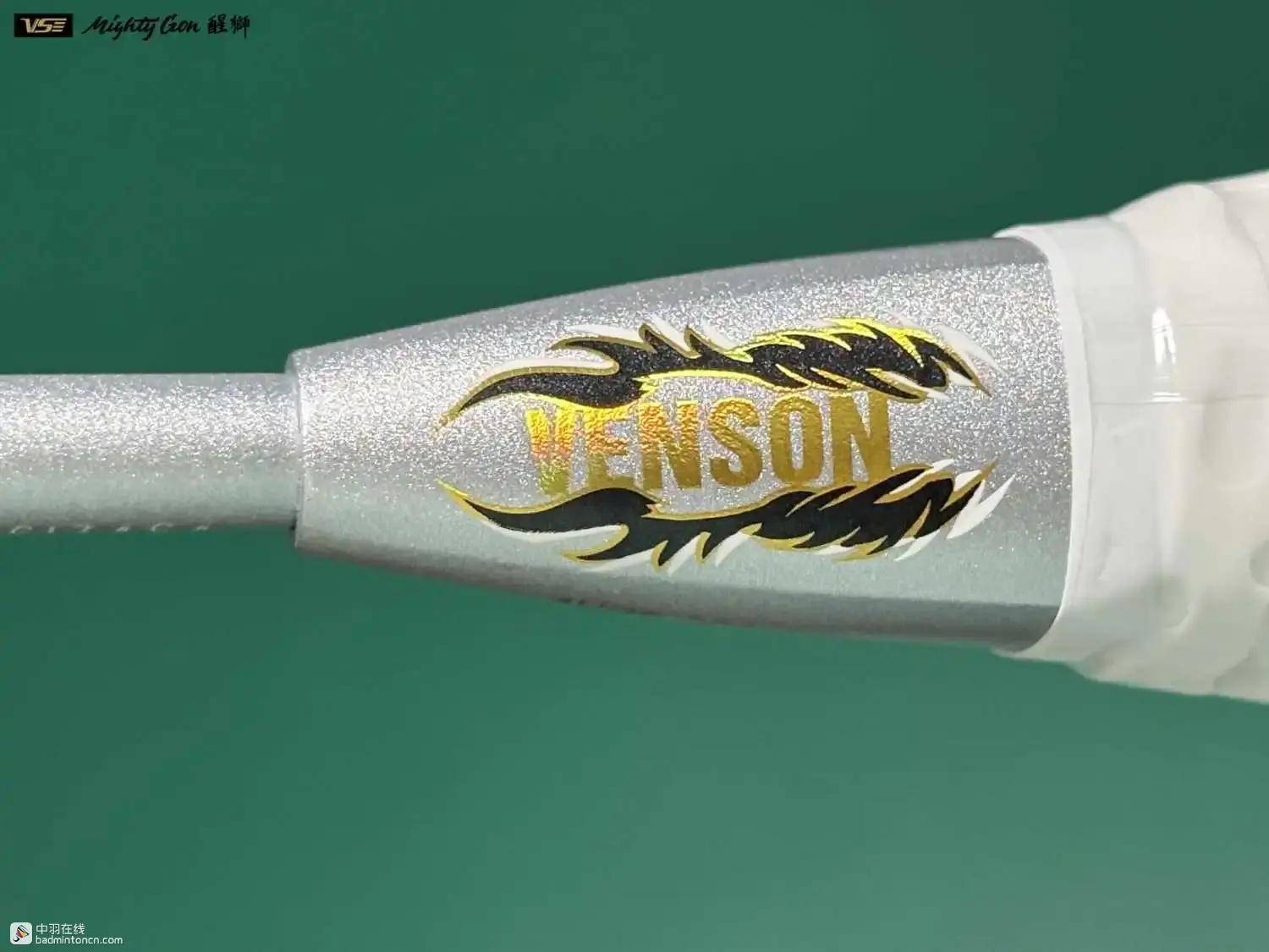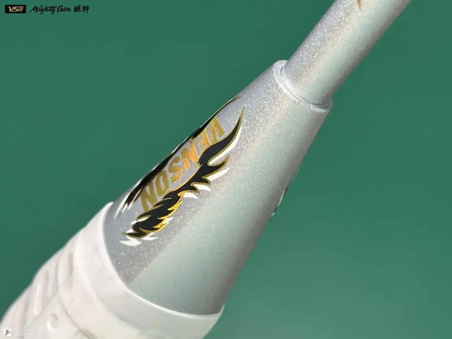 银醒狮延续了先前两款醒狮的涂装设计,只是更换了底色,全拍以金属银作为基调,从锥盖一直覆盖到拍框,再加上大量运用的金色镭射水标,第一眼看上去就像一把由金银打造的华丽武器,尽显高级。