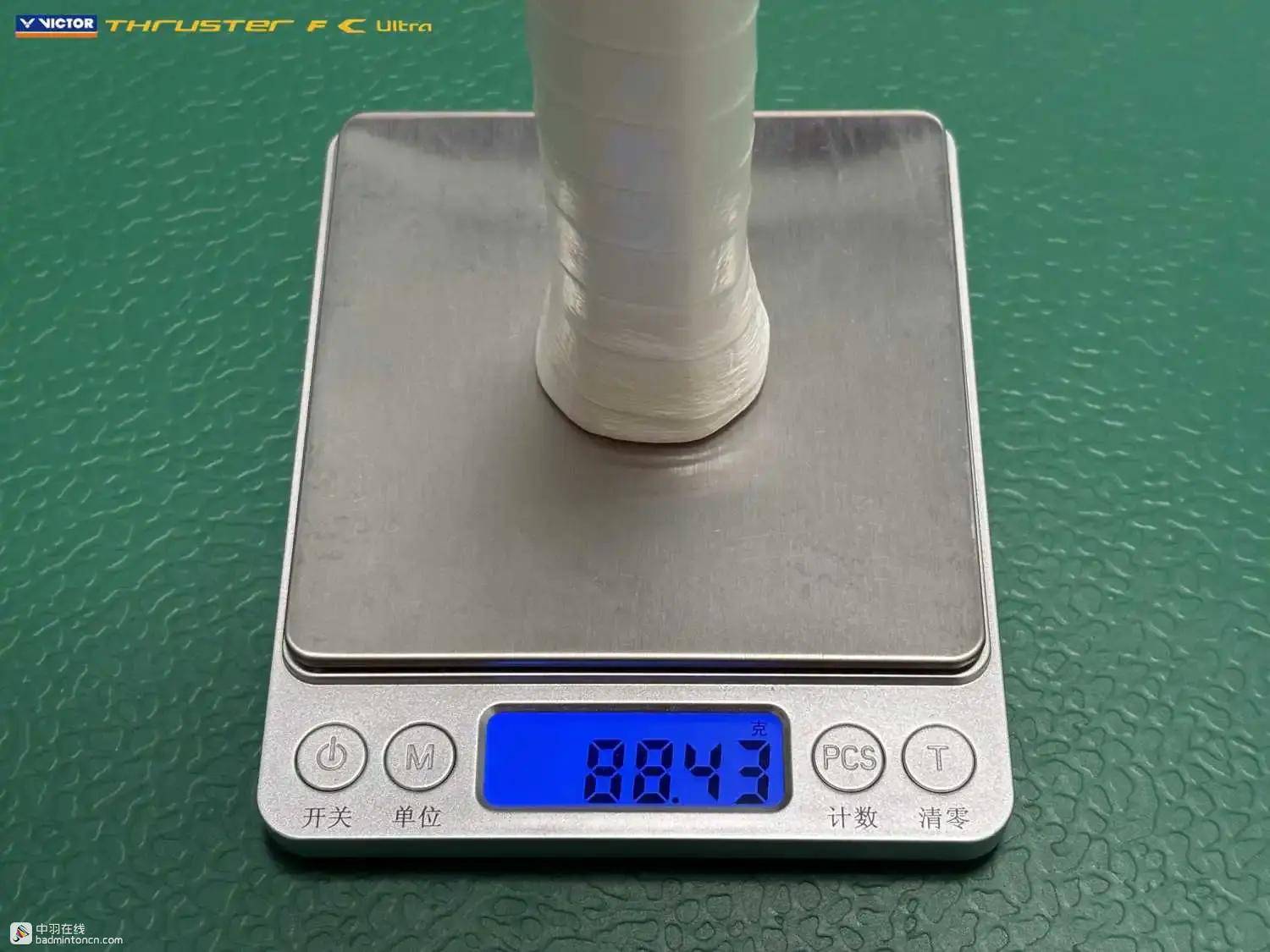 TK-F C Ultra是采用悬浮科技手柄的高端球拍,因此出厂即是无底胶状态,空拍去除热缩膜之后,重约77.39g,平衡点约为328mm。