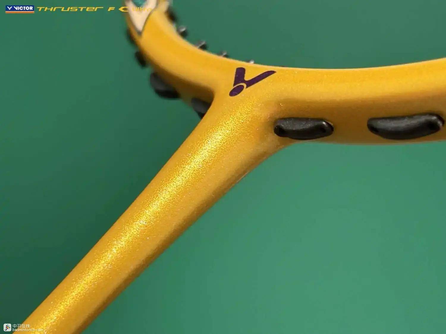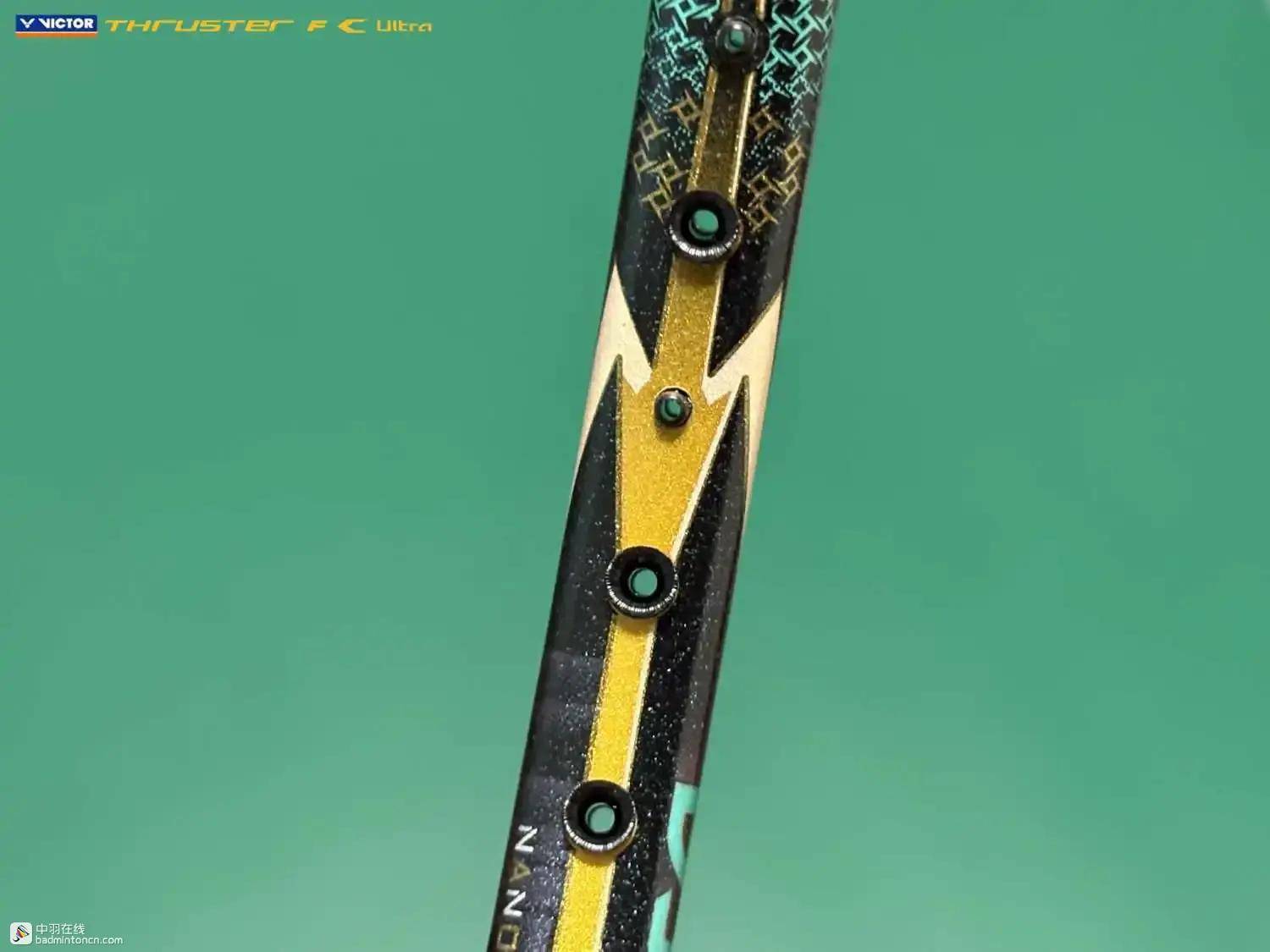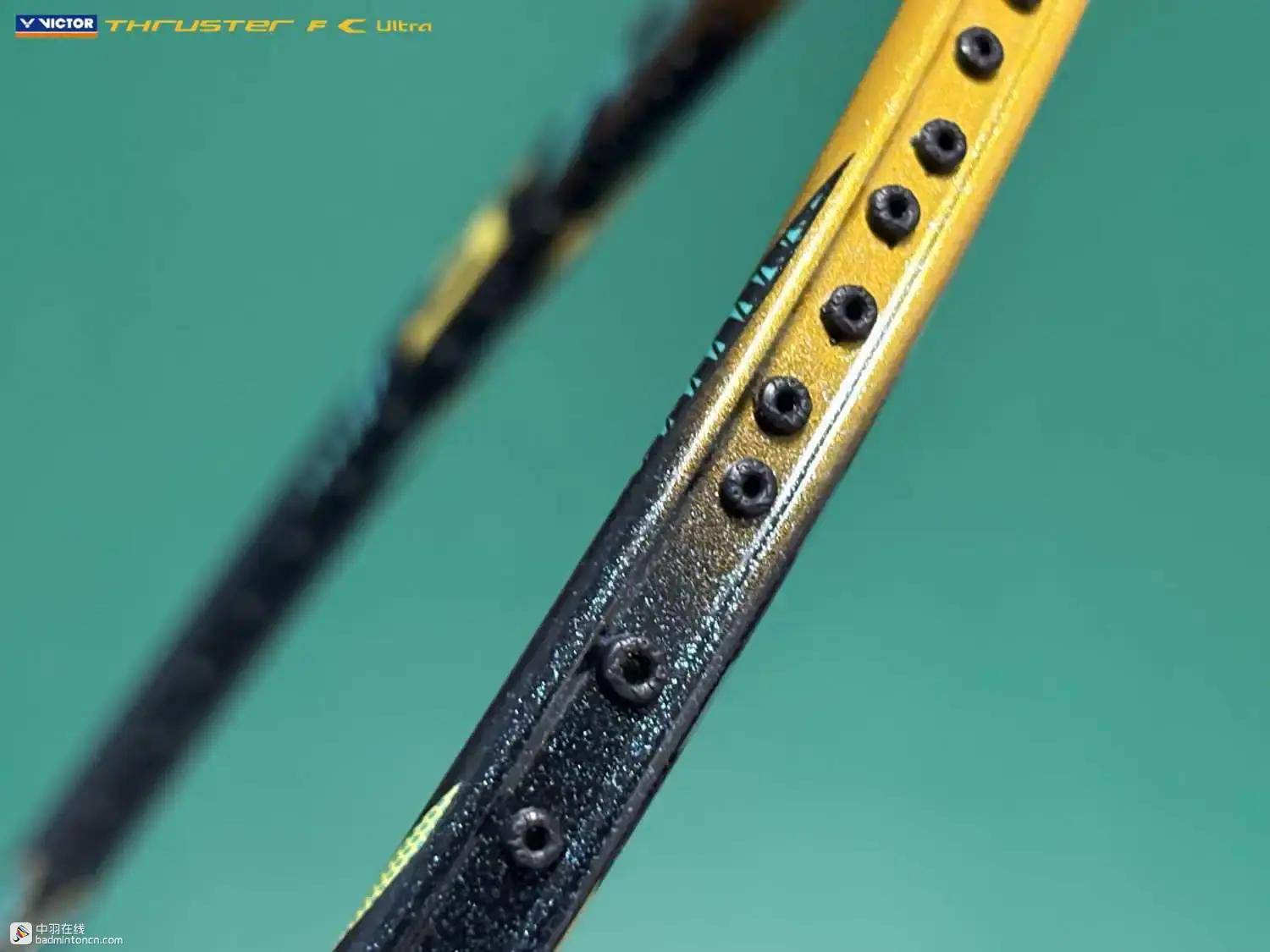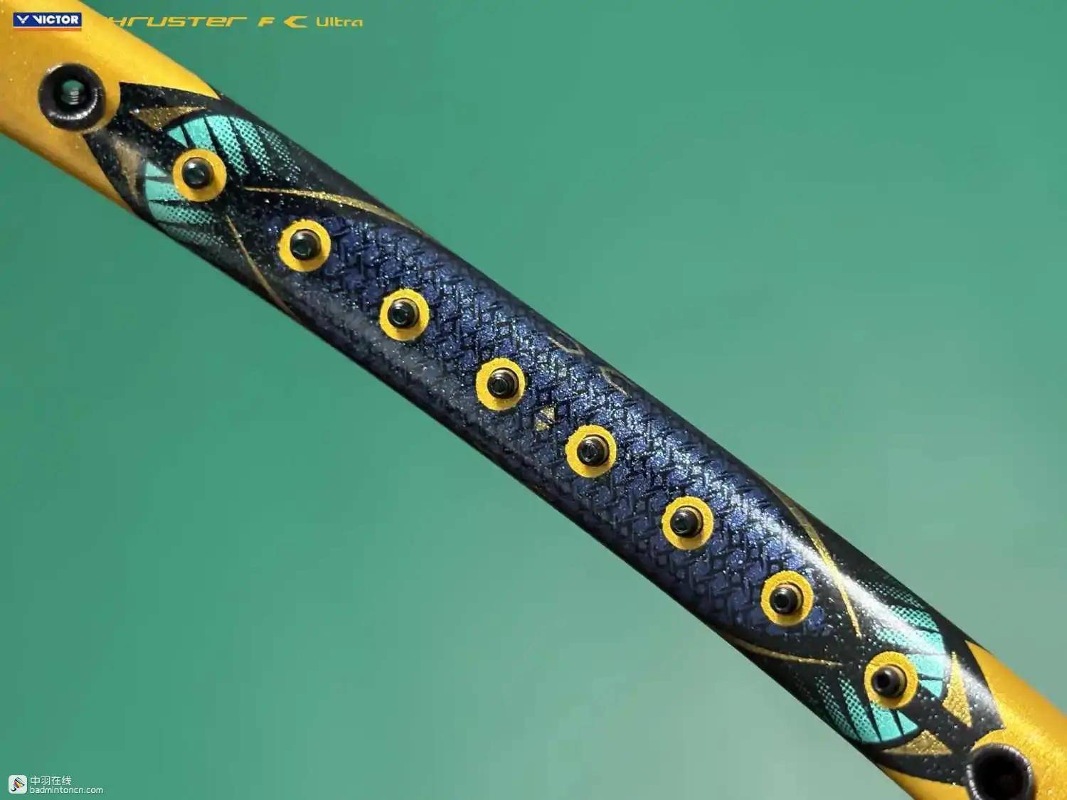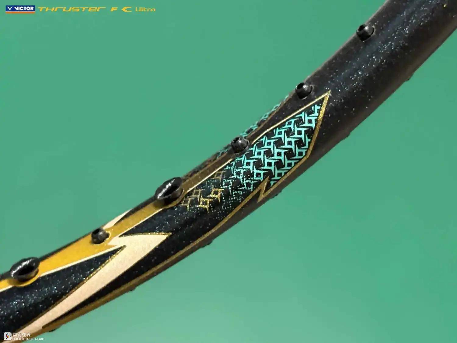 TK-F C Ultra的拍框采用非对称式涂装设计,走出了一条不同于前代的路线。拍框上下部分以金色作为底色,而两侧则过渡到黑色。值得一提的是,两侧的黑色漆水也暗藏细节,在光照下仔细观察,其表面闪烁着暗绿色的光泽,显得深邃而大气。