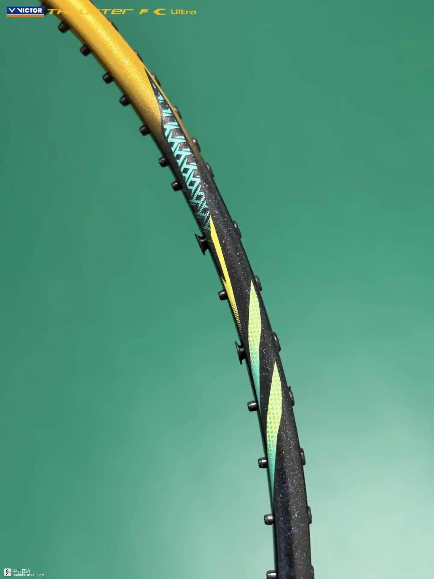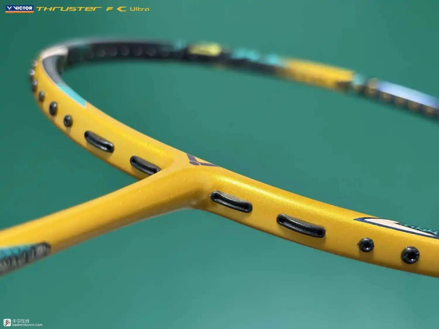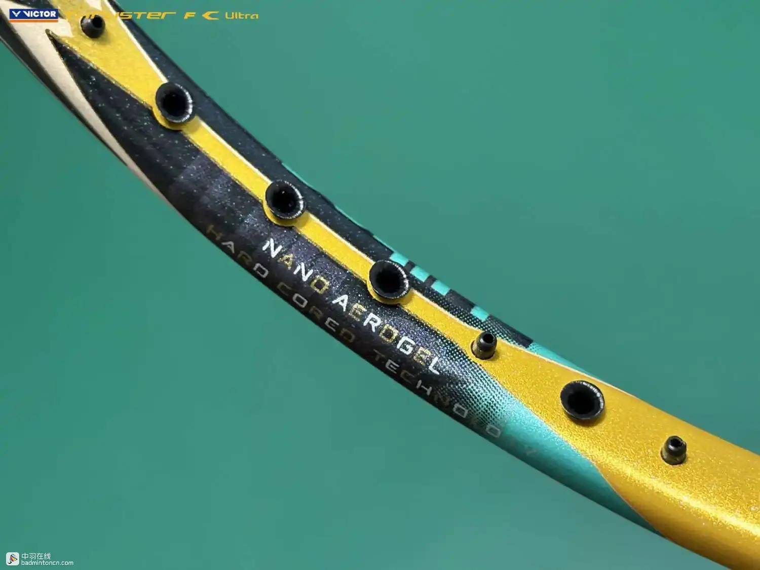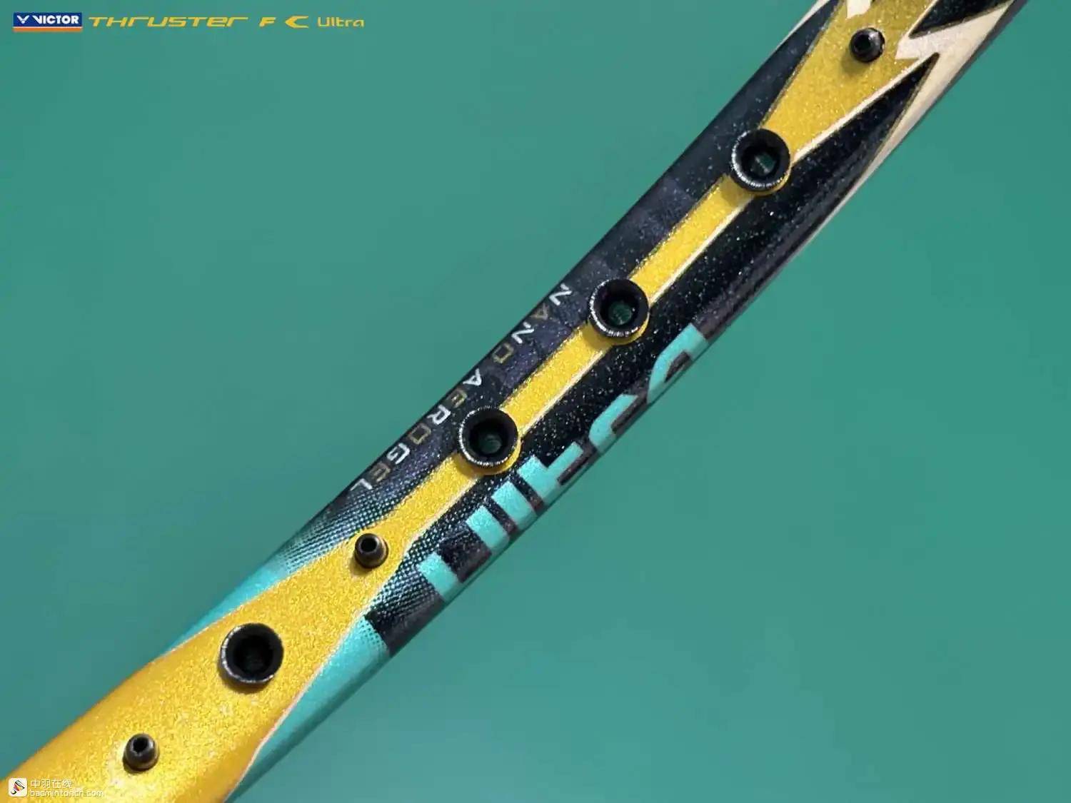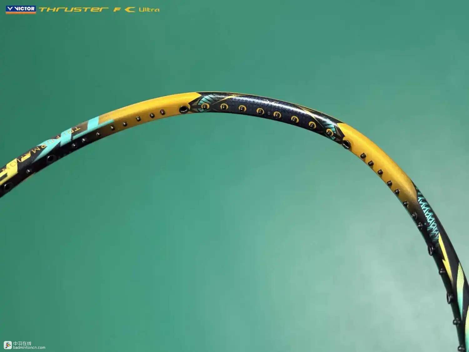 TK-F C Ultra的拍框采用非对称式涂装设计,走出了一条不同于前代的路线。拍框上下部分以金色作为底色,而两侧则过渡到黑色。值得一提的是,两侧的黑色漆水也暗藏细节,在光照下仔细观察,其表面闪烁着暗绿色的光泽,显得深邃而大气。