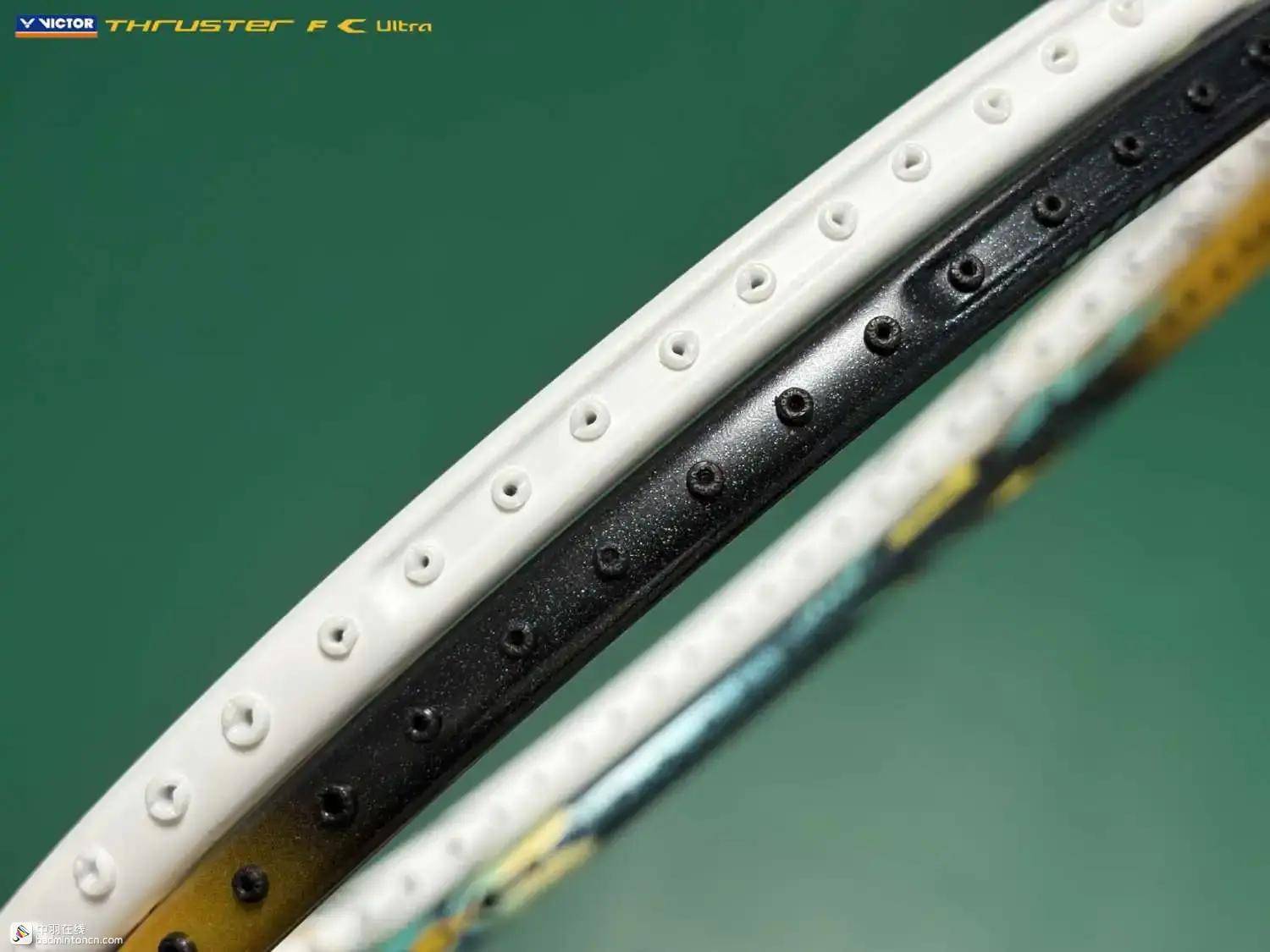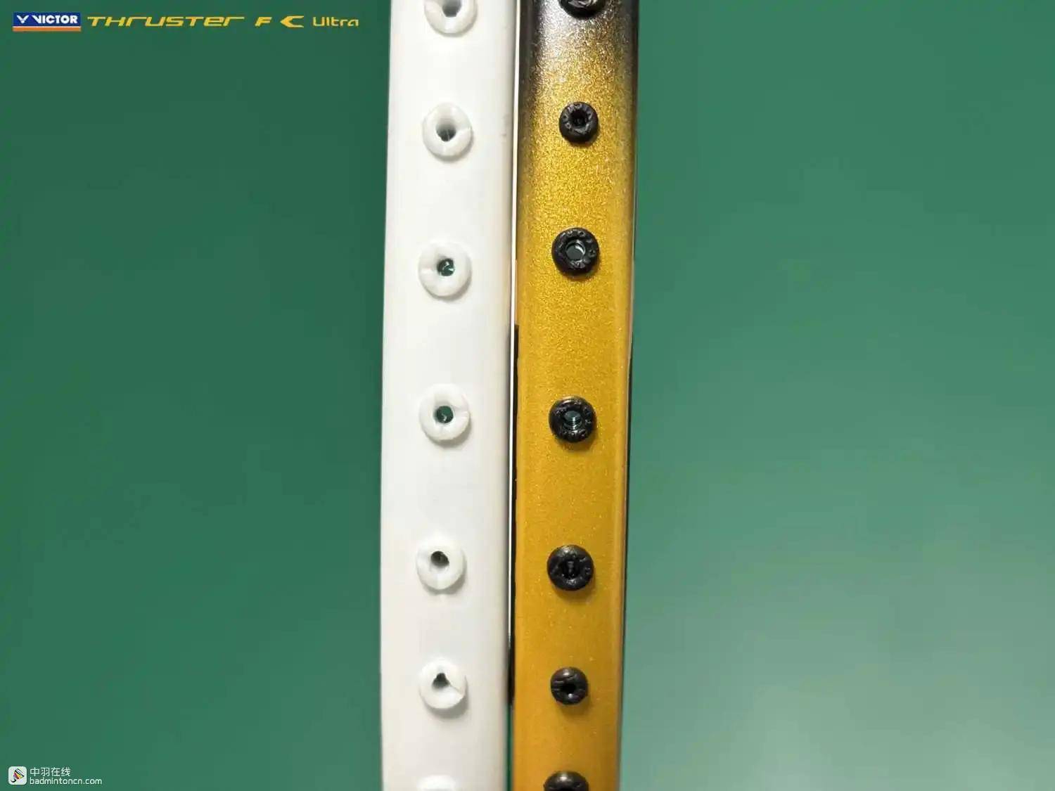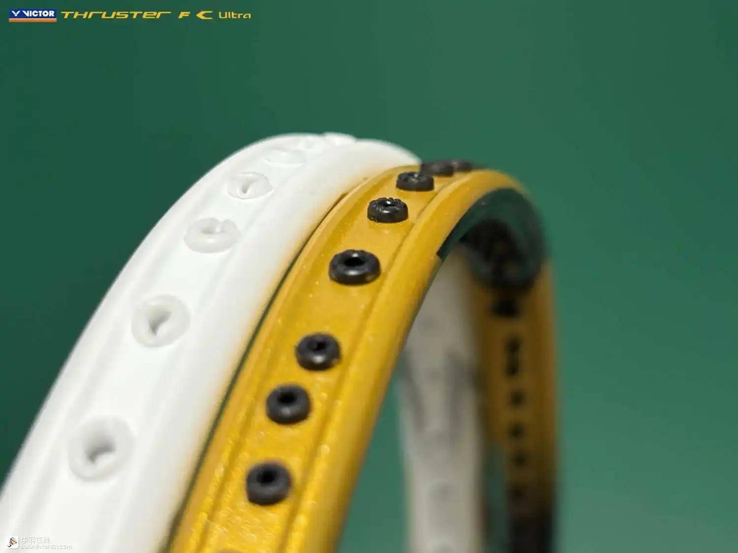 另外,不同于TK-F CLAW LTD的一点在于,TK-F C Ultra拍框外侧的线槽要略短一些,其起始位置相较于TK-F CLAW LTD上移了五个线孔的距离。