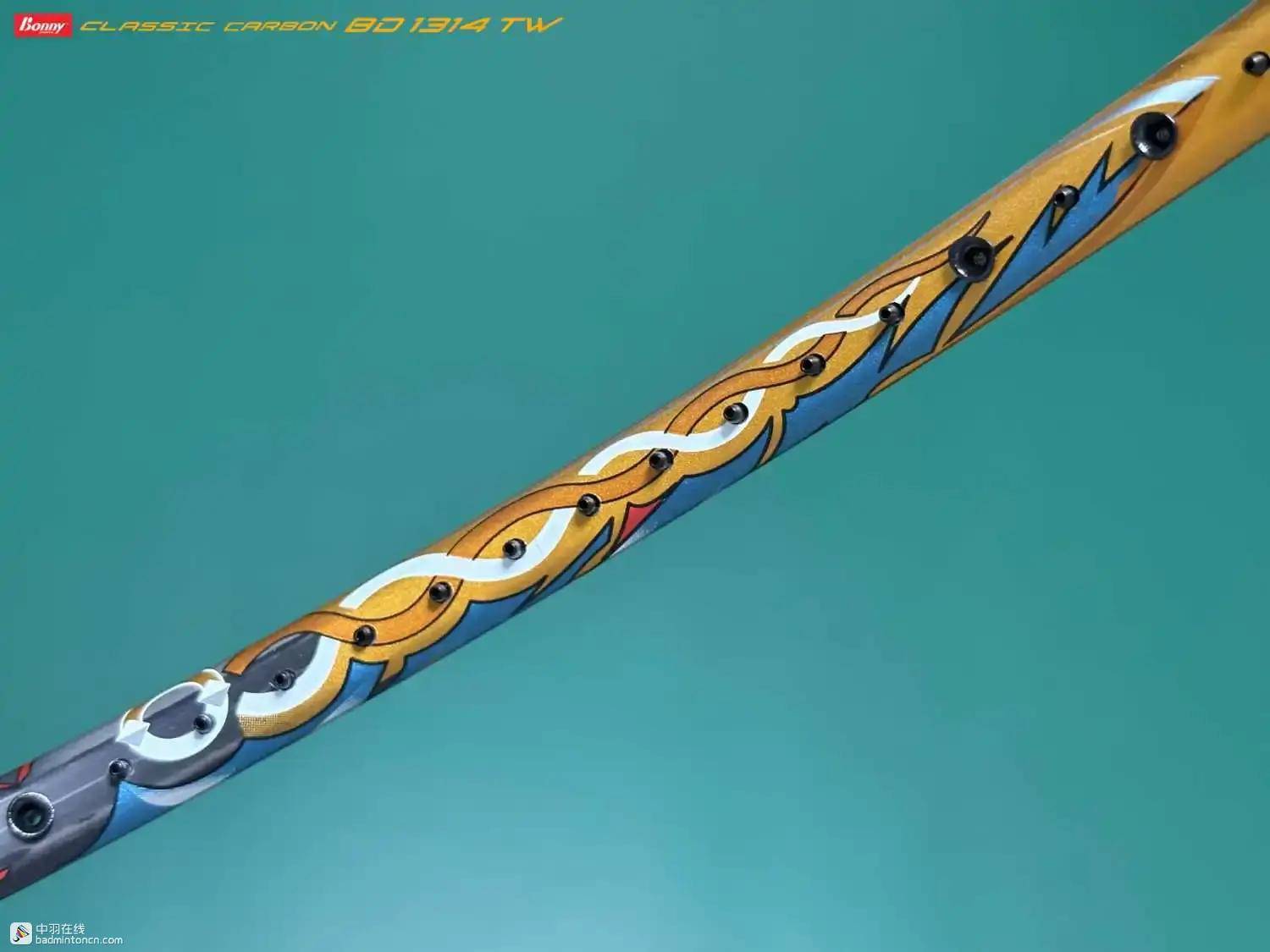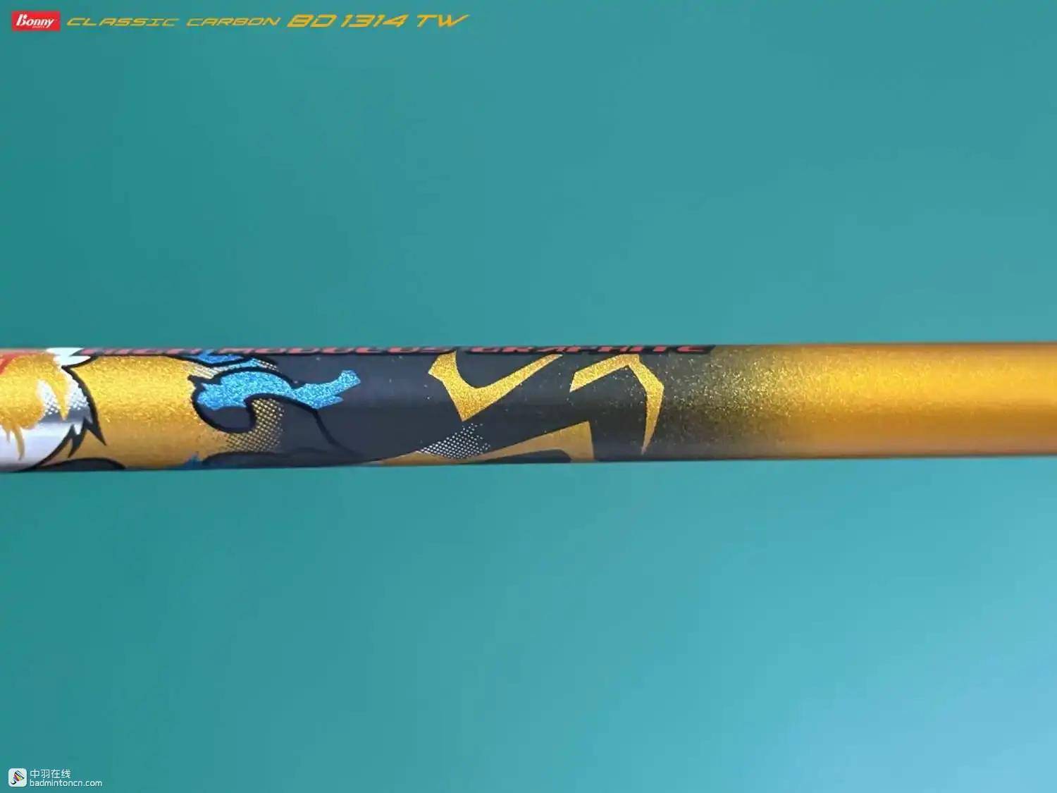乌缺虎翼的中杆以灰黑的碳纤维本色为主,末端才逐渐过渡到锥盖的金色。和拍框一样,中杆也采用了两面不同色的设计,一面有金色和白色搭配组成的犹如剑锋的图案,凌厉感十足。