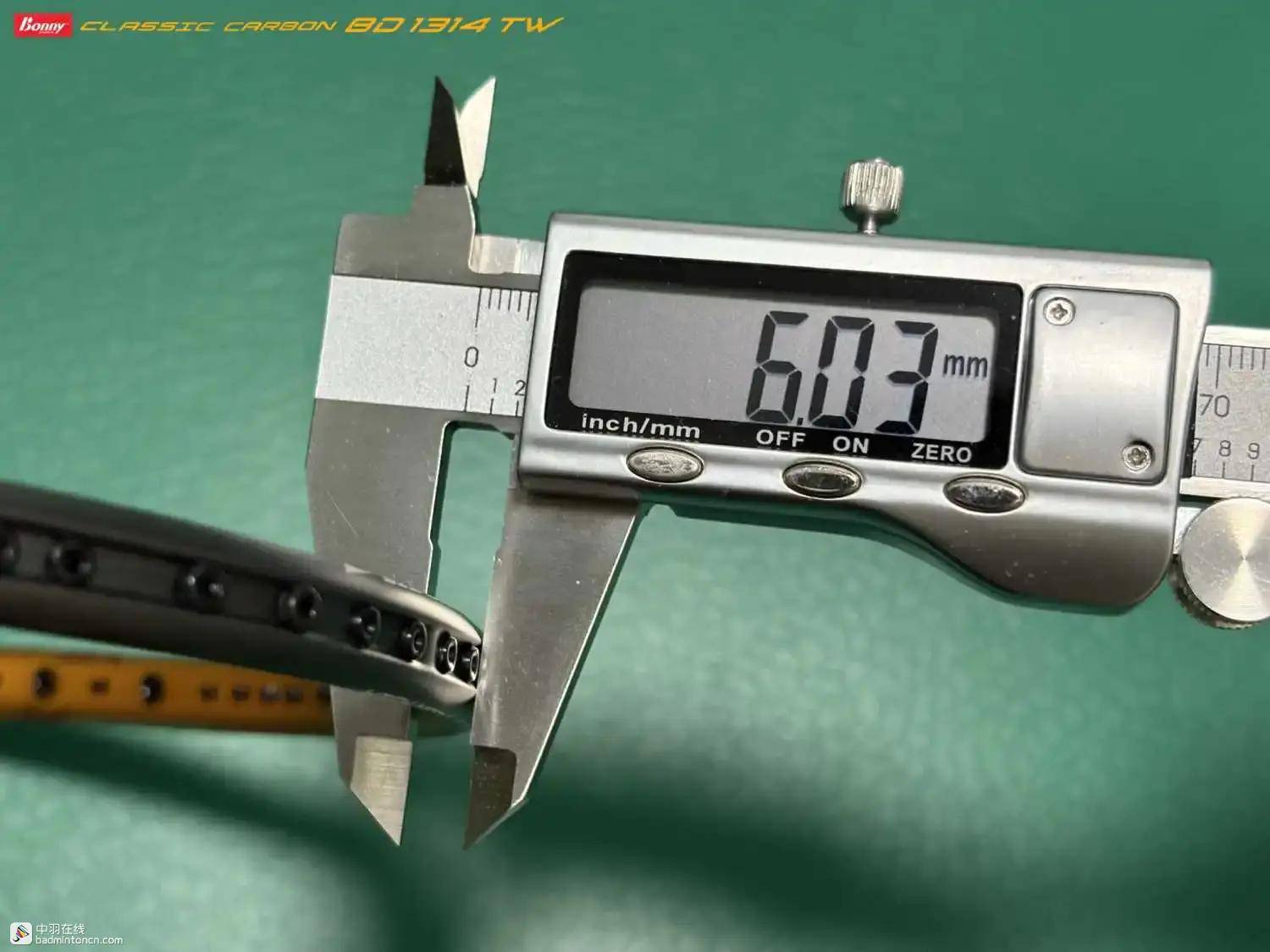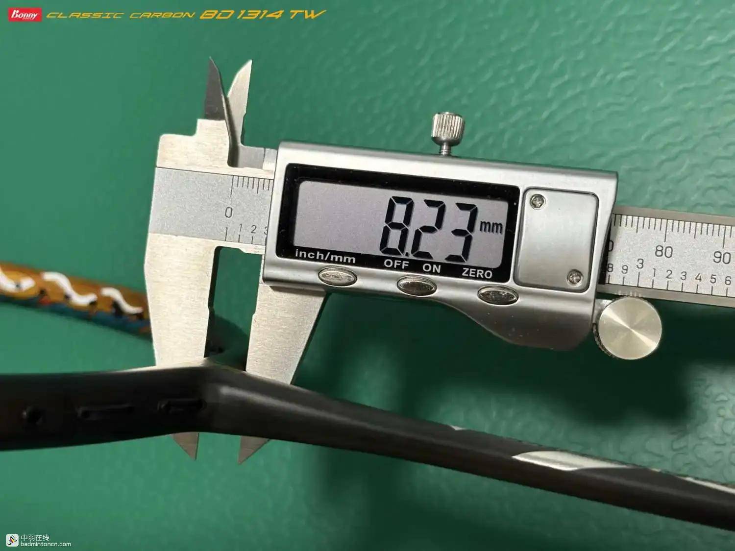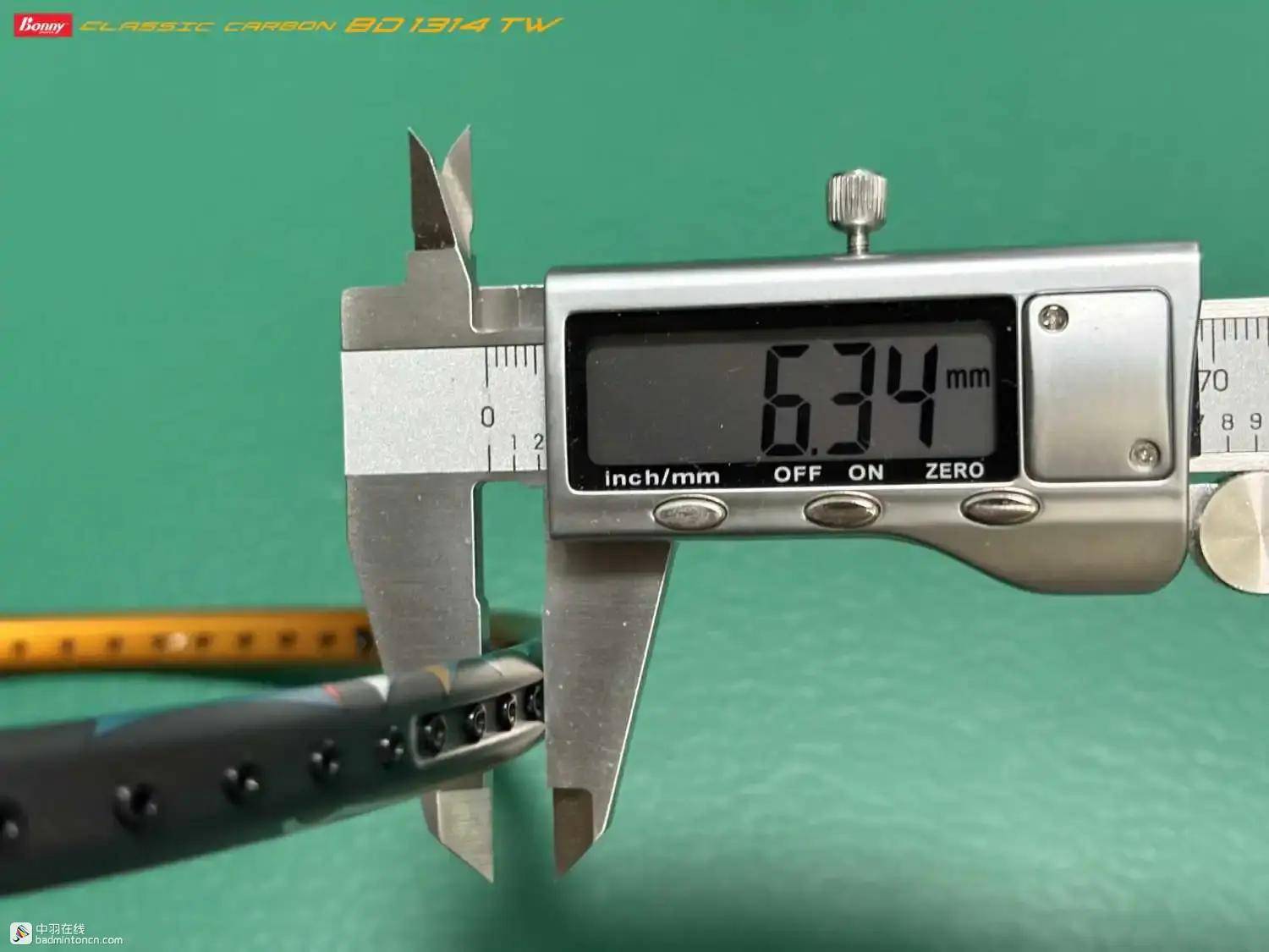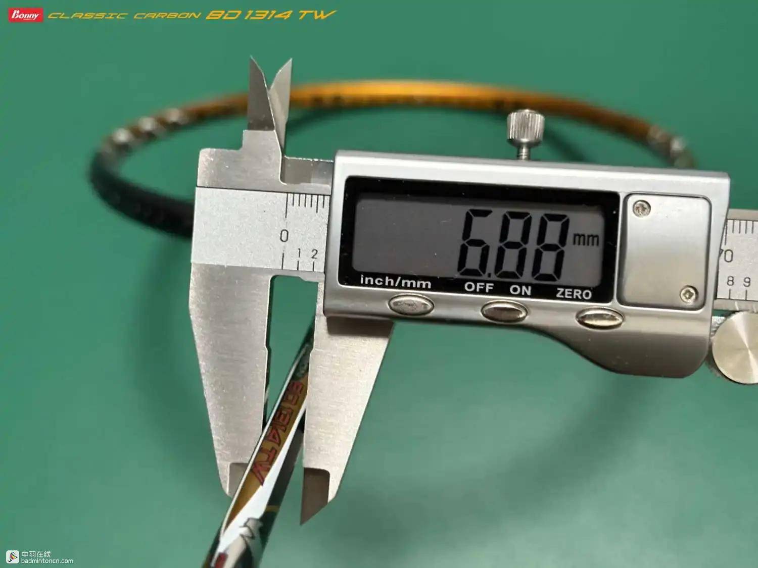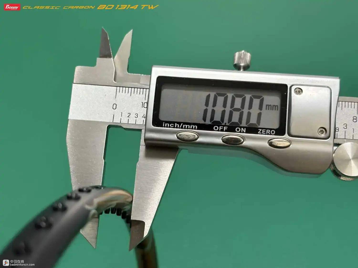 乌缺虎翼采用6.8mm镍钛丝高弹中杆,实际测量得中杆外径约为6.88mm。可见乌缺工艺下的漆水是很薄的,最大限度发挥碳纤维材料原本的击球手感。