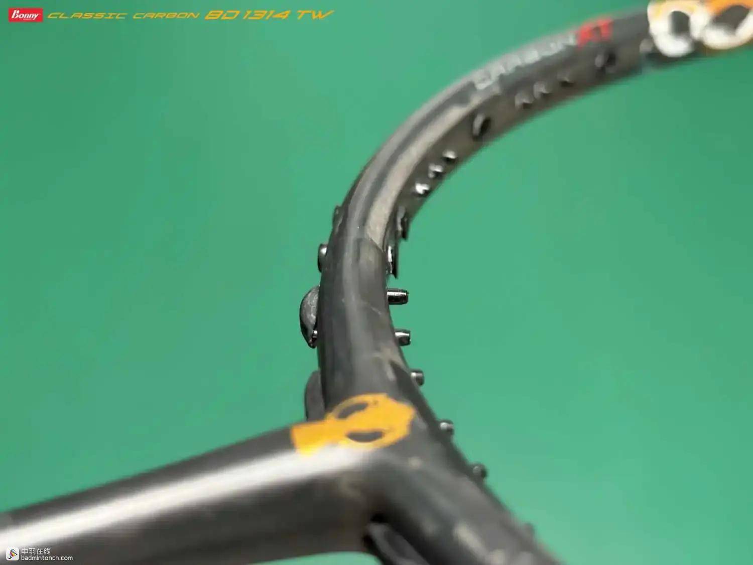 乌缺虎翼全拍均采用破风式拍框,三通附近的框型截面要稍微圆润一点,而越接近顶部则破风结构越锋利。
