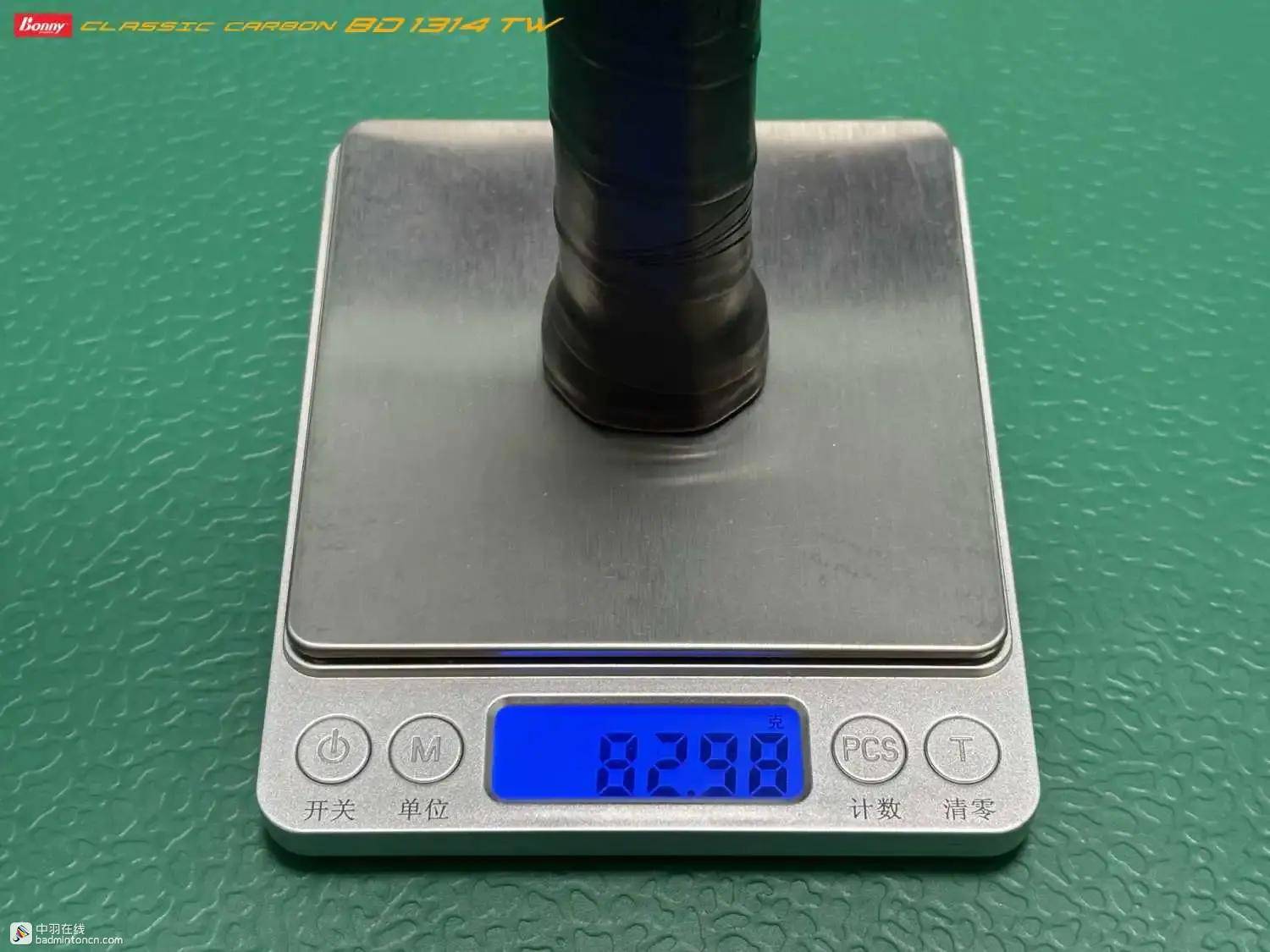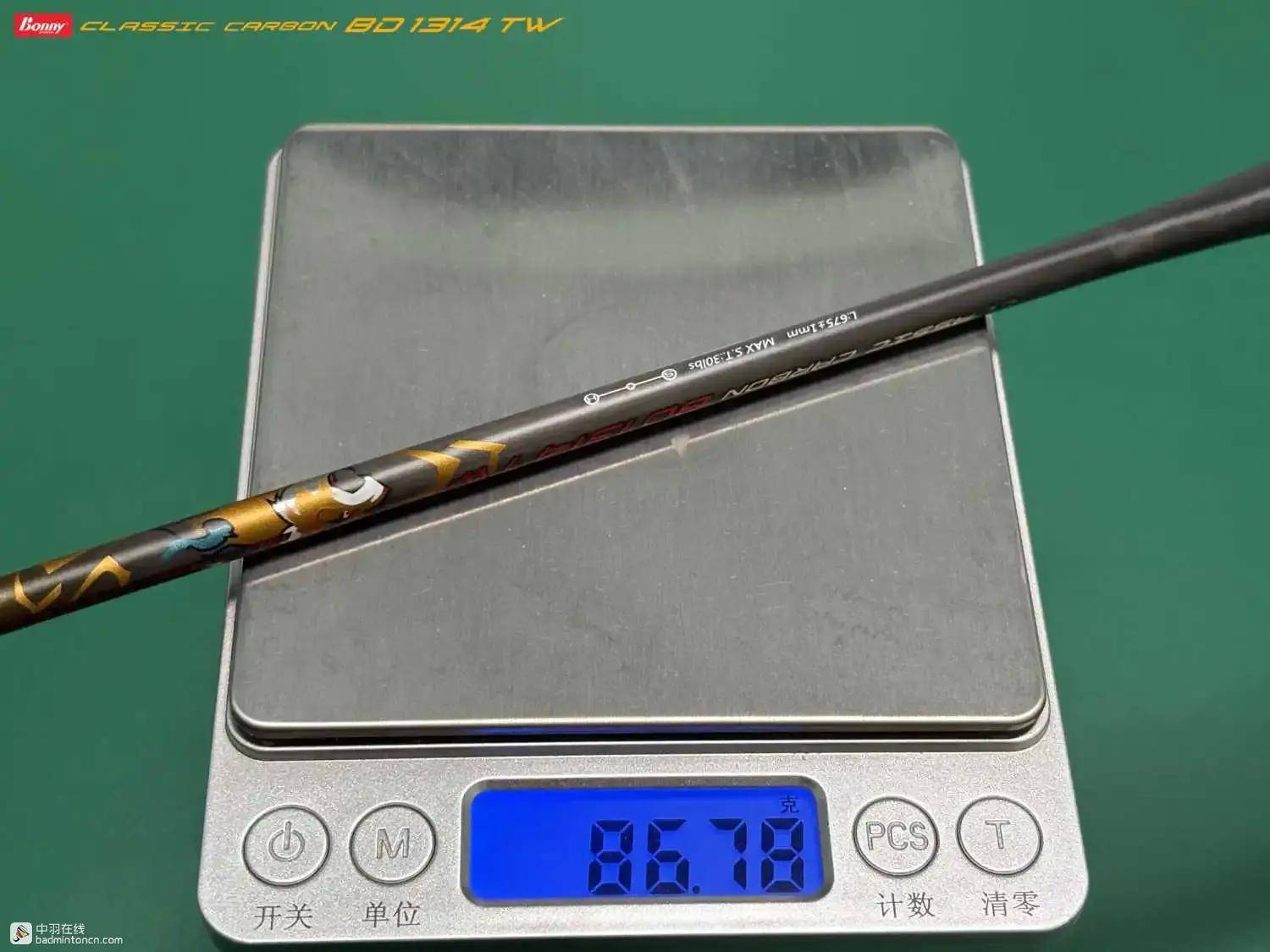 上线(李宁N65线,26磅)和手胶(缓震膜+李宁GP201手胶)之后,总重约为86.78g,平衡点则约为302mm。