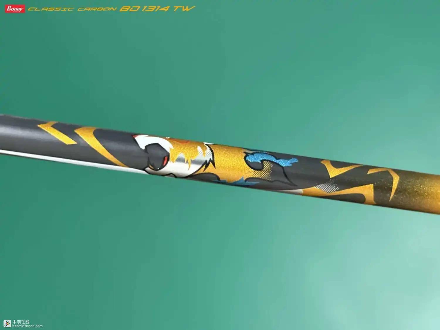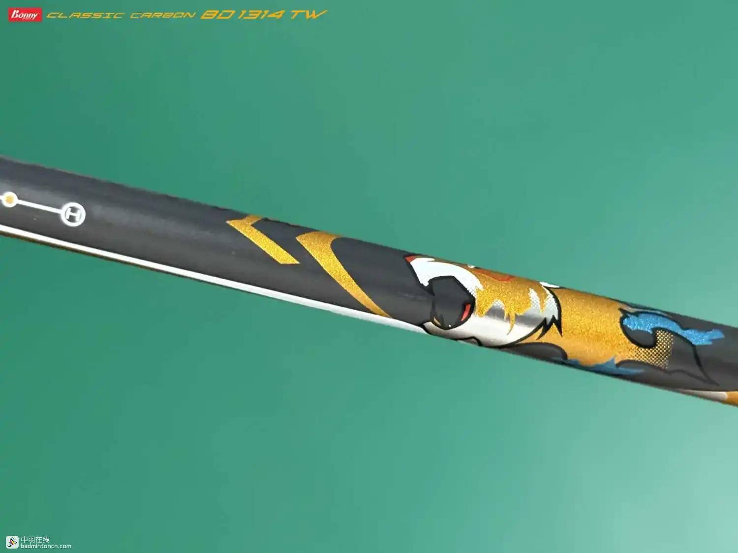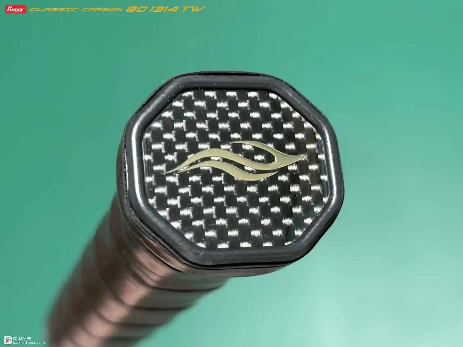 乌缺虎翼搭配了金色锥盖,正反两面皆有银色亮面波力LOGO。同时手柄底部采用了碳纤维搭配金色LOGO的底盖。