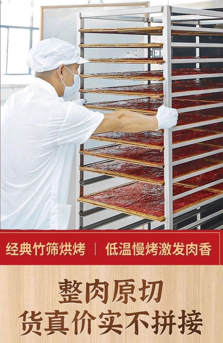循环烘烤🔥10小时熏焙工艺中高温很好的烤出猪肉本身少量的油脂,将好味道锁在肉里撕开时纹理清晰丝丝分明肉质香韧而不硬,不用太过费力就能轻易嚼开每一口肉脯都莹润焦香、咸甜可口满嘴都是香喷喷的肉味,完全停不下来💓