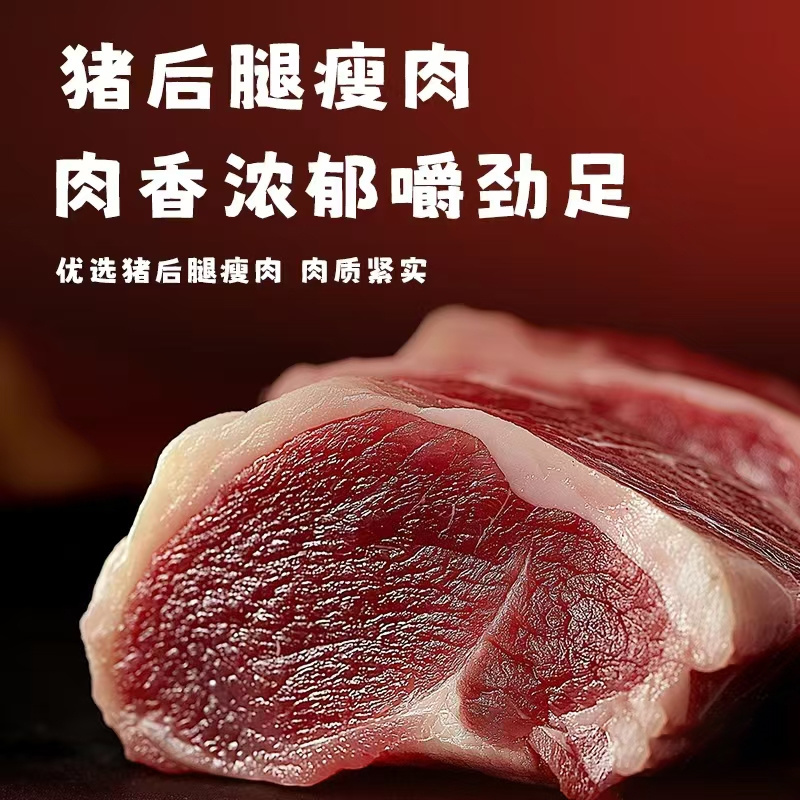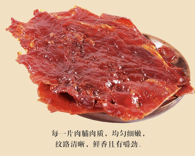 每一块肉脯都只选用优质猪后腿肉要知道每头猪只有约4千克的后腿肉不止选用猪后腿肉,且要剔去皮、膘、筋骨取整块纯瘦肉为原料,所以肉质香韧而不硬