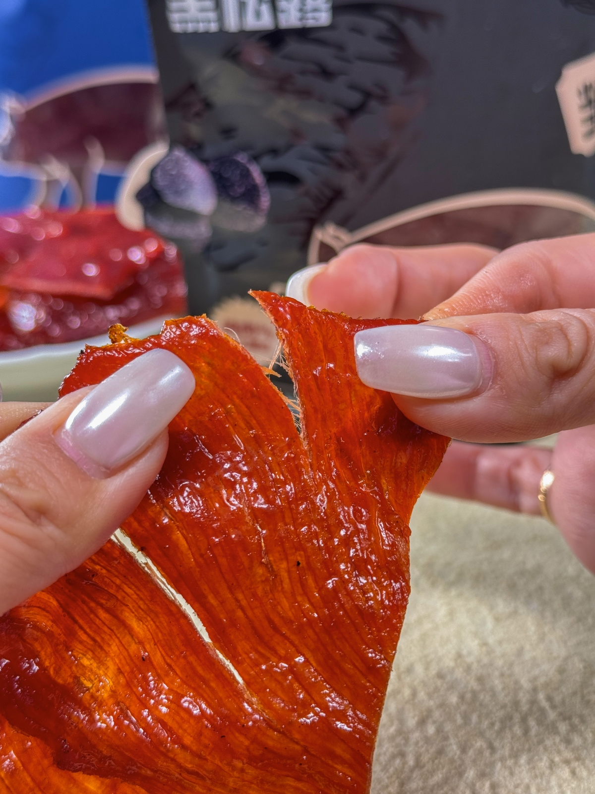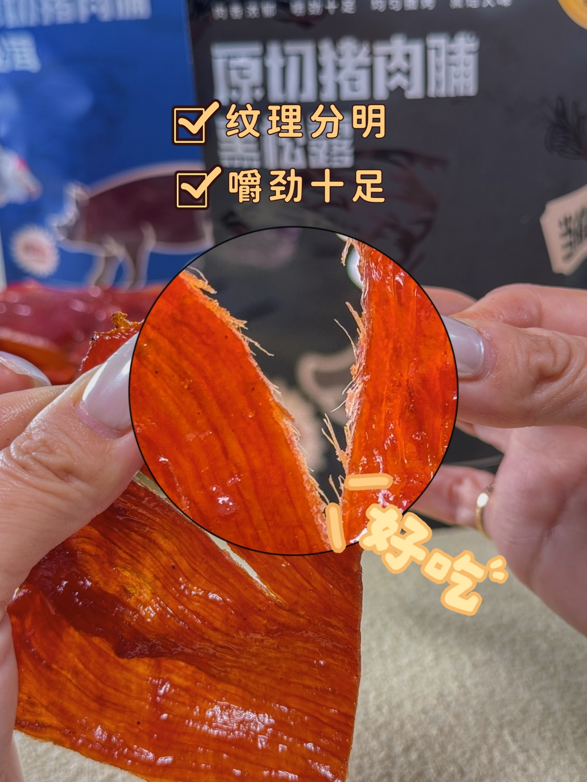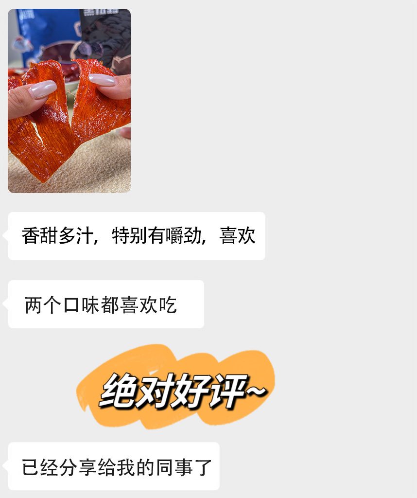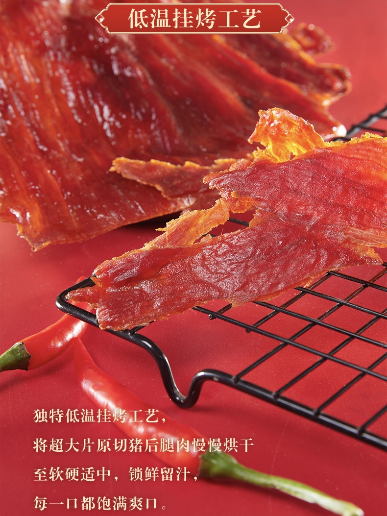自然纹理不修边,凝聚“鲜味与嚼劲’软硬适中,大片才够味色如玛瑙红玉之艳,甜辣鲜香,肉质绵密带劲每一日都给挑剔的味蕾带来一丝惊喜🎉不像市面上的肉脯,添加剂太多,根本吃不到“肉味”我们的猪肉脯跟其它肉脯一对比入口👄更是惊艳味蕾,韧而不柴,饱满有嚼劲