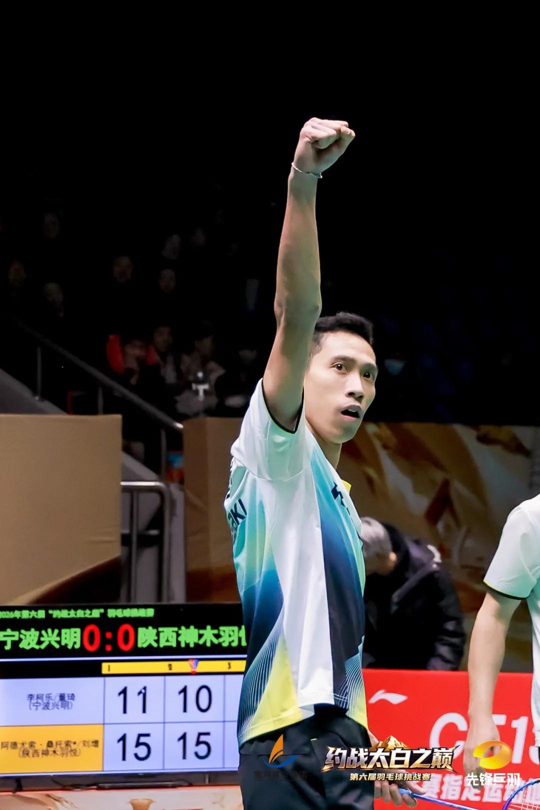 首盘第一男双对决,深圳明羽康泰的黄炜浩/孔国旗以15:10先赢一局。第二局中,陕西神木羽悦的阿德尤索·桑托索/刘增以15:9扳回一城。决胜局比分持续胶着,神木羽悦在落后的情况下将比分追至13:11,此后深圳明羽康泰发起普通挑战,神木羽悦则使用了王牌挑战并挑战成功,比分随之反超为14:13,最终神木羽悦以16:14拿下该盘,取得开门红。