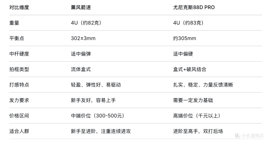 网上很多球友说箭速有点像尤尼克斯的88D PRO,我查了不少资料,也问了一些打过88DP的朋友,简单整理了一个对比: