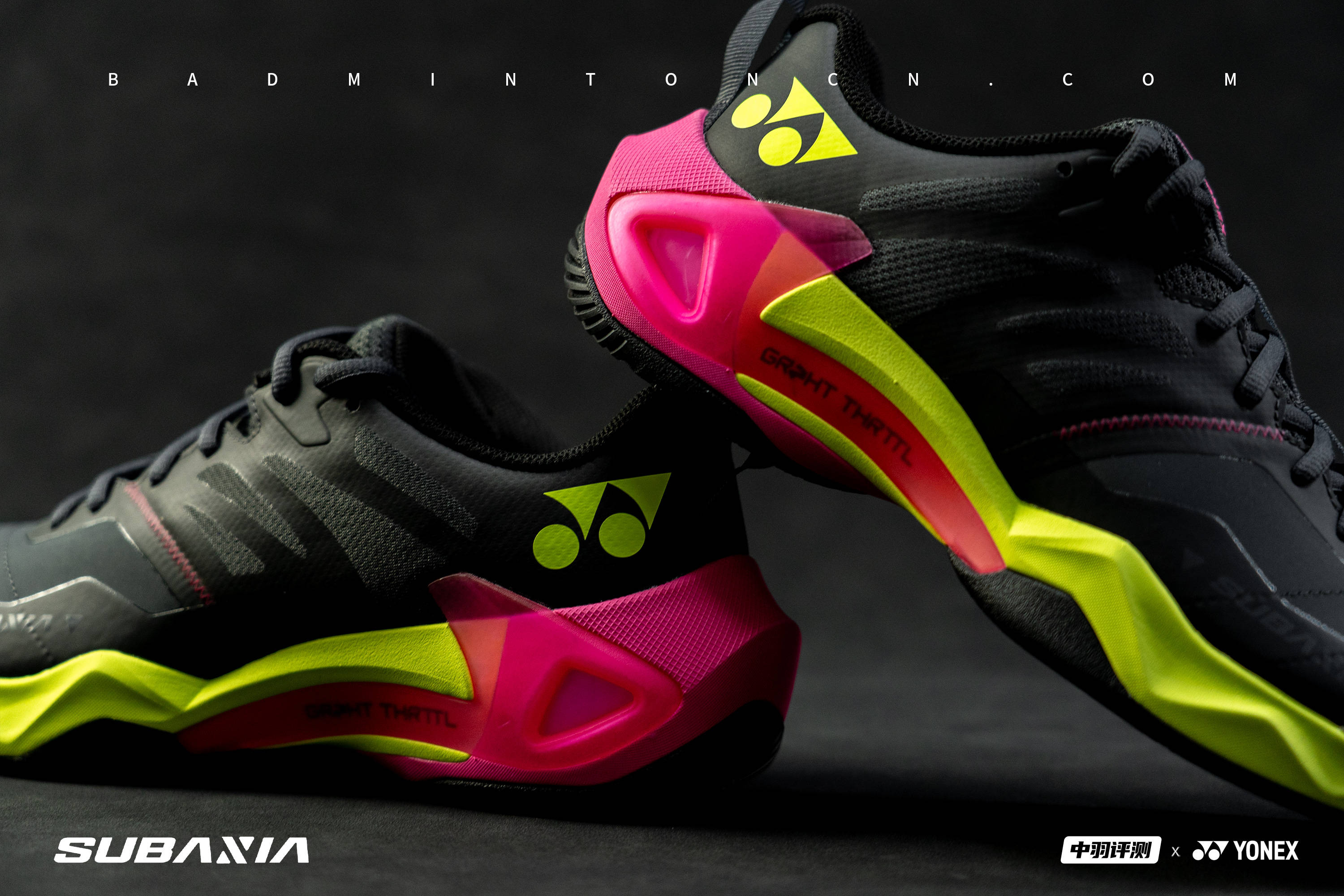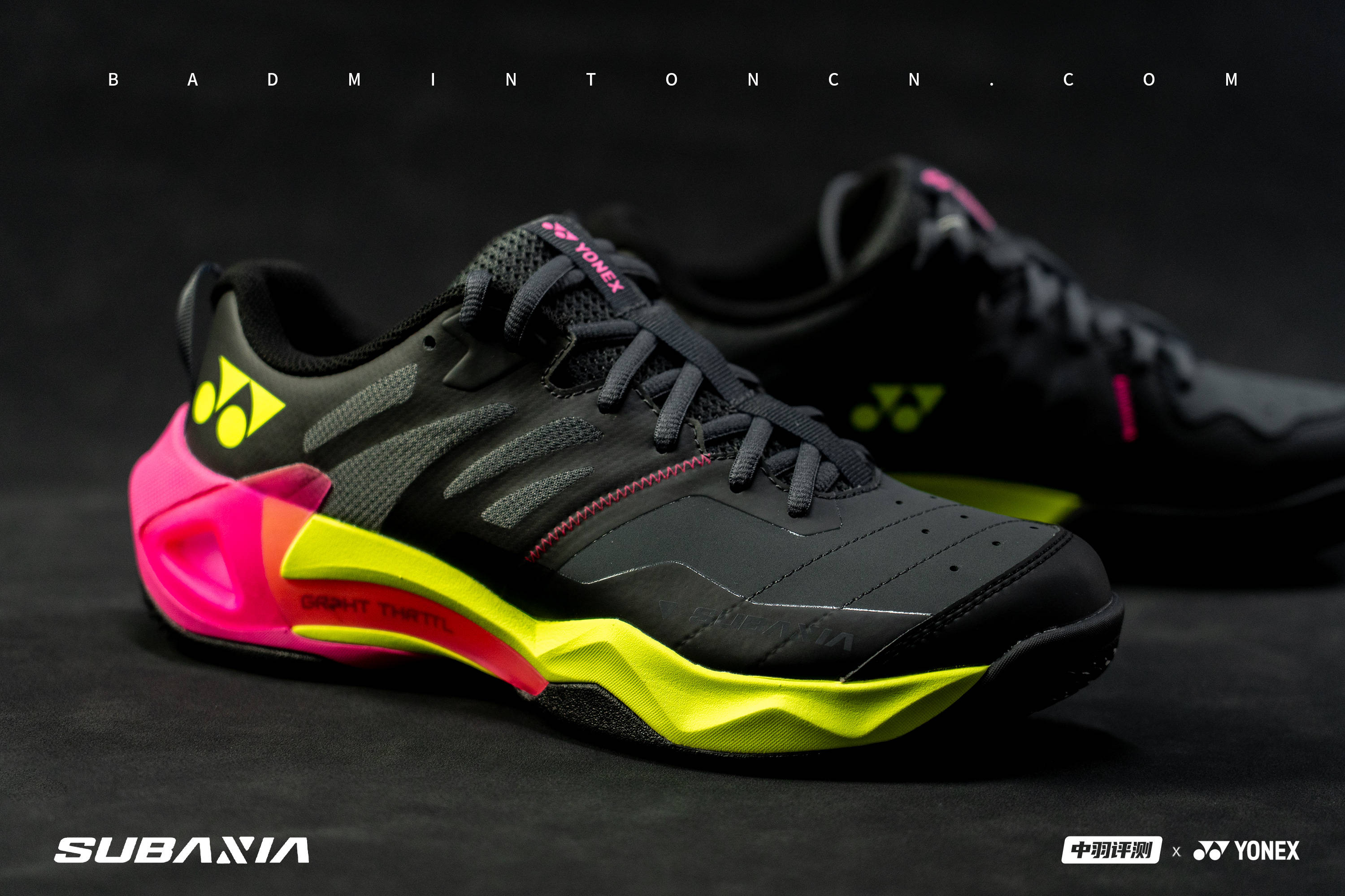SUBAXIA GT作为YONEX基于Grpht Thrttl 概念打造的全新旗舰系列鞋款,外观延续品牌一贯的简约格调,中底吸睛的撞色设计,呼应了此次“步步制胜”的竞技精神。配置层面,SUBAXIA GT是YONEX 设计最复杂的旗舰鞋款之一,双动力垫 REV (发泡材料)+双动力碳素,再辅以外侧支撑墙的加持,意在诠释稳定与速度爆发力的双向融合。