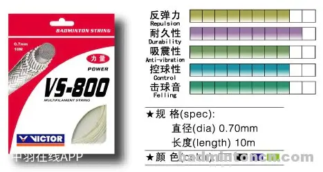 最近用过的那款是VS800,搭载在脉动95 control上,老拍配老线。线径0.7mm,怎么看都是耐打的款,实际上在线材的包装上官方给到的参数中也确实是耐打稍微突出,但包装对VS800的定位却是力量。倒也能理解,毕竟目前这个线径的产品里除了空弧和VBS70P以外,笔者还没有遇到上了高磅之后杀球还杀不爽的产品。