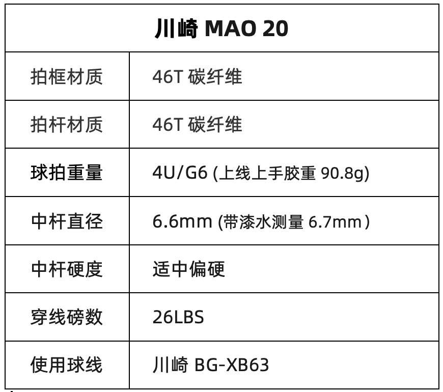 矛20为盒式拍框设计,空拍状态下可以感受到拍框的分量,因此本次测评在未去底情况下上线上手胶,搭配是川崎的BG-XB63线,从各项目多场次多应用场景进行测试,主观总结体验如下。