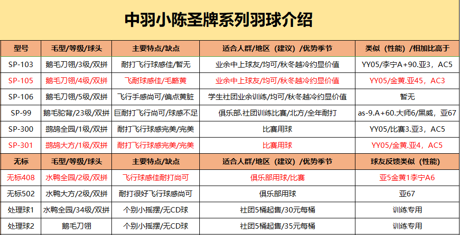 降低球耗的耐打款:sp99变态耐打,飞行也还不错哦。精选鹅毛驼背毛片类似yyas-9,胜利大师6.竞品主要为亚狮龙6号7号耐打度sp99大于1.5倍亚狮龙6号7号。售价63元。