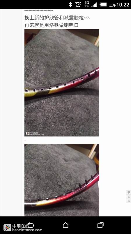 压合式: 优点:操作快速,方便 缺点;喇叭口成型后,也很容易滑动~~ 操作不当,很容易把拍框挤压受损~~ - 烙铁操作: 优点,护线管能紧实的贴合在拍框线孔上,更实用 缺点:耗电/烫伤/作业时间较长 - 合照 -- 大叔用的是高周波烙铁 - 野鸡大叔要介绍的是高周波烙铁的优势~~~ 【护线管-二篇】放了几张喇叭口成型的照片 实用和保护功能性都有最佳的效果~~~ __ 如果再加上美观呢??? 这才是装逼烙铁该有的表现~~~ - - - 或许有朋友会问,用平价大众也可以达到这样的效果 甚至有些的专门用在做喇叭口的特殊烙铁头, 很类似将冷作业压合式和热做业烙铁扩口结合为一的产品