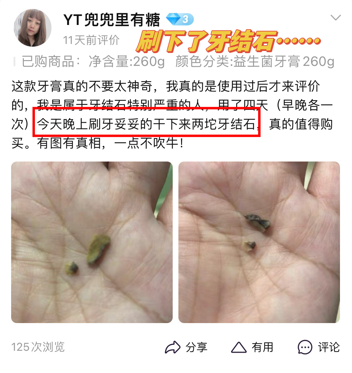 那益生菌的工作原理又是啥?益生菌是医学界与科学家公认的!有助于维持口腔菌群平衡的成分!通过减少细菌聚集、凝聚细菌“打包”送出口腔达到清除牙菌斑、防止牙结石的效果碧素堂益生菌牙膏优选乳酸杆菌(益生菌)每瓶260g容量有13亿益生菌含量,成分浓度非常的高!!!效果自然好!屏住呼吸……😑看一下我前几天刷下来的牙结石那味儿绝了……刚吃的饭差点呕出来🤮
