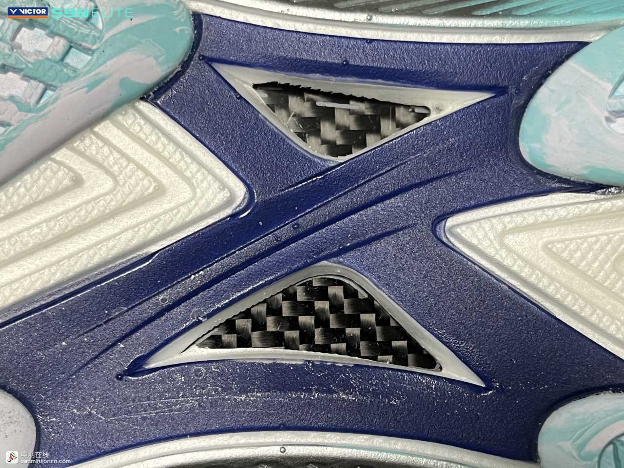 从底部的两个窗口我们可以直观看到这块大面积的碳板。而环绕其周的则是用于强化抗扭的硬质TPU。