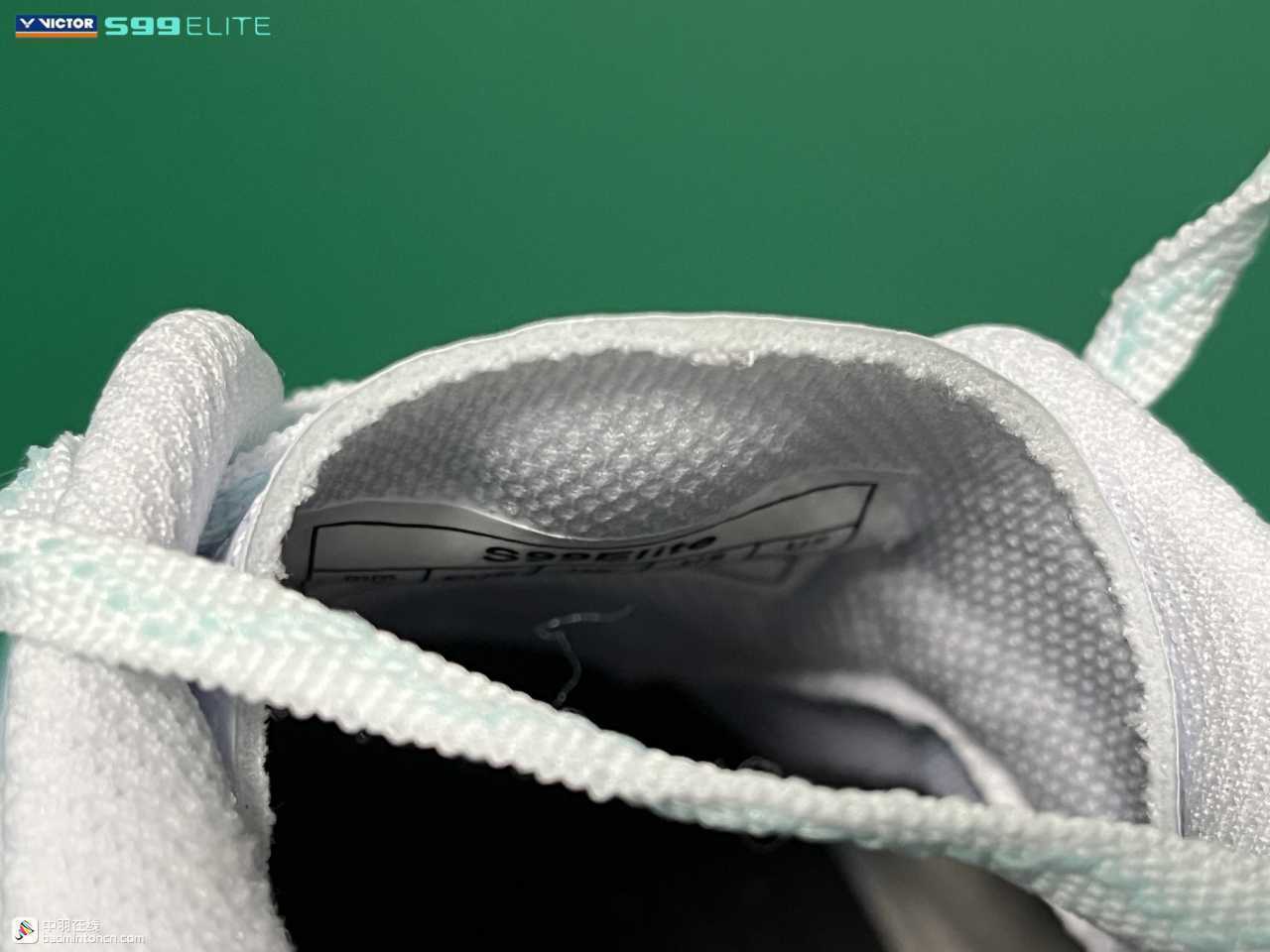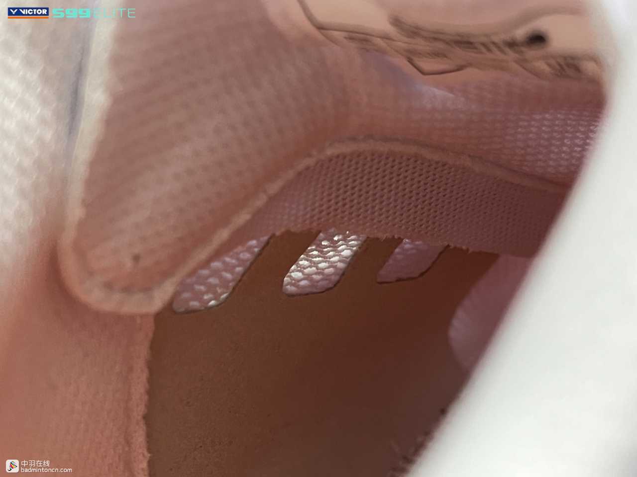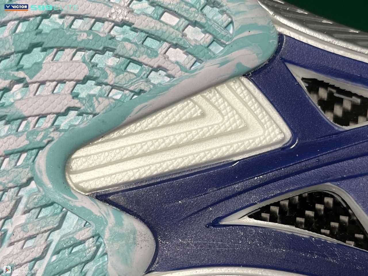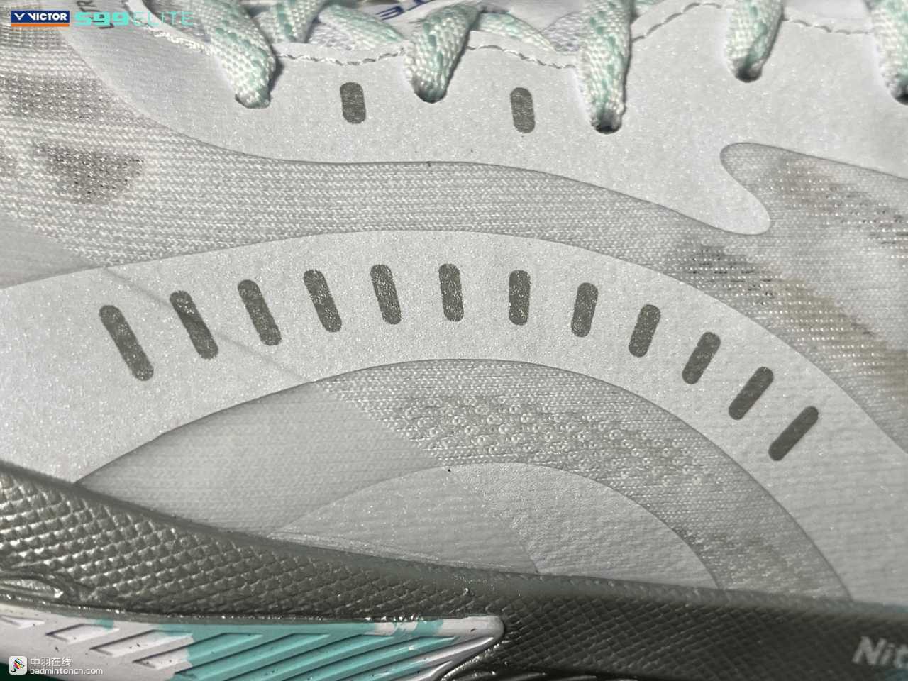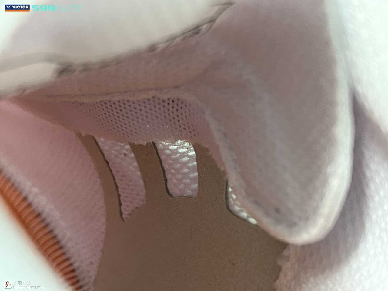 根据羽毛球步法的特点,S99 ELITE运用了“V-Durable+”鞋头高耐磨技术,在鞋头内侧的网布上包覆有耐磨TPU薄膜,来保证鞋的耐磨性能。不过这一层TPU非常薄,即使隔着它都能够清楚看到其下网布的纹理。