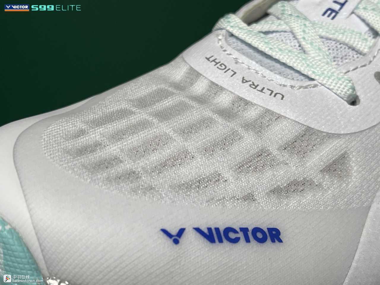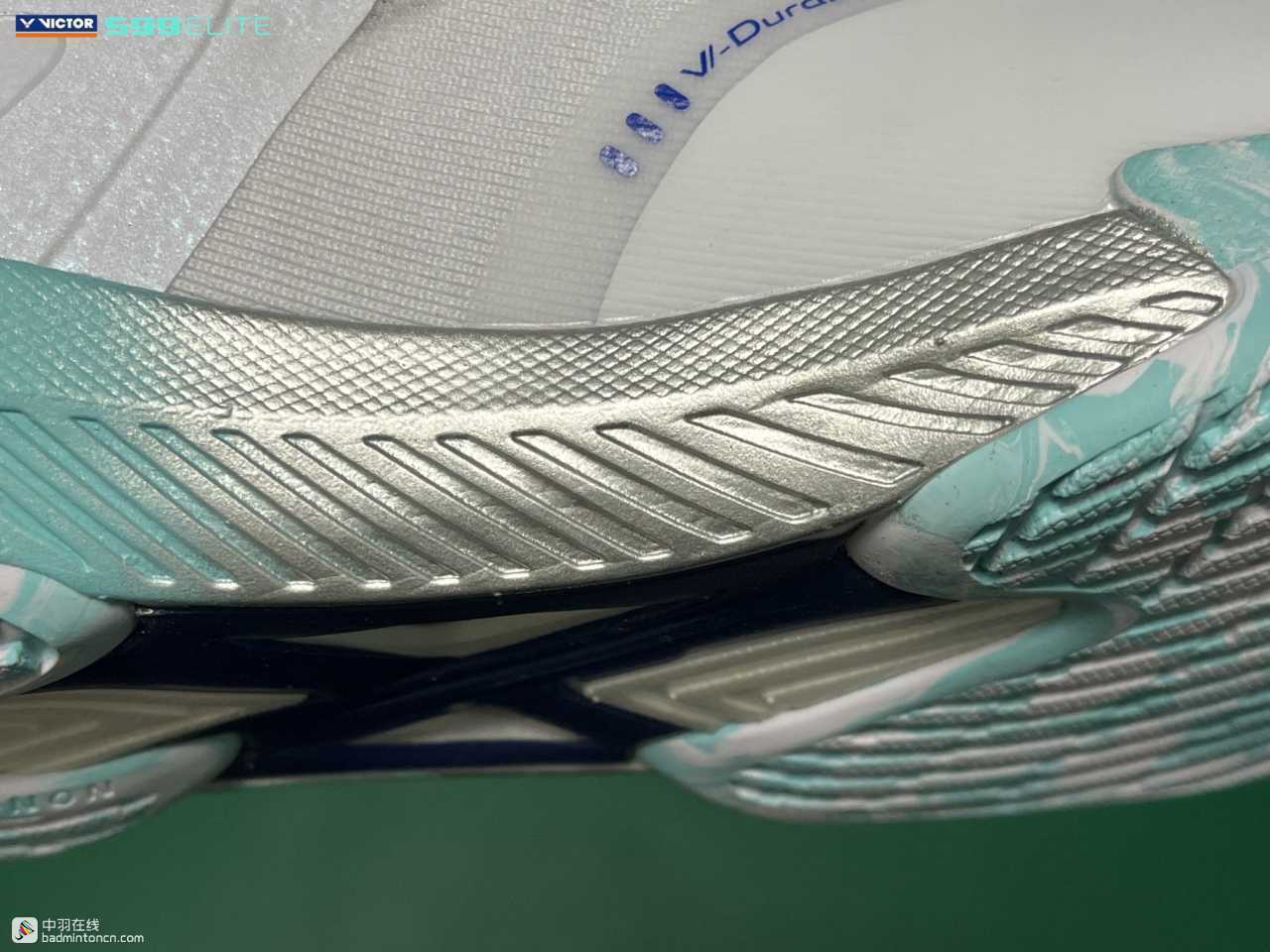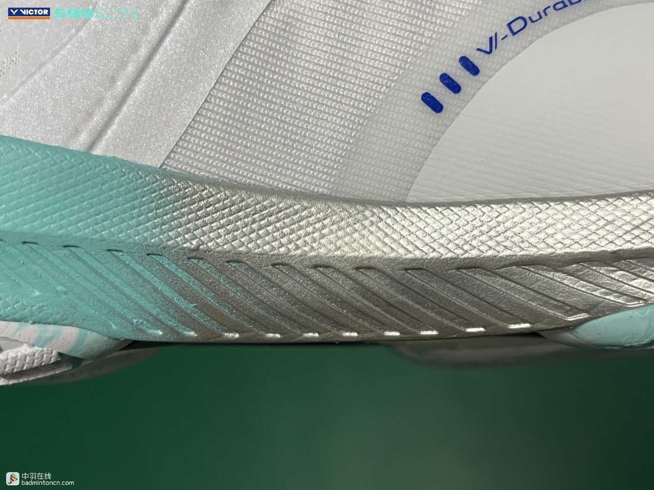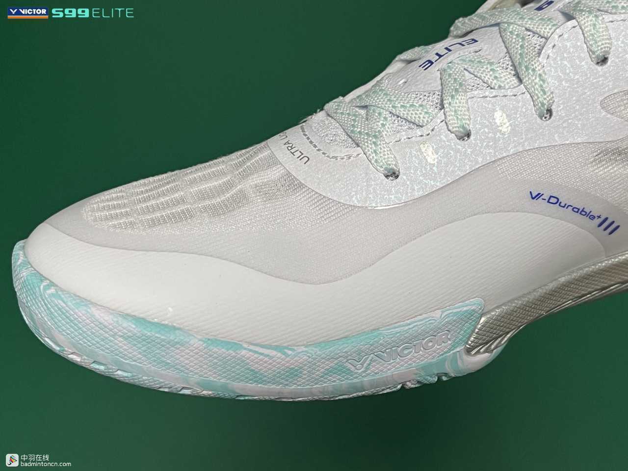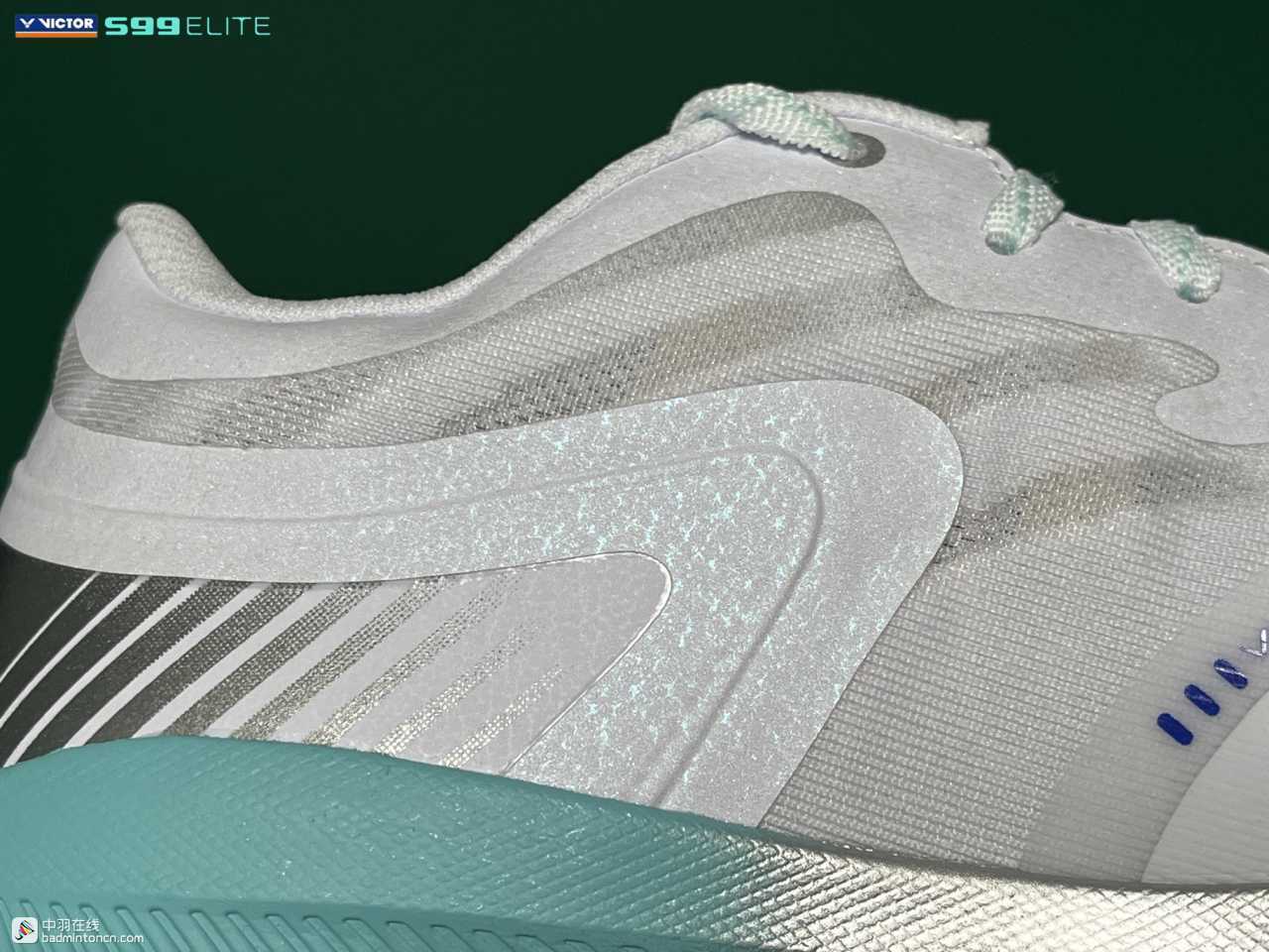 根据羽毛球步法的特点,S99 ELITE运用了“V-Durable+”鞋头高耐磨技术,在鞋头内侧的网布上包覆有耐磨TPU薄膜,来保证鞋的耐磨性能。不过这一层TPU非常薄,即使隔着它都能够清楚看到其下网布的纹理。