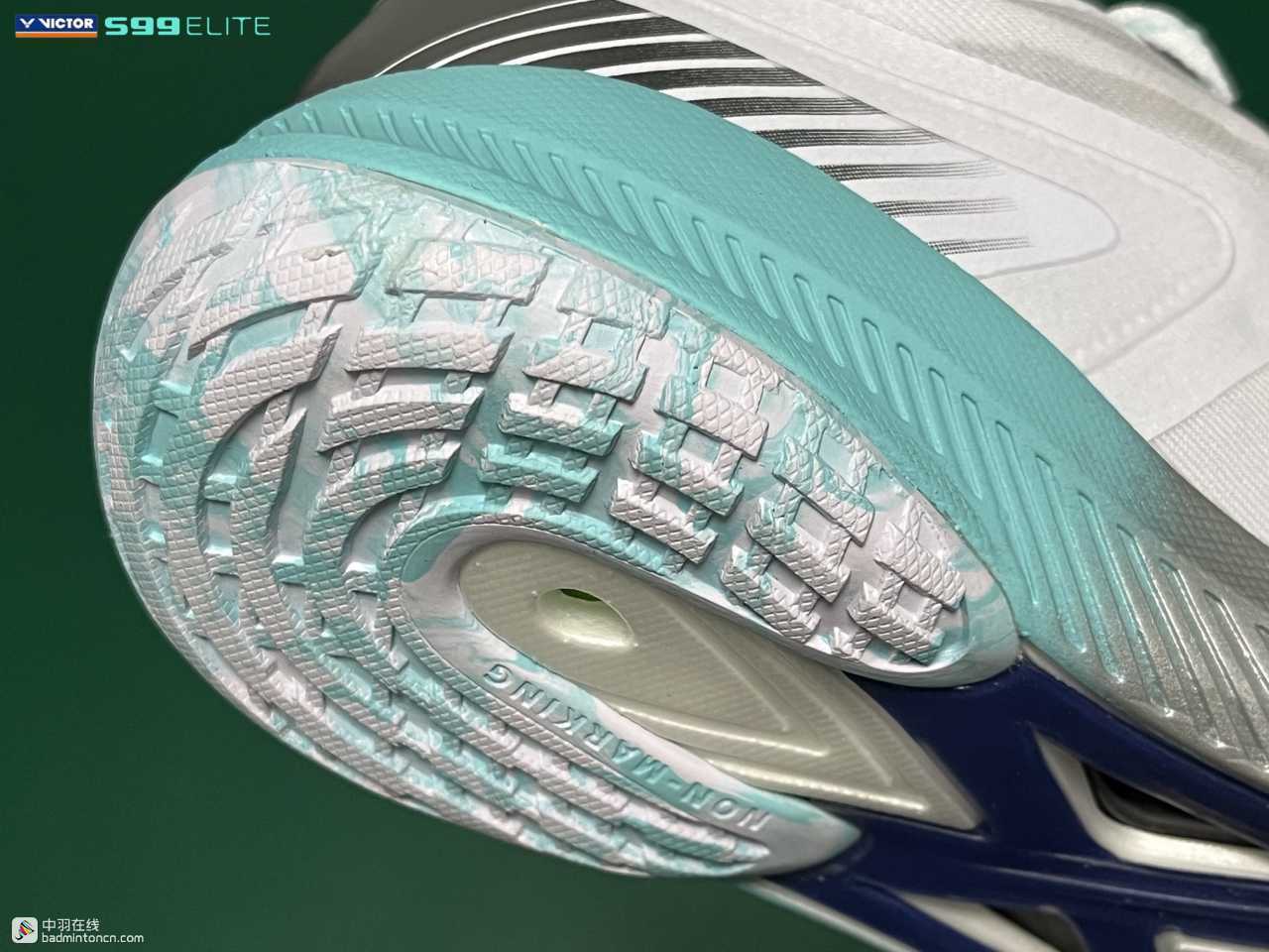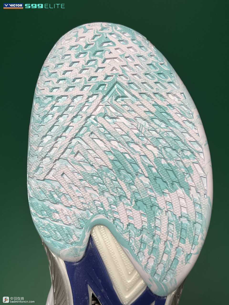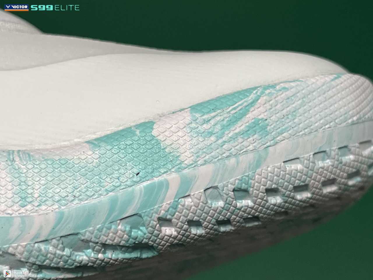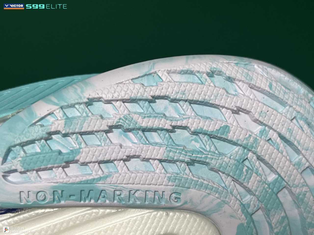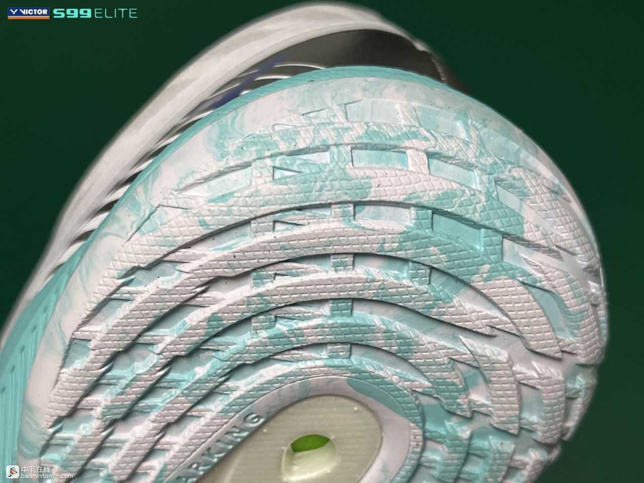 S99 ELITE的大底采用了实色橡胶,白色和湖蓝色相互融合,如同湖蓝色的墨在水中渲染开来,形成了一幅淡雅清新的水墨画。