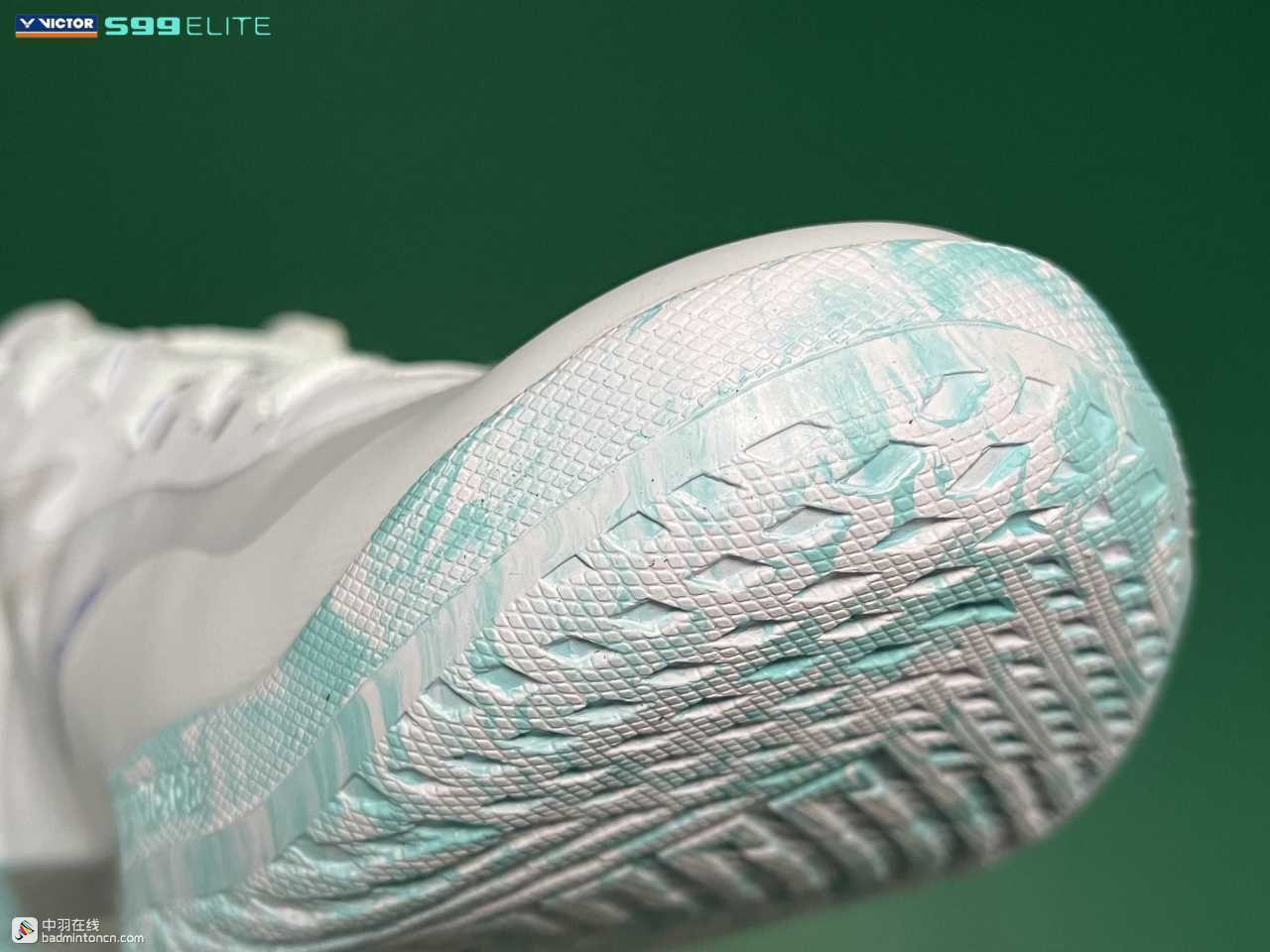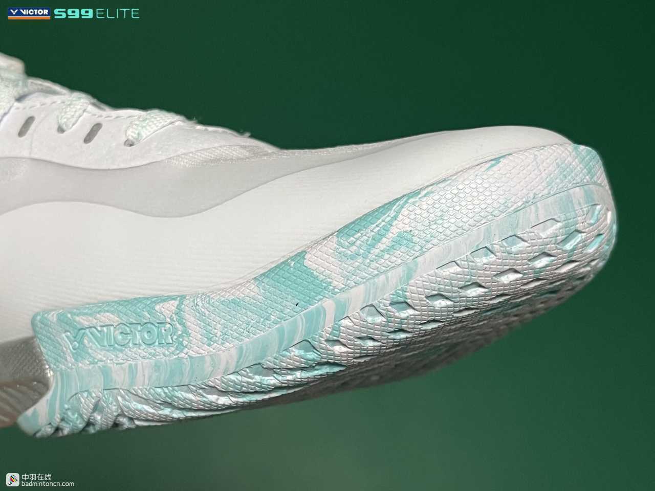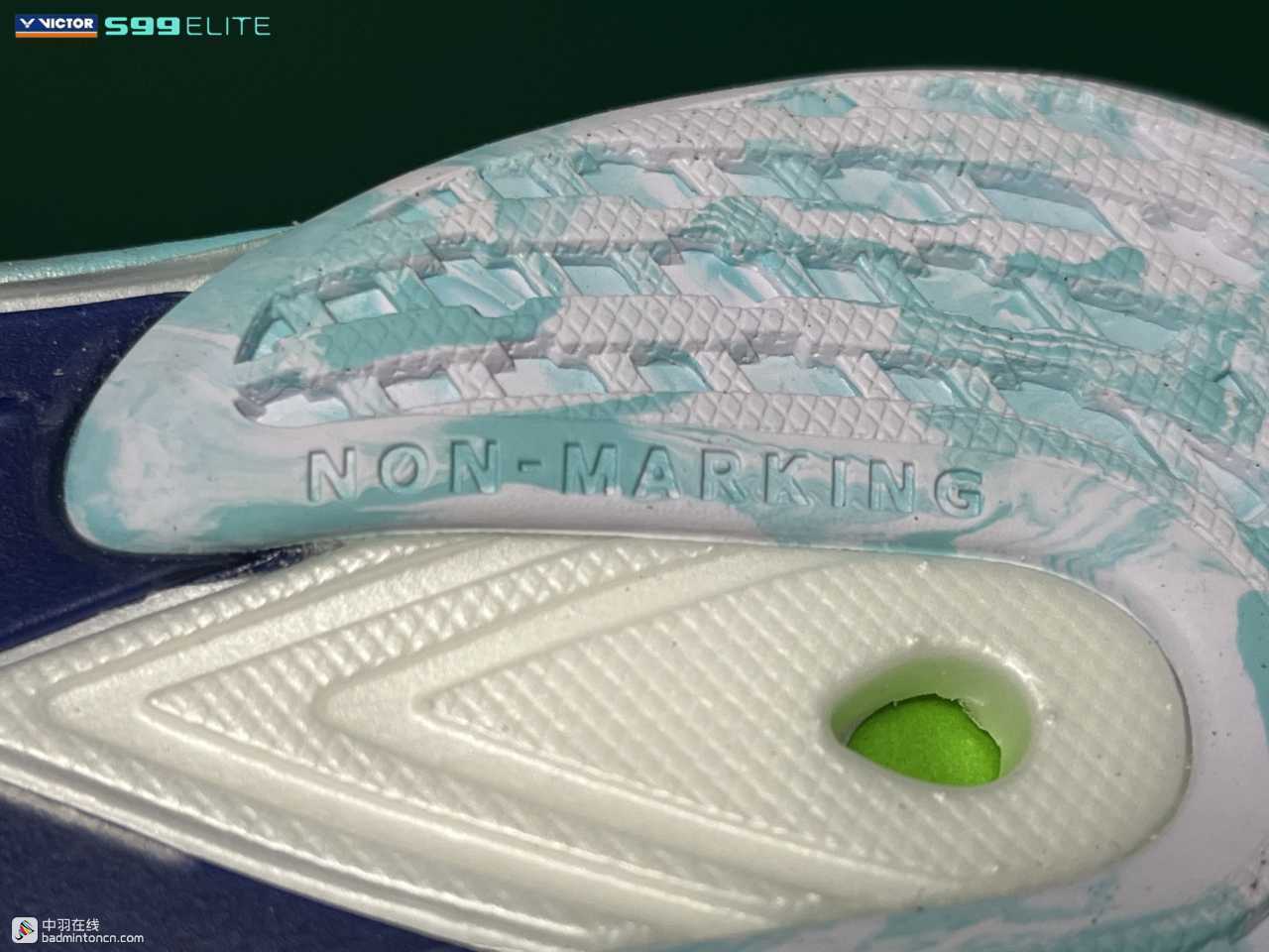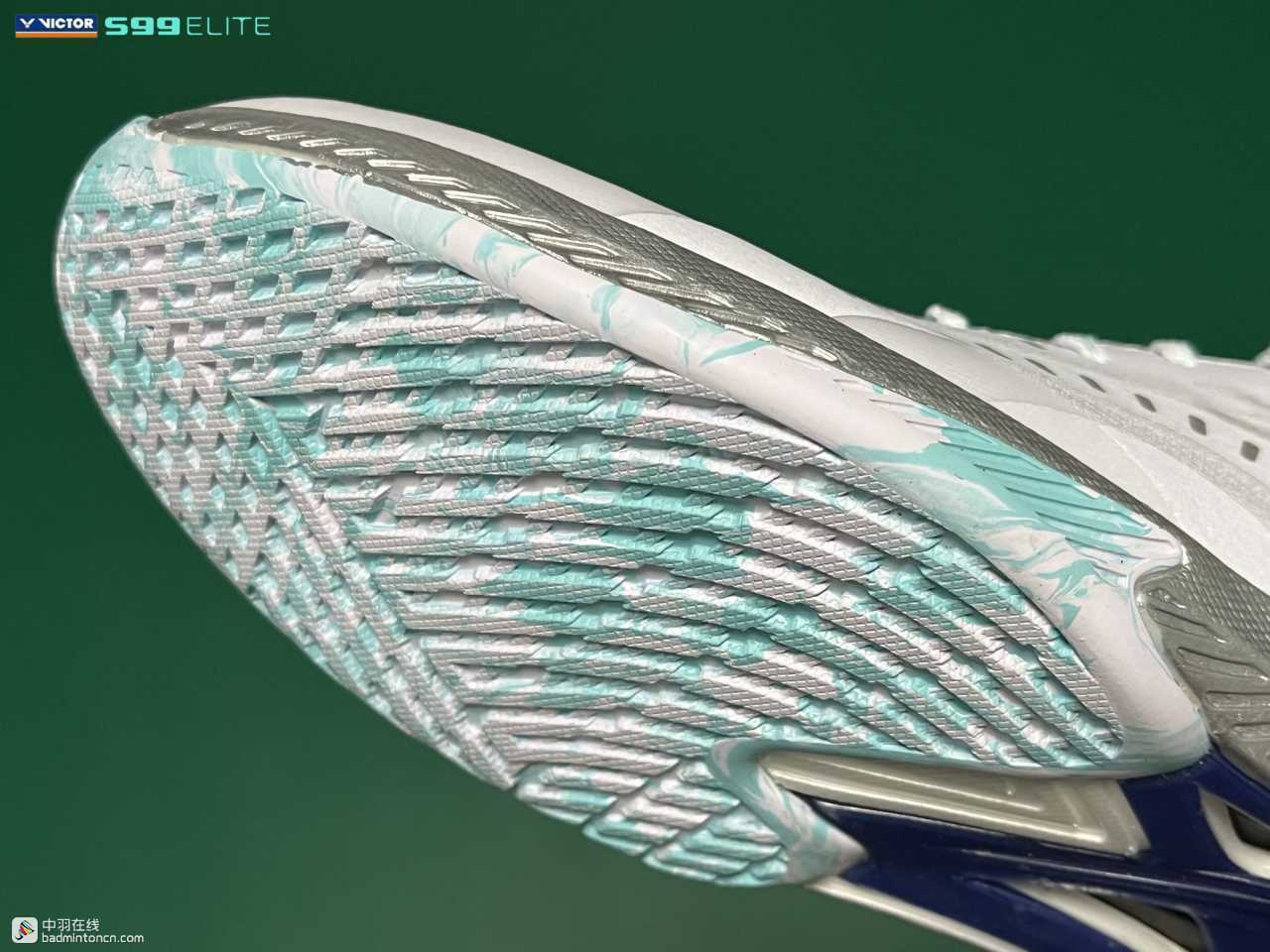 S99 ELITE的大底采用了实色橡胶,白色和湖蓝色相互融合,如同湖蓝色的墨在水中渲染开来,形成了一幅淡雅清新的水墨画。