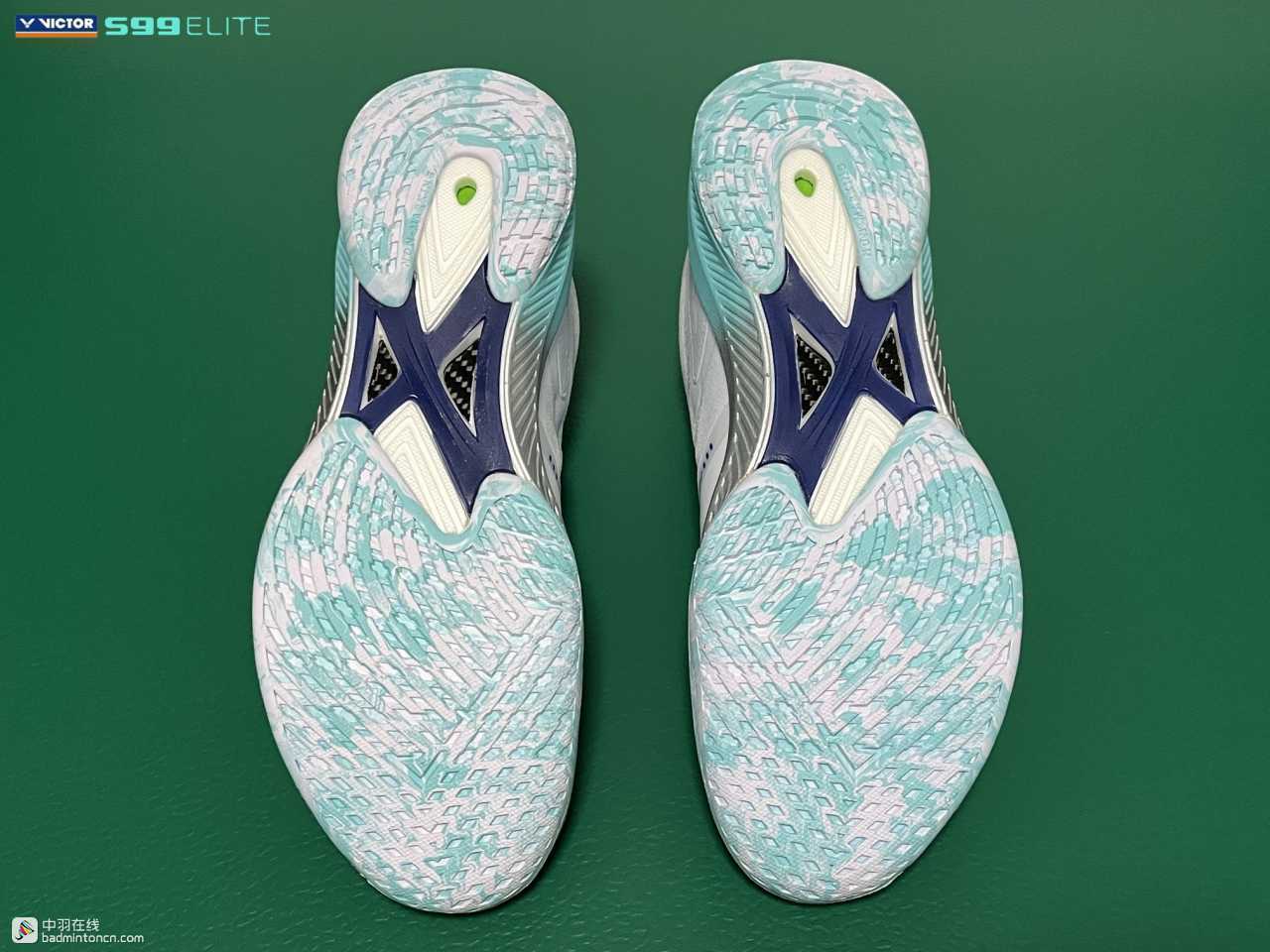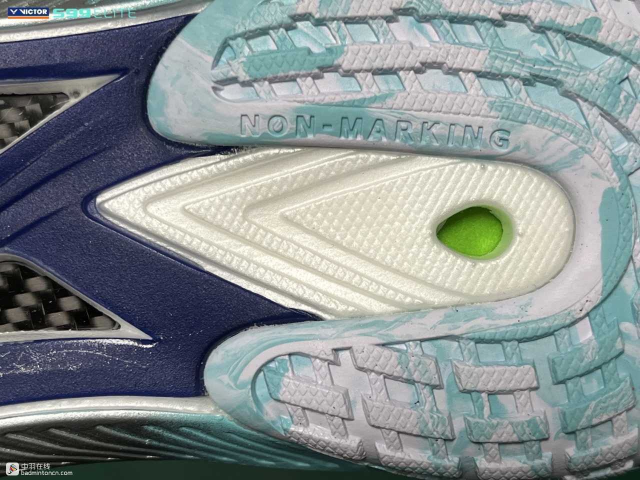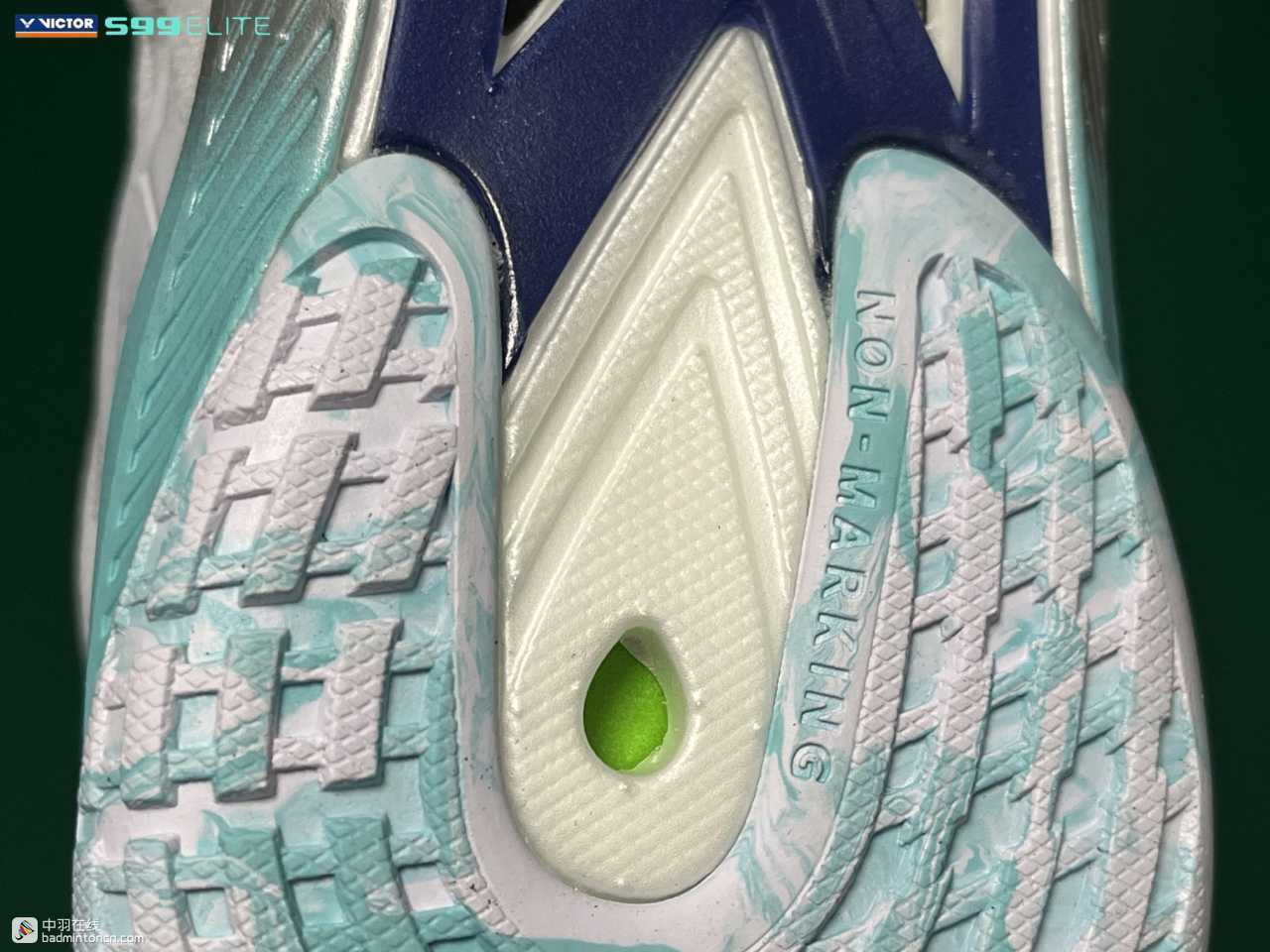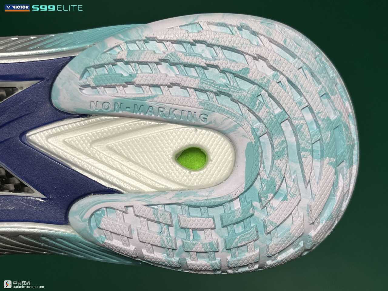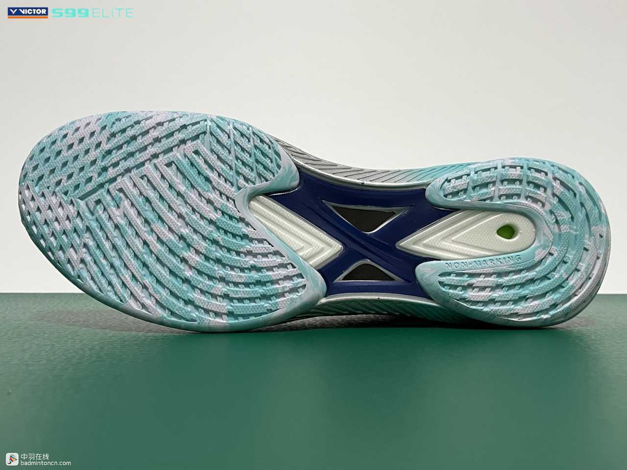 S99 ELITE的大底采用了实色橡胶,白色和湖蓝色相互融合,如同湖蓝色的墨在水中渲染开来,形成了一幅淡雅清新的水墨画。