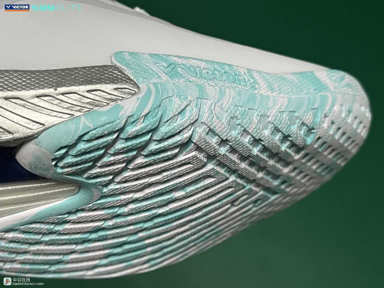 S99 ELITE的中底部分采用了渐变的双色设计,由前掌的银色逐渐过渡到后掌的湖蓝色。银色部分极具金属感,和鞋面上的银色图案搭配得恰到好处。