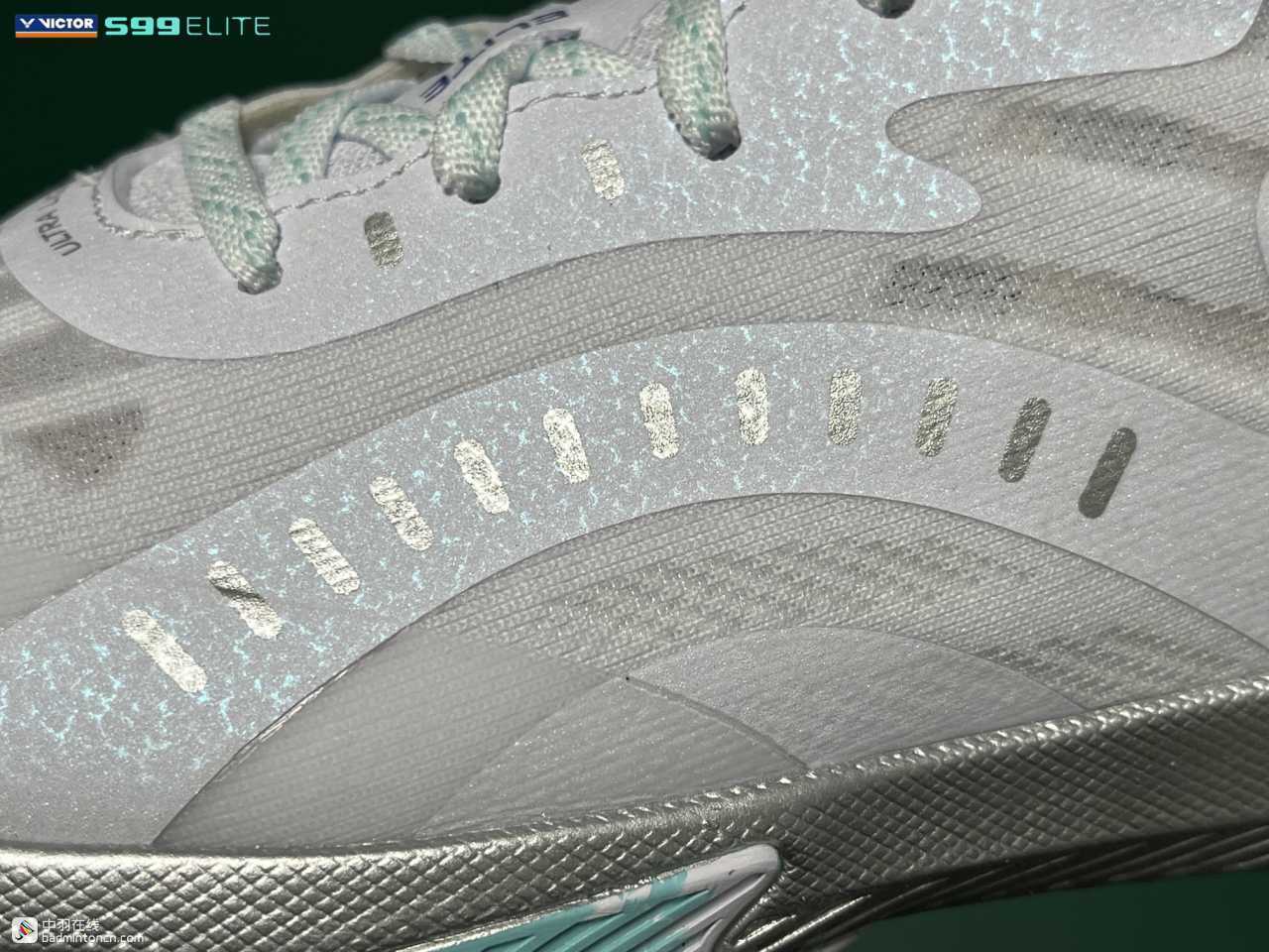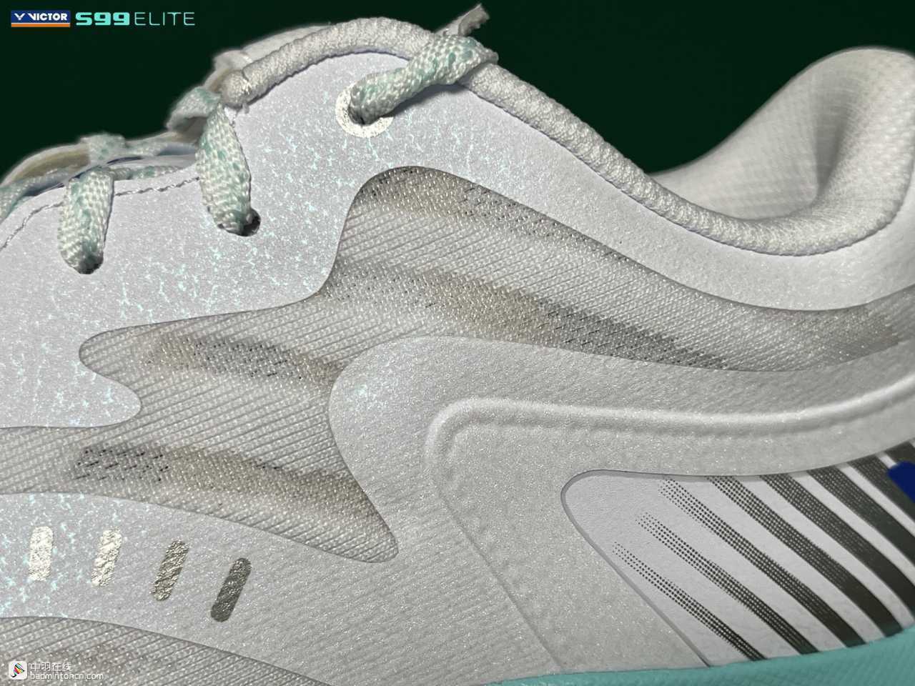 细看之下,S99 ELITE的鞋面并非单调的纯白色,在非网布的部分,用手触摸能够感受到一种磨砂质感,在光照下其上的纹理也会泛着湖蓝色的光,有一种高级感。