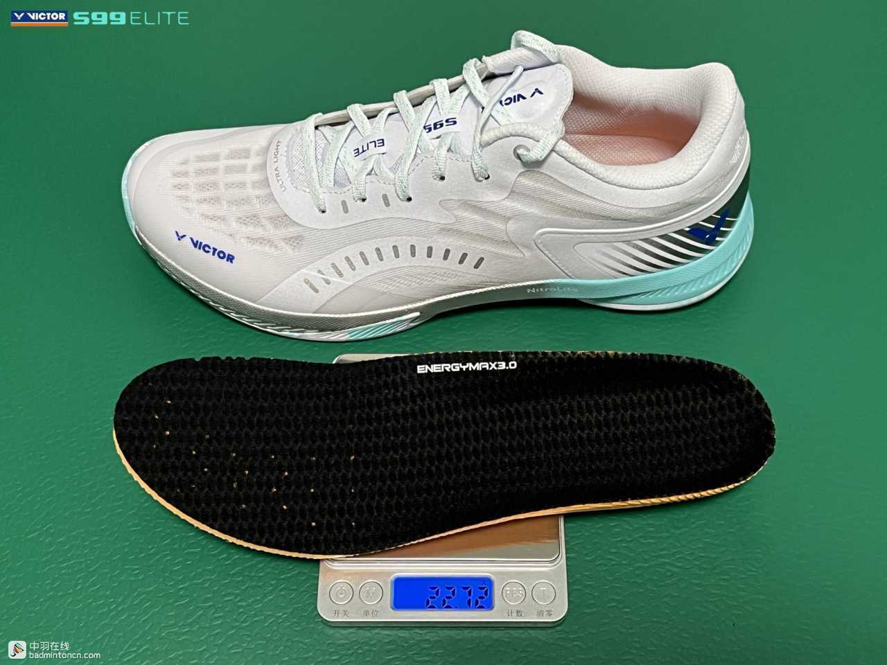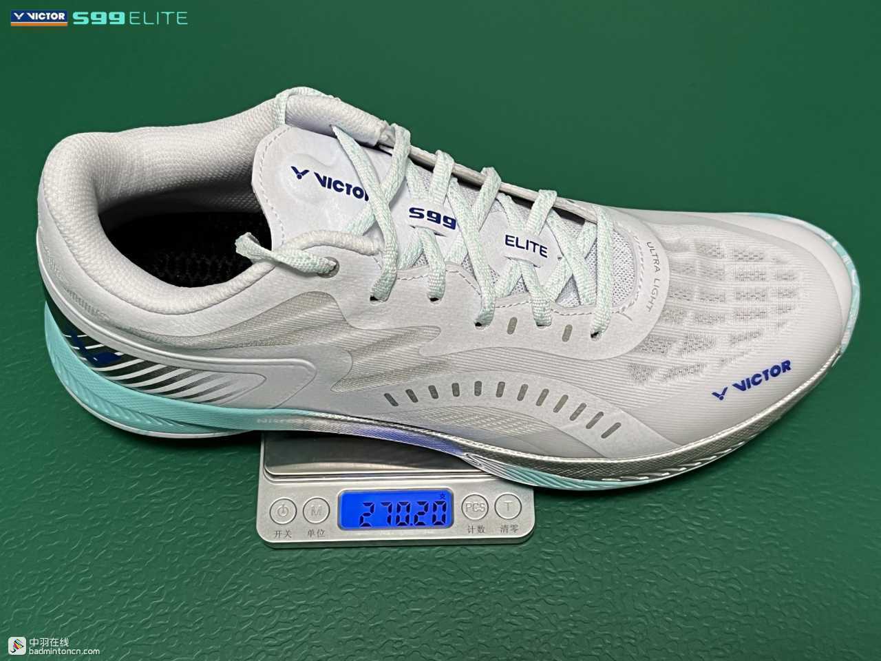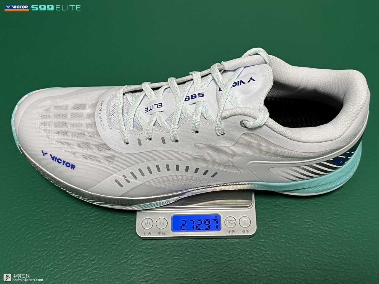 2022年2月,在S99 ELITE最初发售时,威克多官方就在宣传中指出其重量轻至250g(41码,内长265mm),确立了史上最轻羽毛球鞋的地位。这一纪录直到S99 ELITE发售的近十个月以后才被超轻Z 2代打破。而笔者入手的这双S99 ELITE为43码(内长275mm),经过实际测量,左右脚的重量分别为272.97g和270.20g。