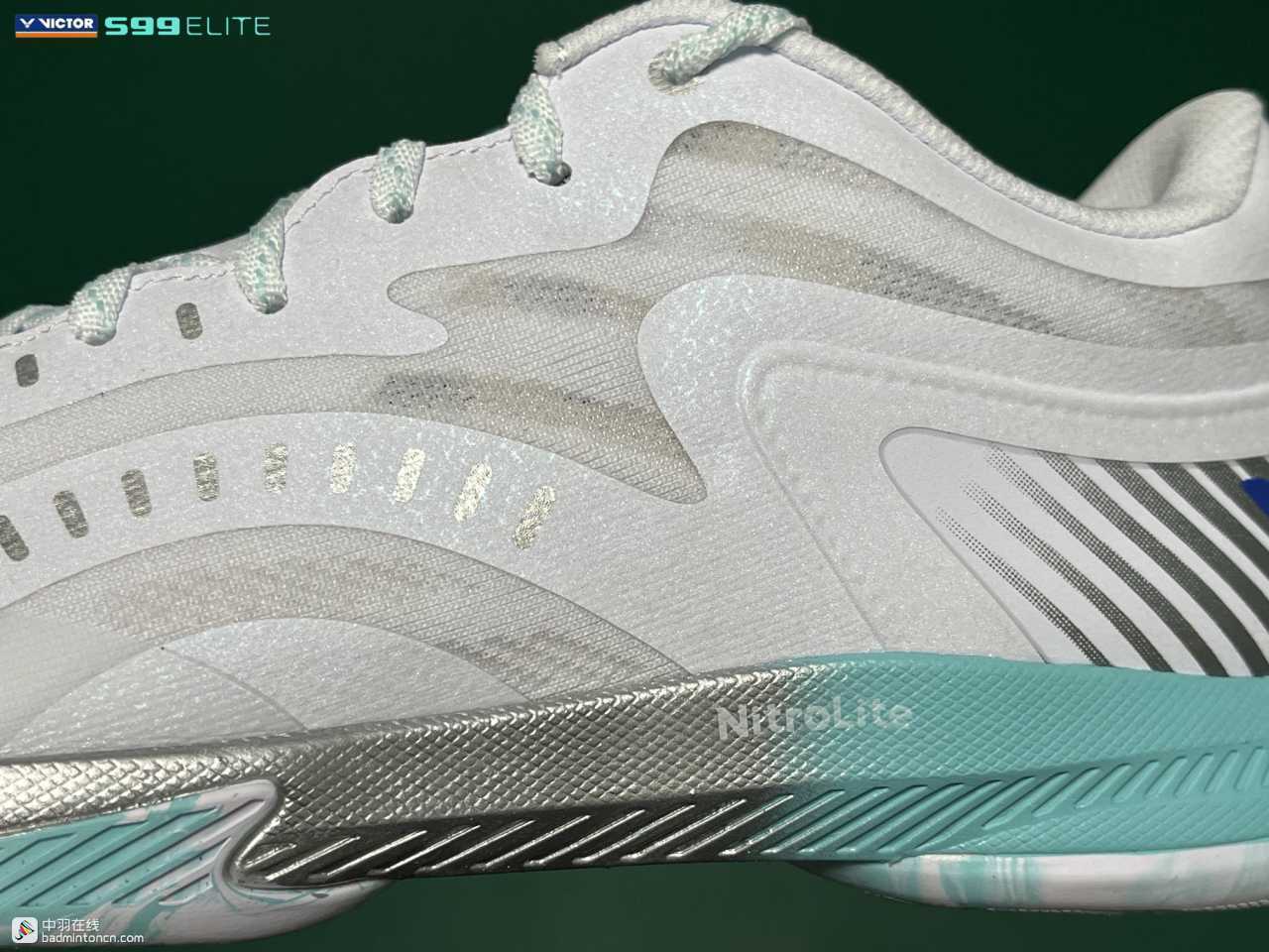 鞋头上部以及鞋身两侧采用了大面积的透气网布,甚至一直延伸到后跟处,这在获得更轻重量的同时,也保证了S99 ELITE良好的透气性能。