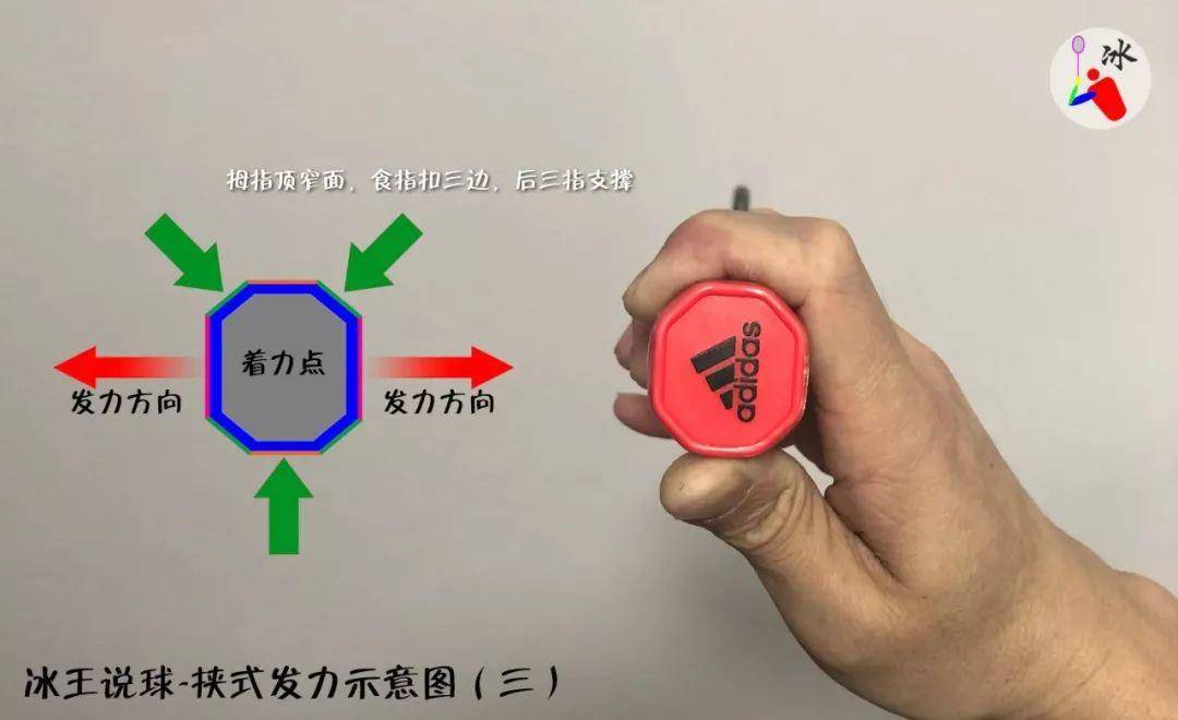 首先,握拍发力是杠杆原理,所以在击球方向和反方向都要施加足够的力才能发挥球拍的作用,也就是说,大多数情况下,在拍柄的两个宽面上手指要具备发力的可能性;