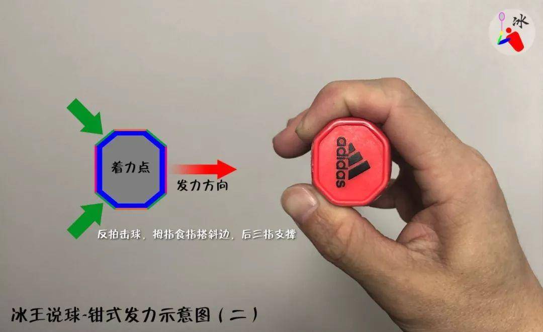 被动发力时,手指会受身理结构限制,所以不在以单一的拇指或者食指作为支点,而是改为拇指食指共同用力作为支点,故握拍由屈指握拍改为钳式握拍。