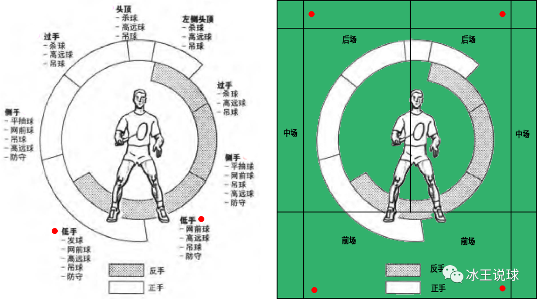 先排除a的情况,bc都属于场地四角(外圈)极限被动球的处理,而剩下的内圈位置均为一般攻防点位,握拍上只有常规正反手的区别,基于变拍和一致性的原则,无球时的握拍准备大多为中性握拍。