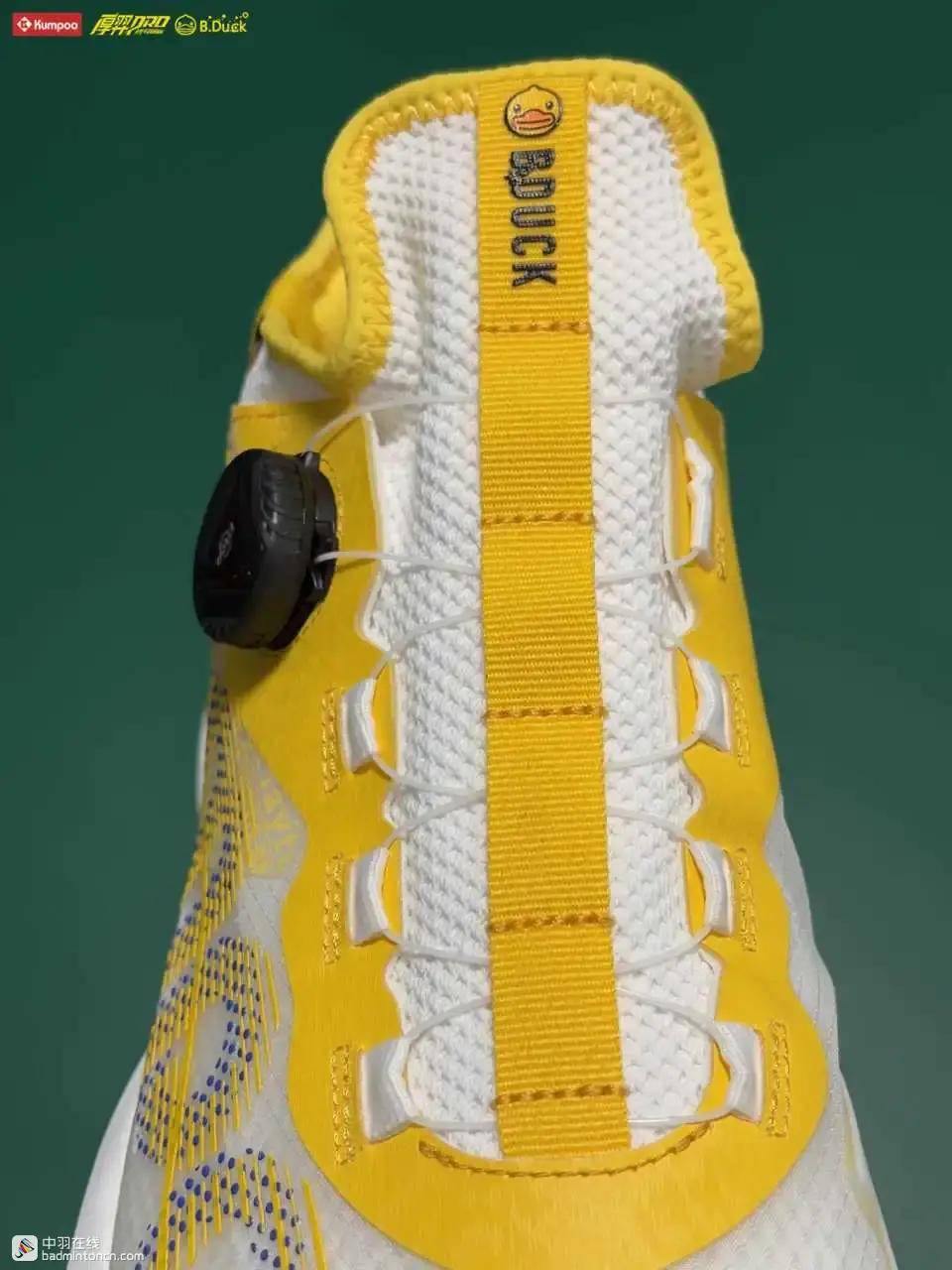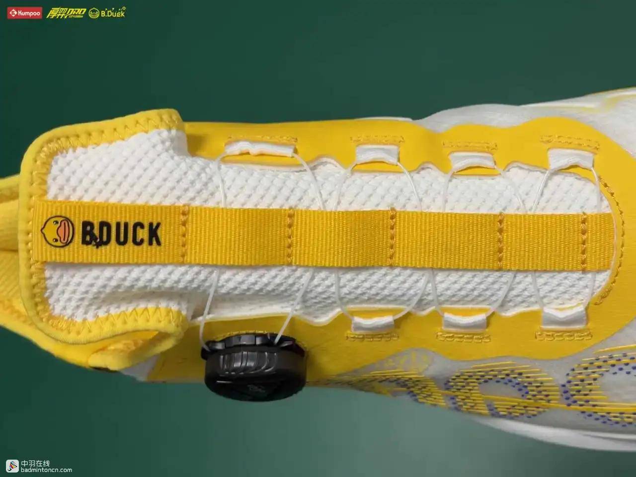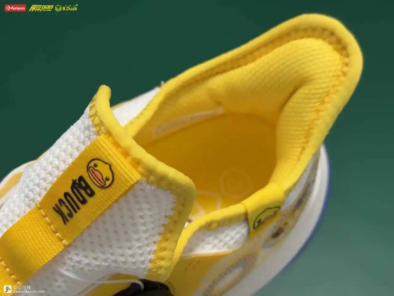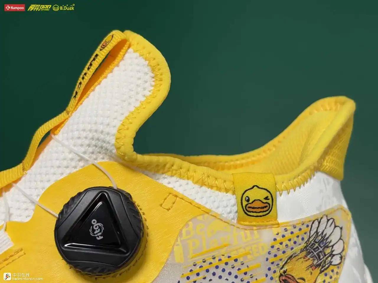 厚羿PRO 小黄鸭的鞋舌整体采用白色,中间一道黄色的织带连接上下,顶部的小黄鸭LOGO和“B. DUCK”黑色字样再次点明主题。