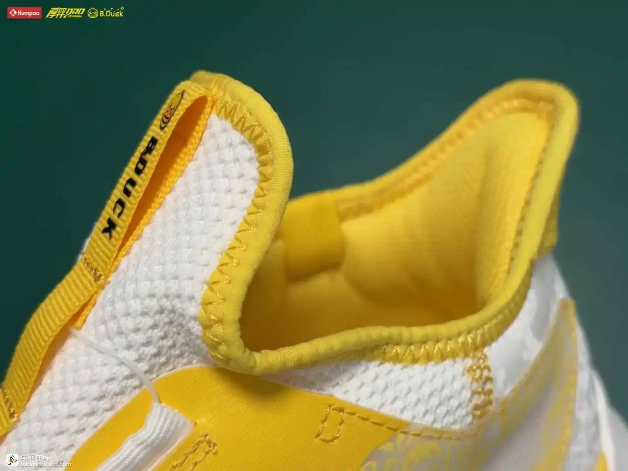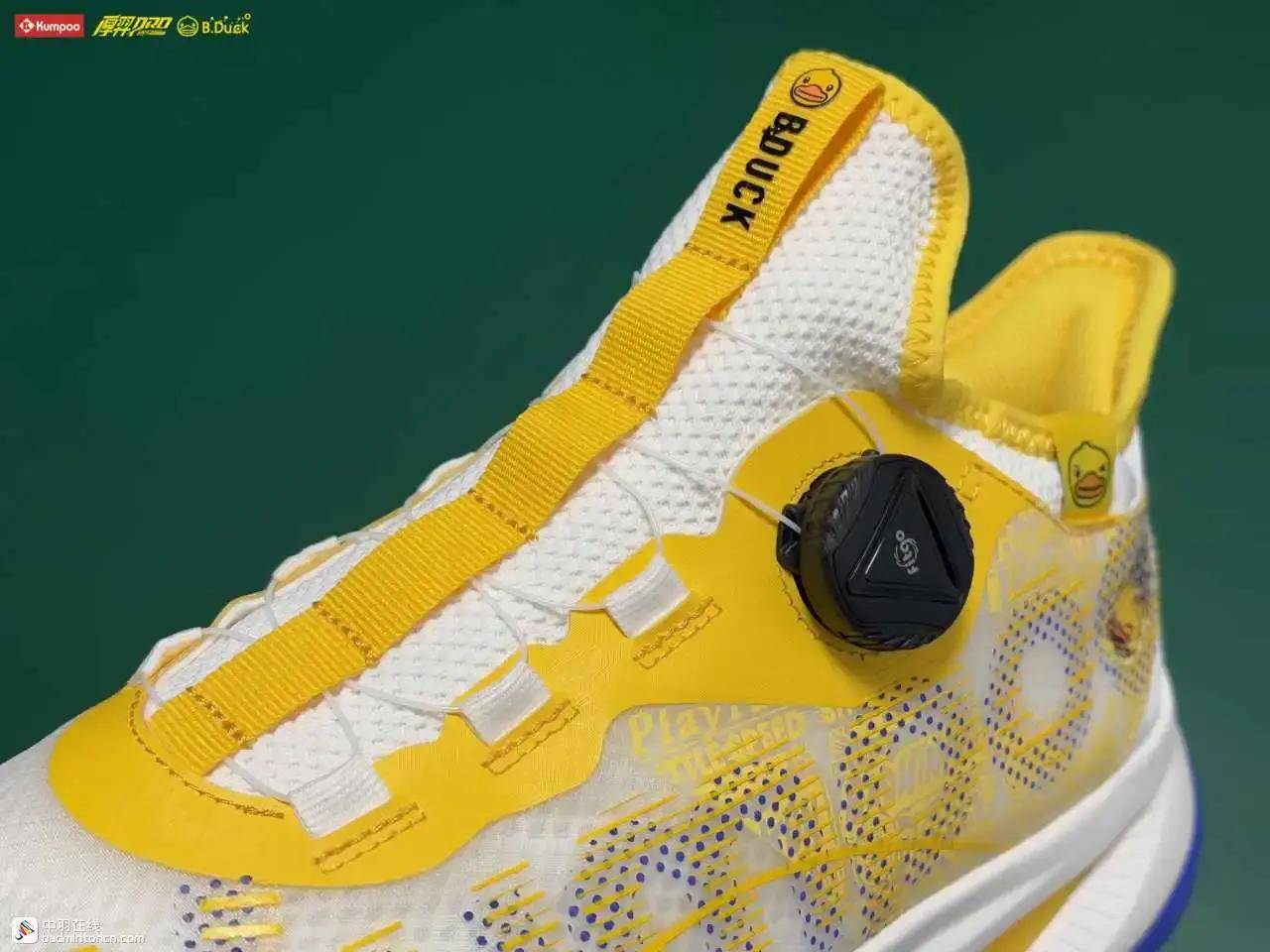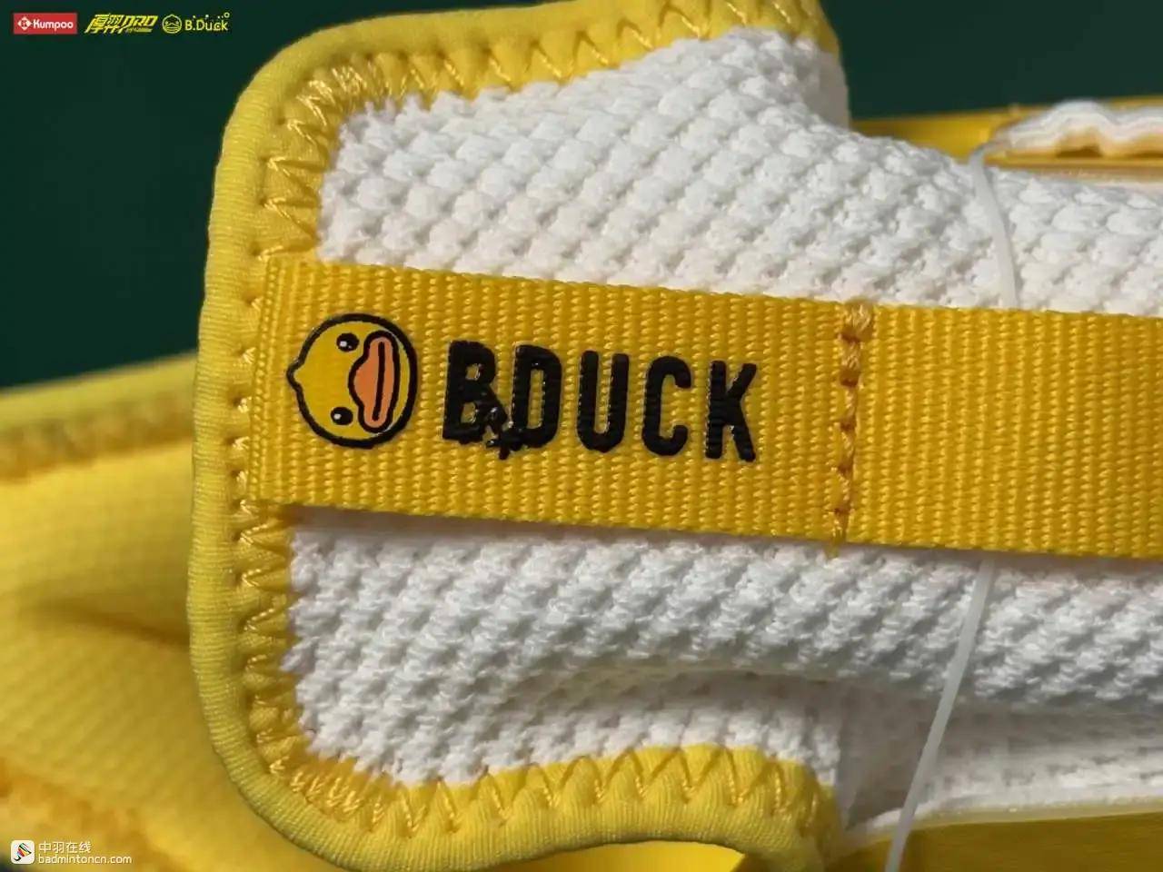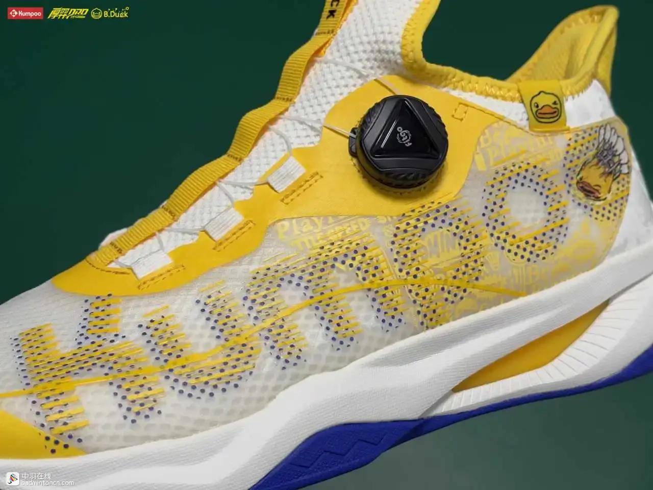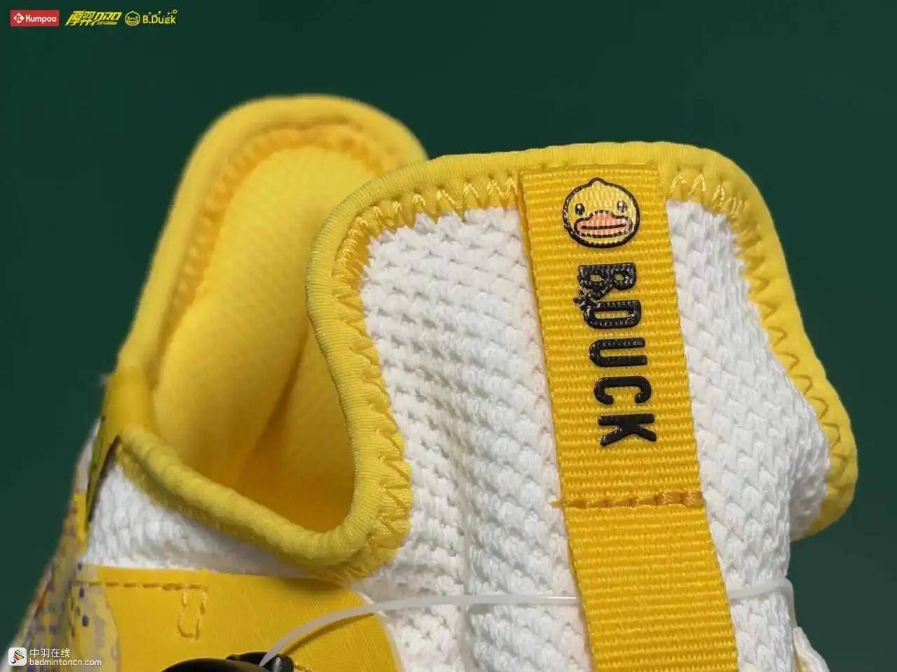 厚羿PRO 小黄鸭的鞋舌整体采用白色,中间一道黄色的织带连接上下,顶部的小黄鸭LOGO和“B. DUCK”黑色字样再次点明主题。