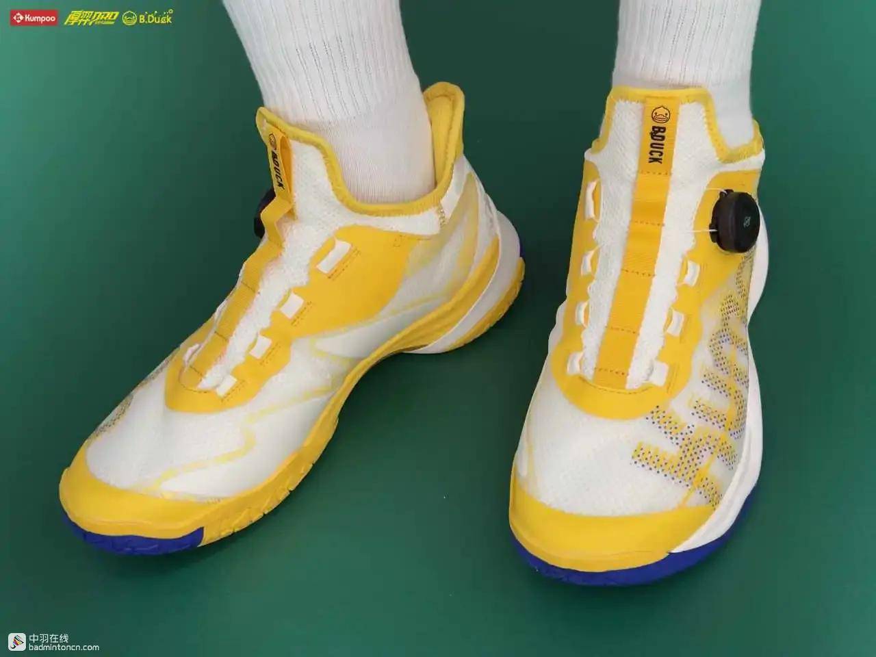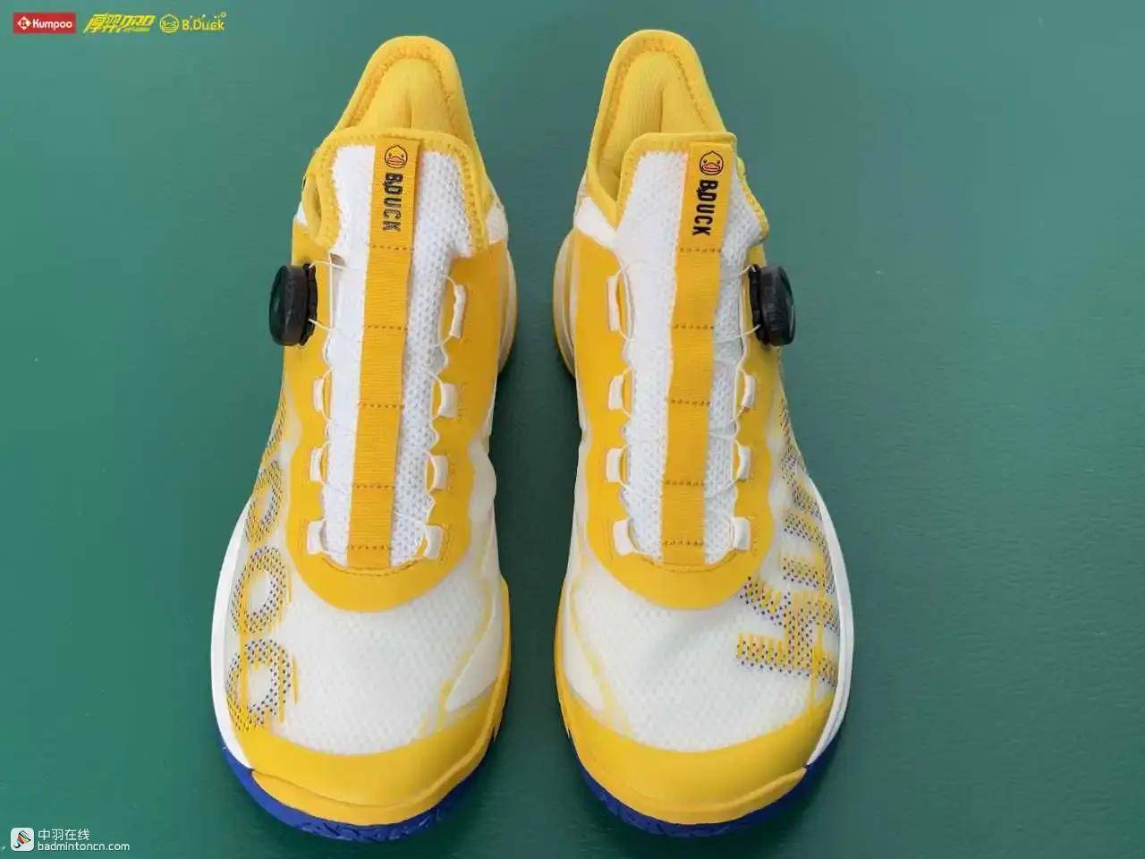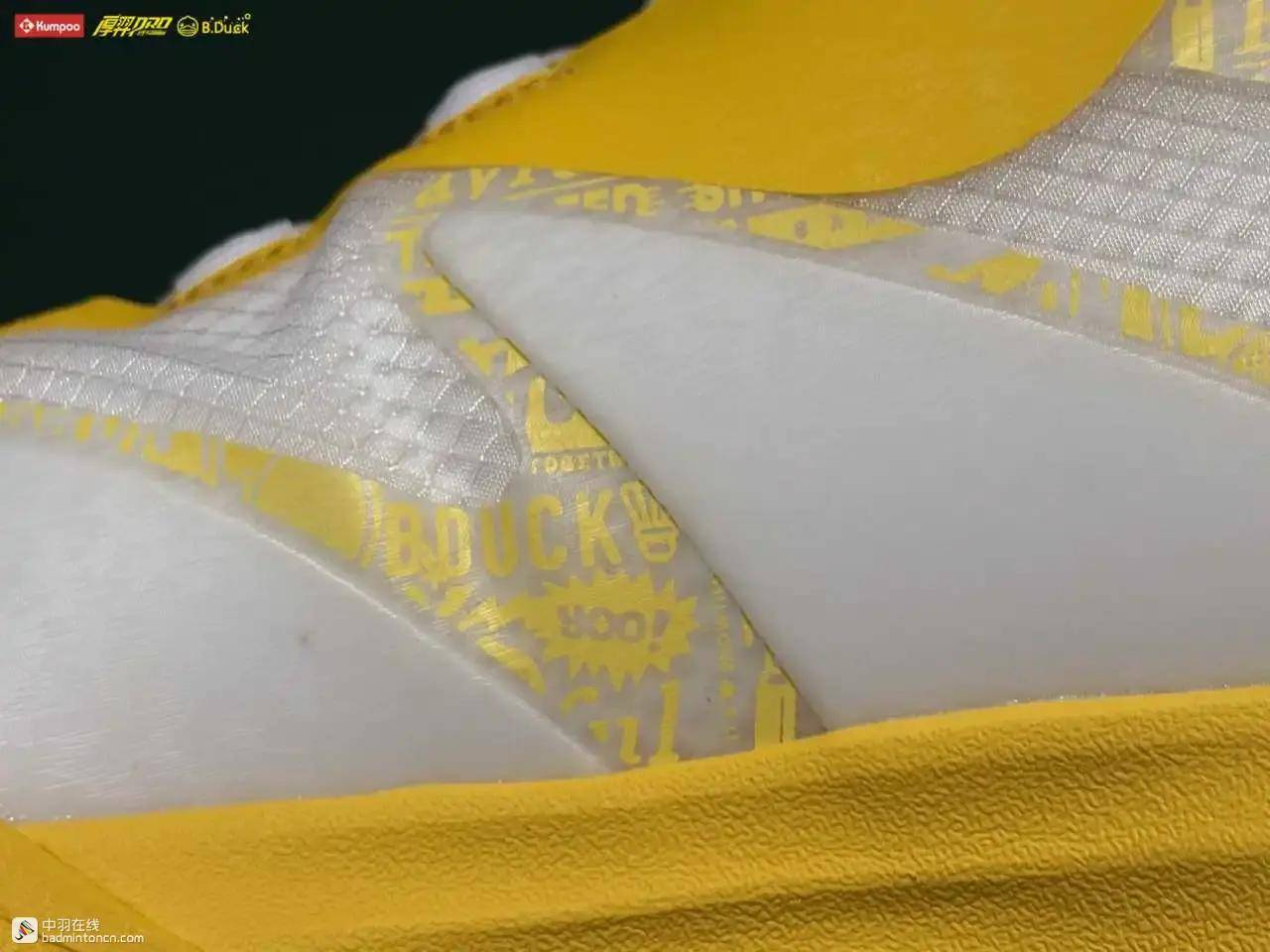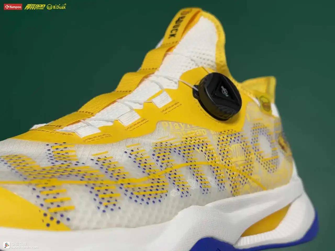 厚羿PRO 小黄鸭的鞋舌整体采用白色,中间一道黄色的织带连接上下,顶部的小黄鸭LOGO和“B. DUCK”黑色字样再次点明主题。