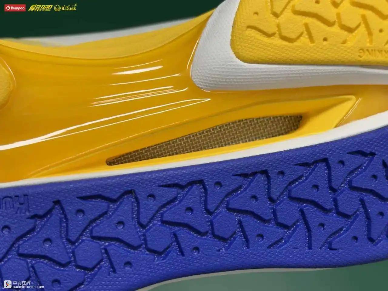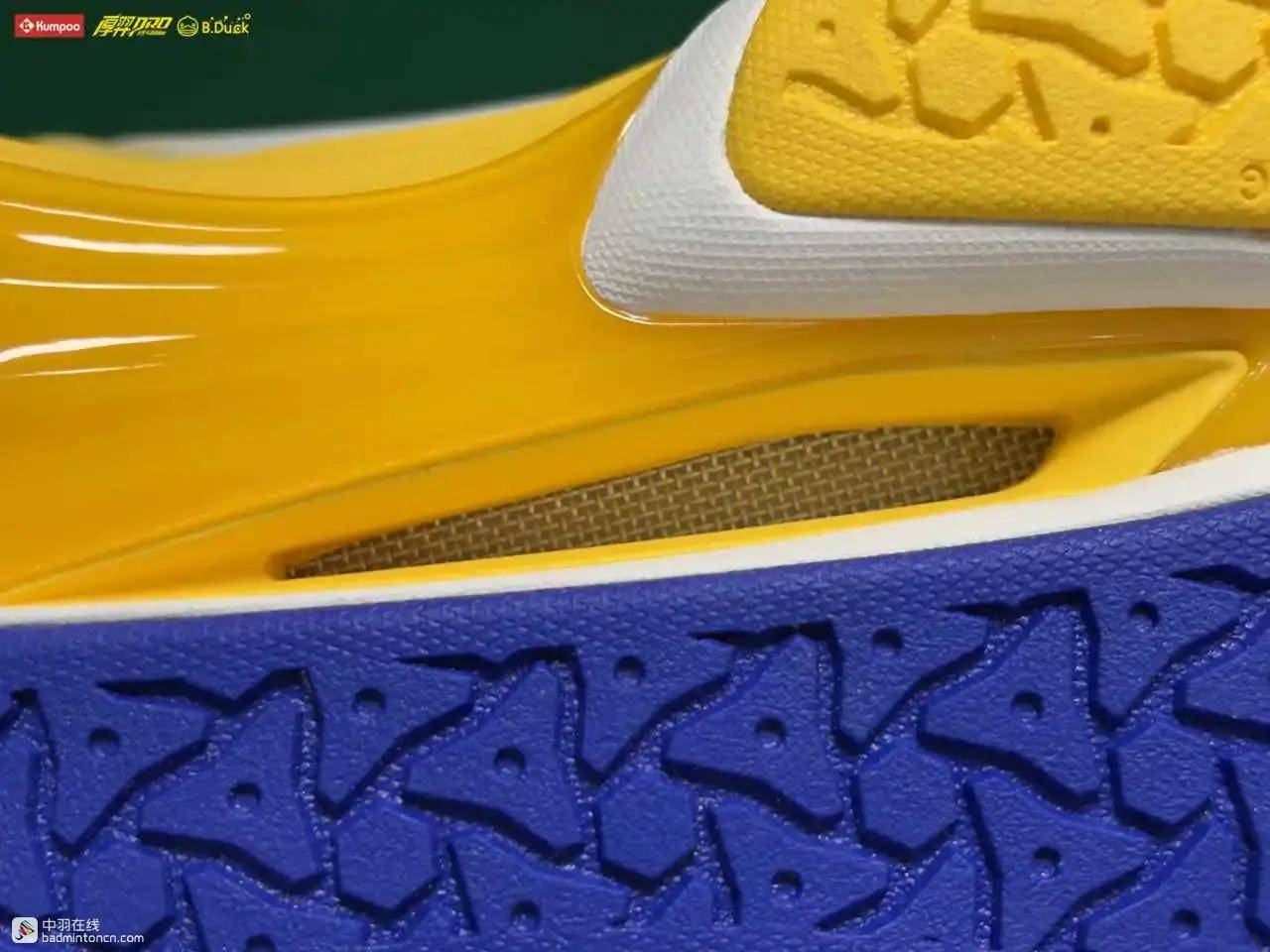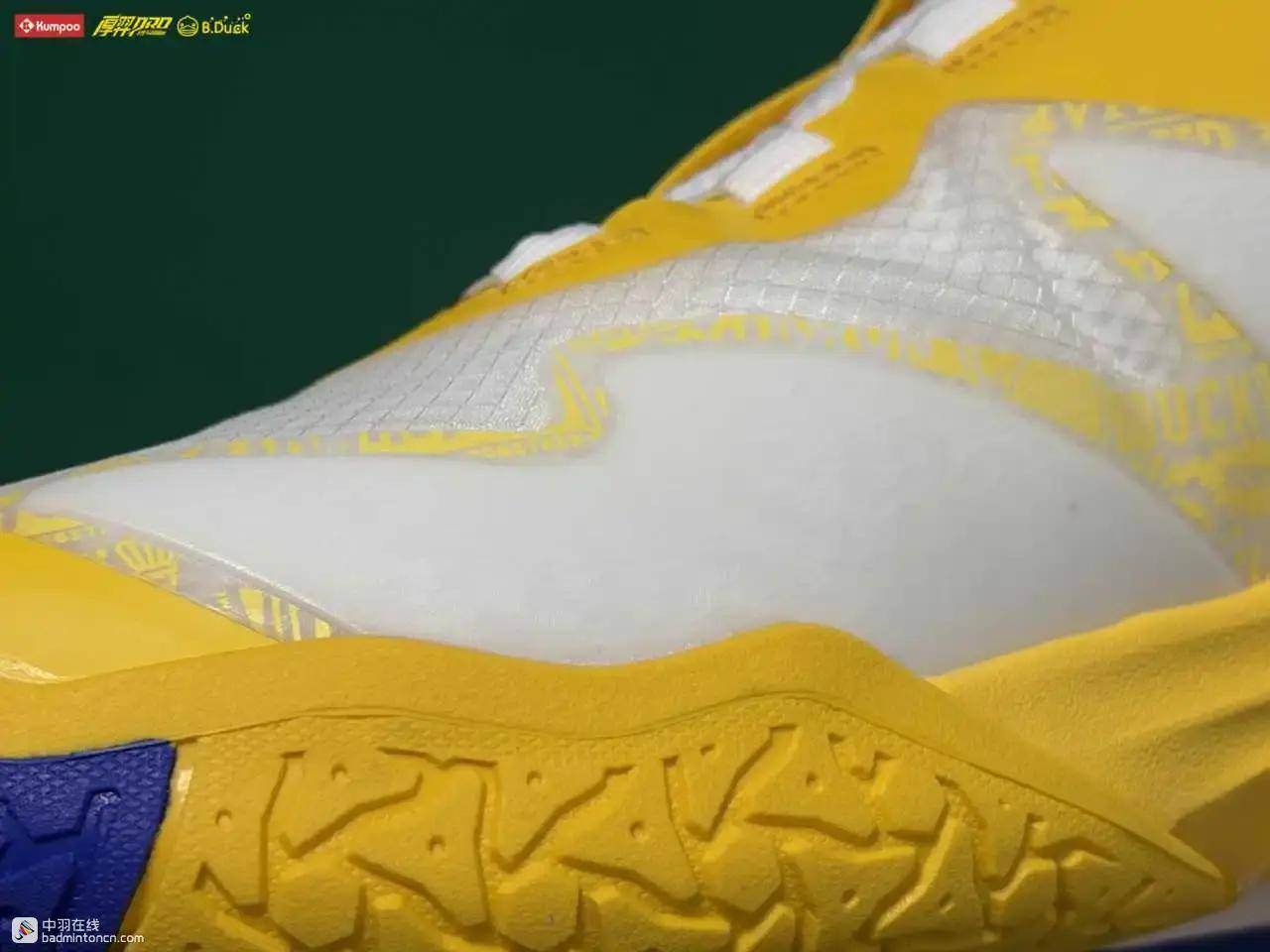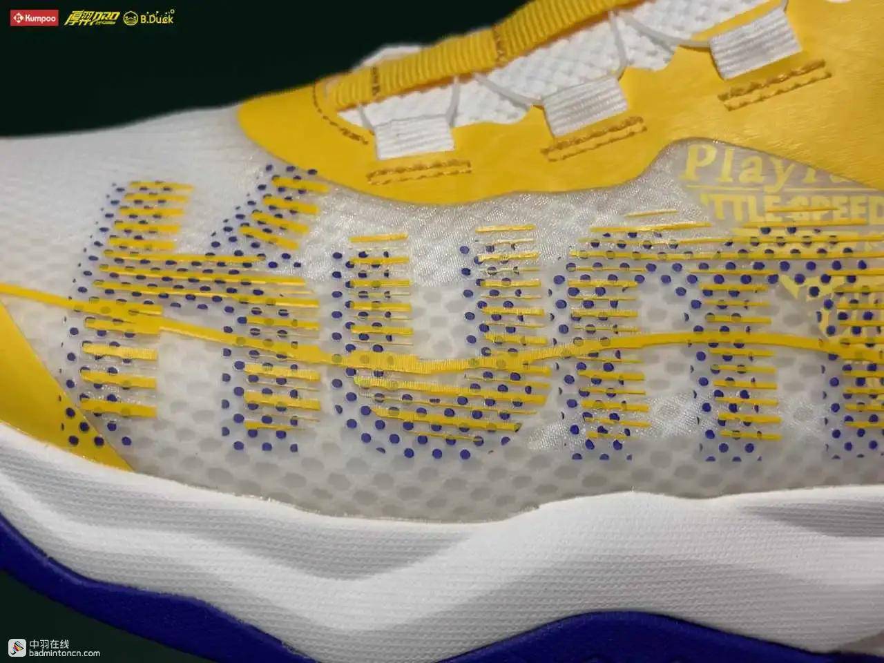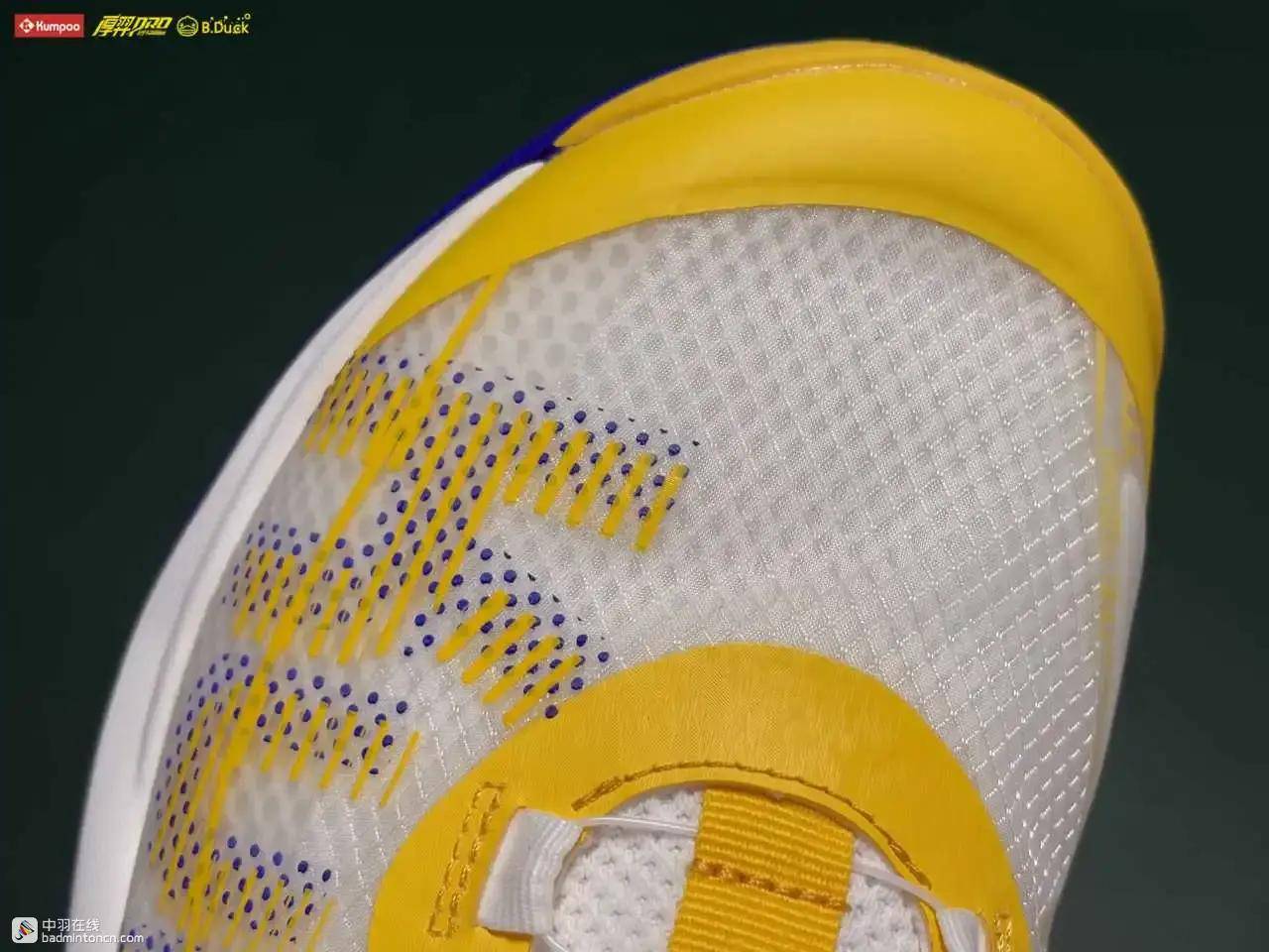 厚羿PRO 小黄鸭的鞋身大面积采用了网布的设计,外表的这层半透明薄膜显得颇为清新时尚,又具有些许科技感。图案方面,厚羿PRO 小黄鸭采用了薰风羽毛球鞋常用的大LOGO设计,品牌名称“Kumpoo”由前掌延伸到后跟,基本占据了整只鞋的外侧,简约而大气,时尚中不失典雅。