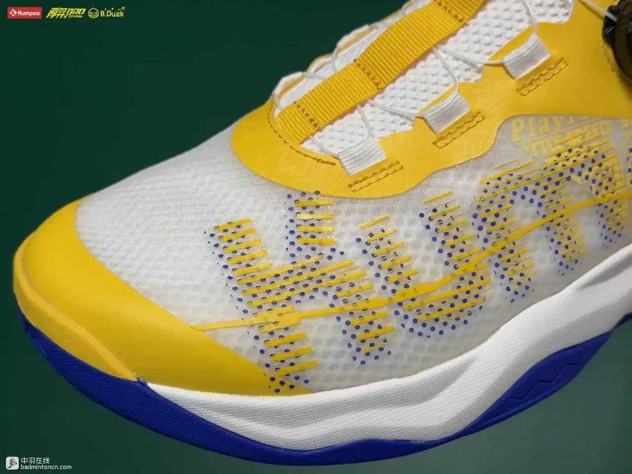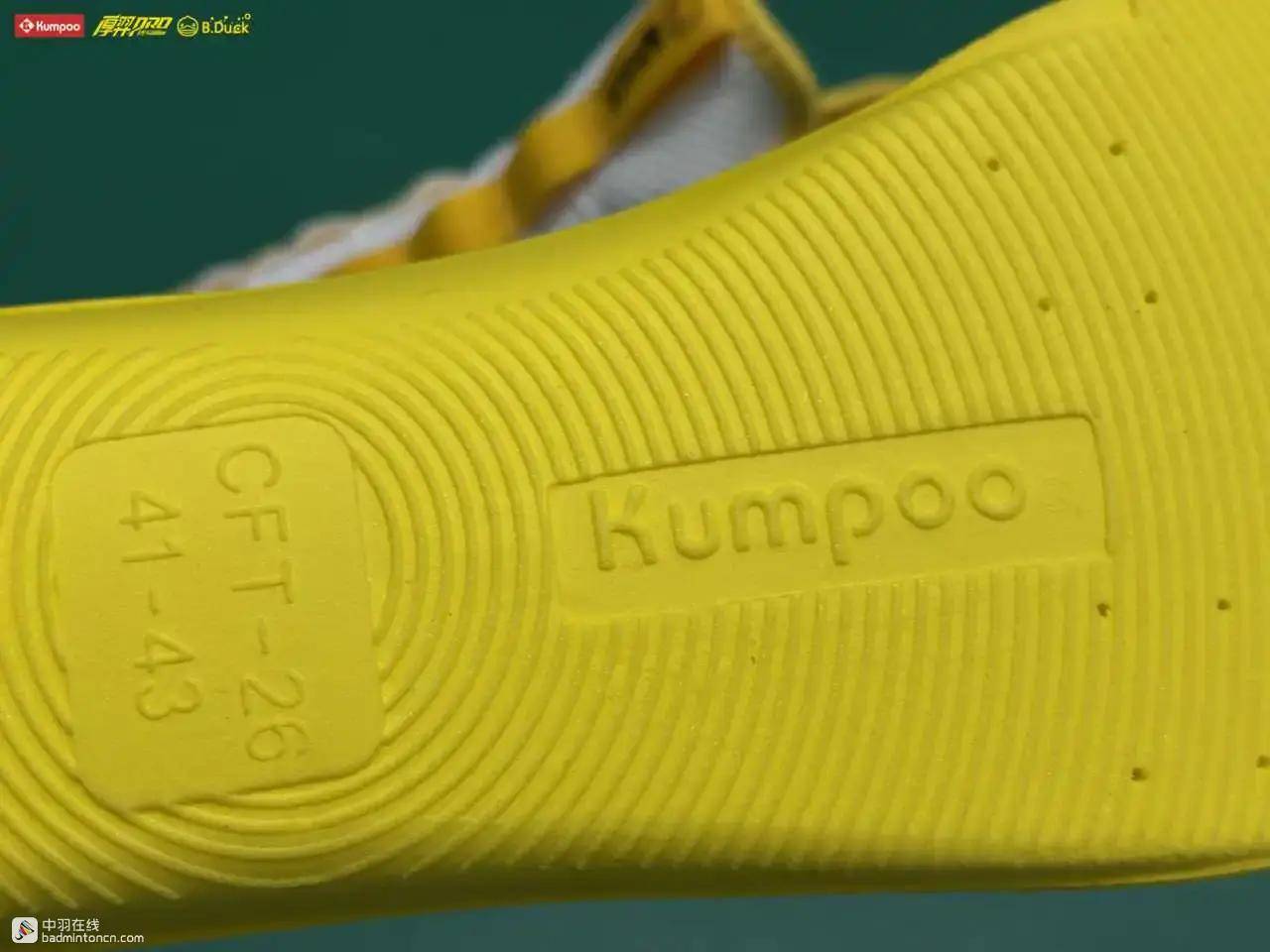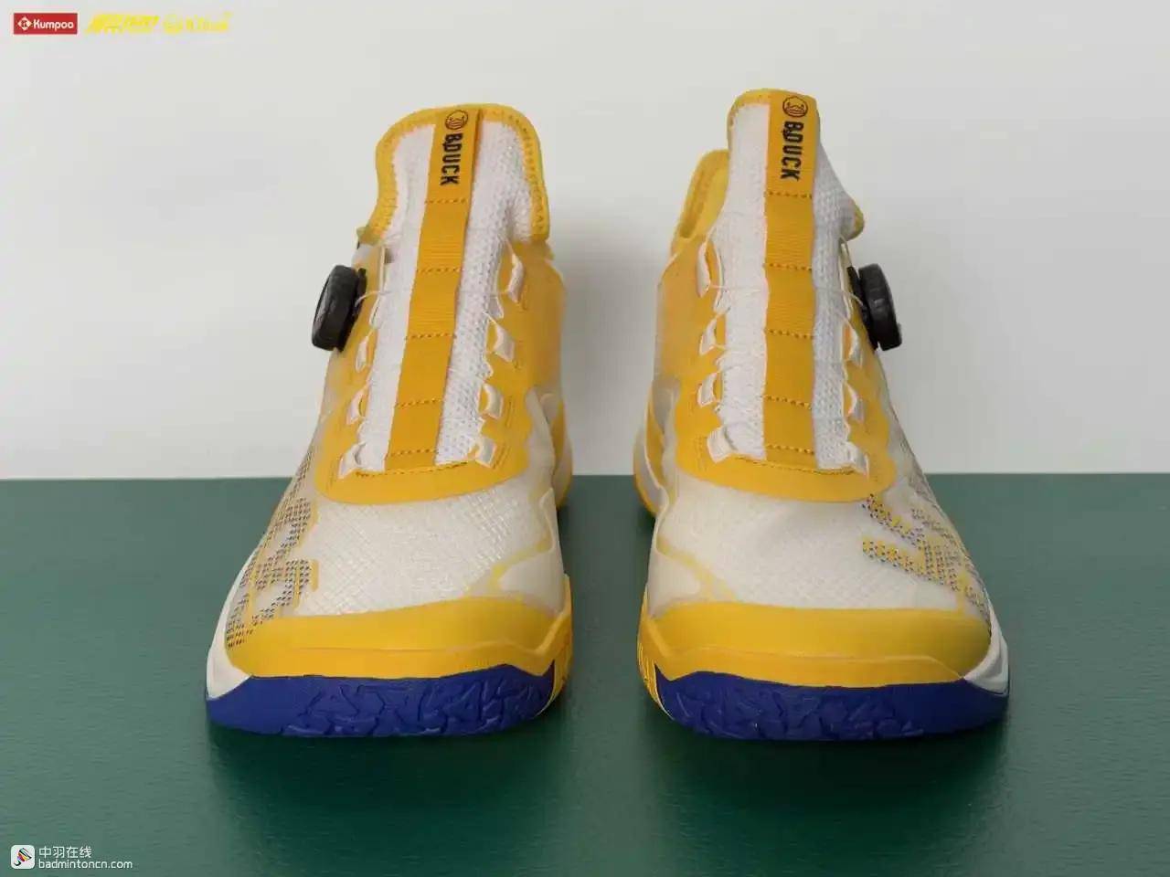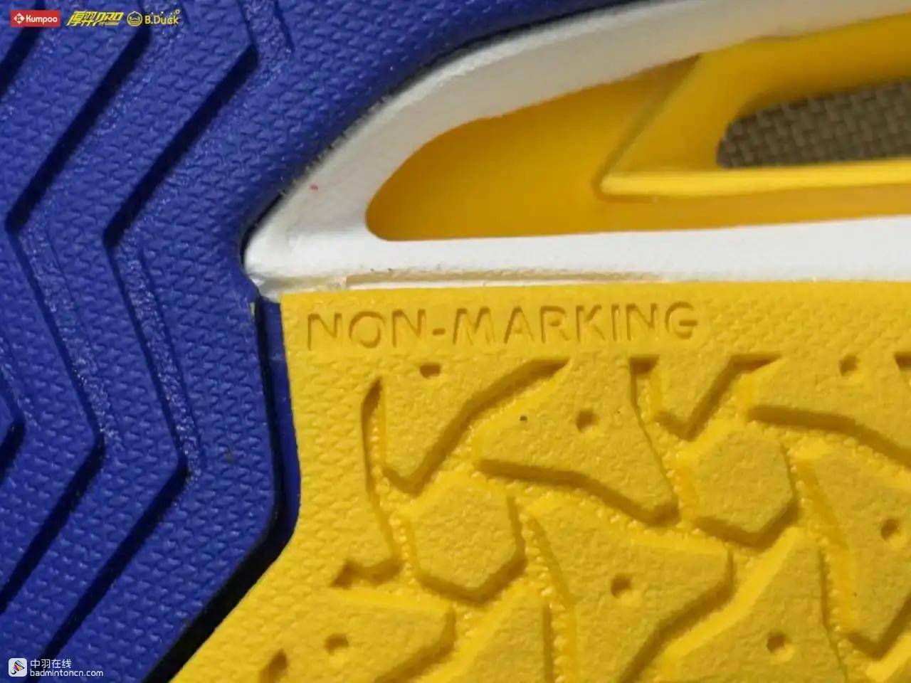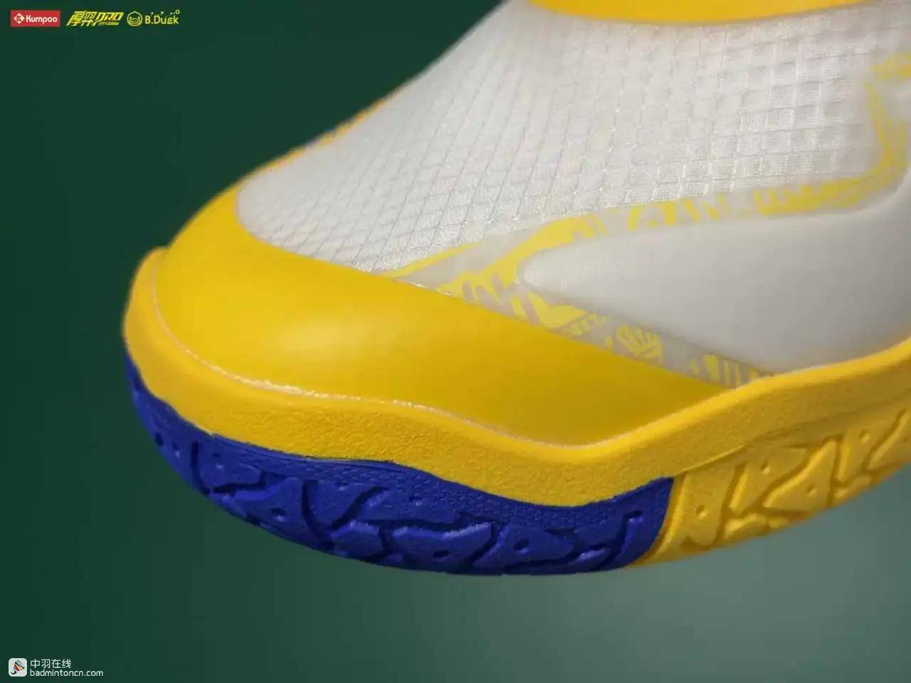 厚羿PRO 小黄鸭的鞋身大面积采用了网布的设计,外表的这层半透明薄膜显得颇为清新时尚,又具有些许科技感。图案方面,厚羿PRO 小黄鸭采用了薰风羽毛球鞋常用的大LOGO设计,品牌名称“Kumpoo”由前掌延伸到后跟,基本占据了整只鞋的外侧,简约而大气,时尚中不失典雅。