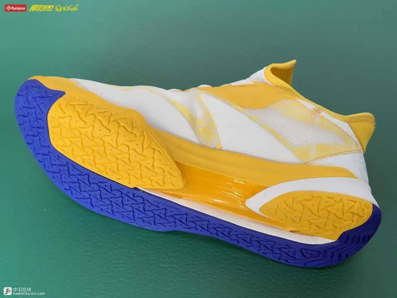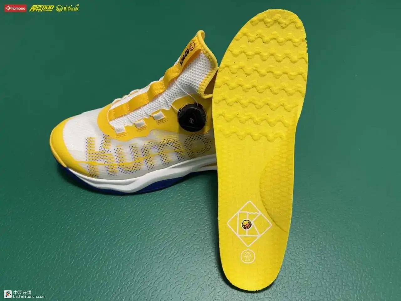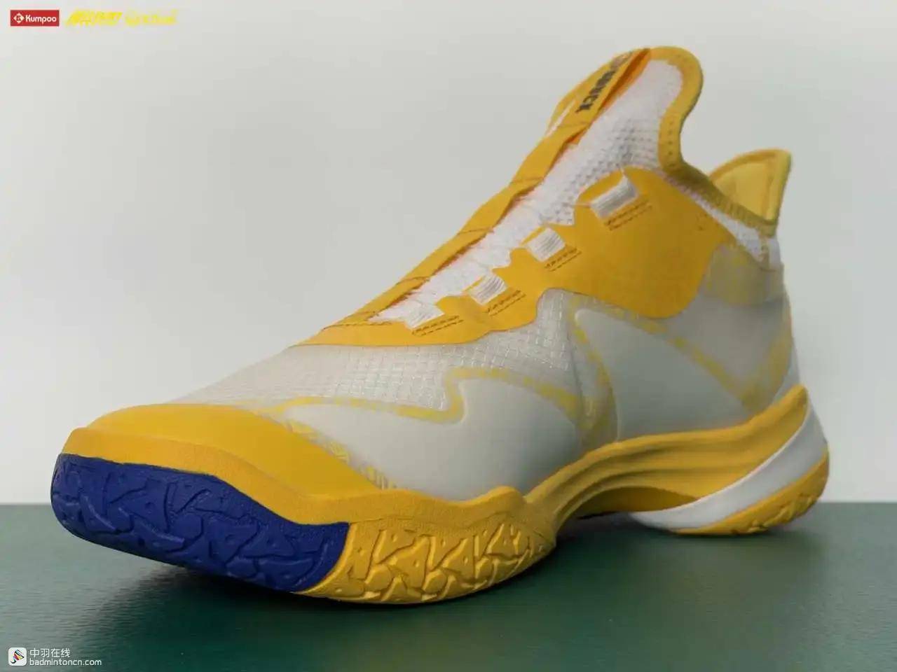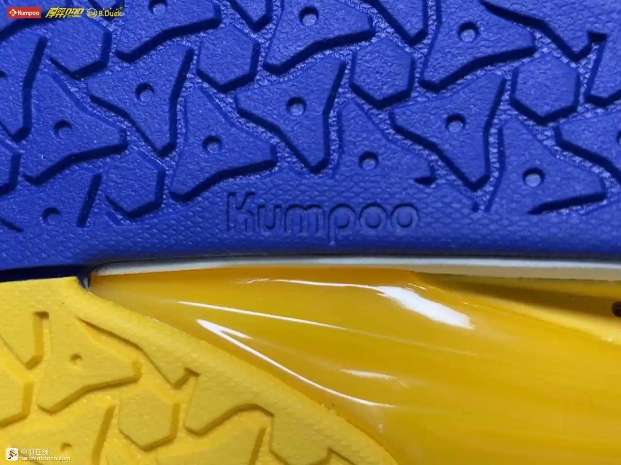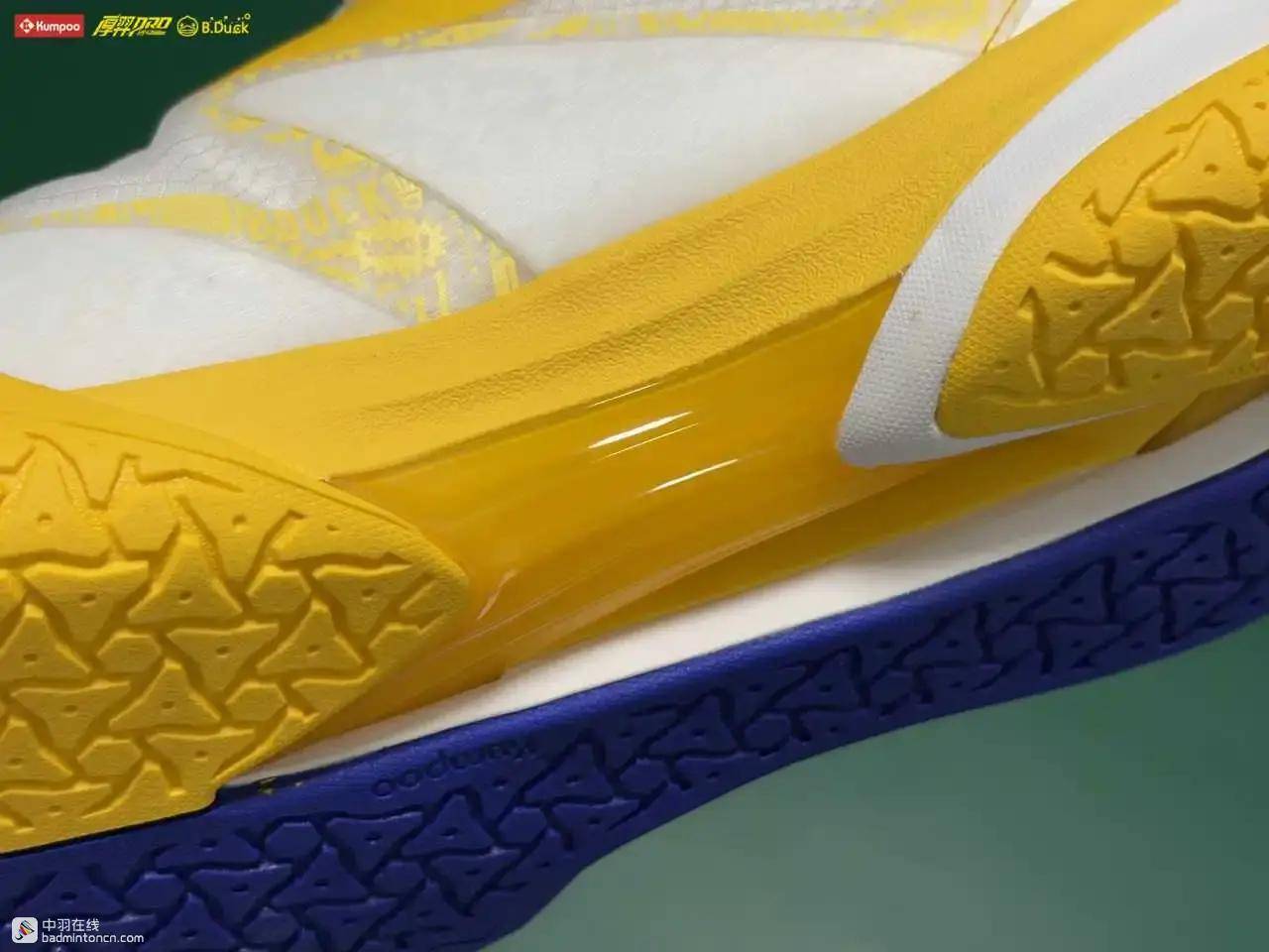 厚羿PRO 小黄鸭的鞋身大面积采用了网布的设计,外表的这层半透明薄膜显得颇为清新时尚,又具有些许科技感。图案方面,厚羿PRO 小黄鸭采用了薰风羽毛球鞋常用的大LOGO设计,品牌名称“Kumpoo”由前掌延伸到后跟,基本占据了整只鞋的外侧,简约而大气,时尚中不失典雅。