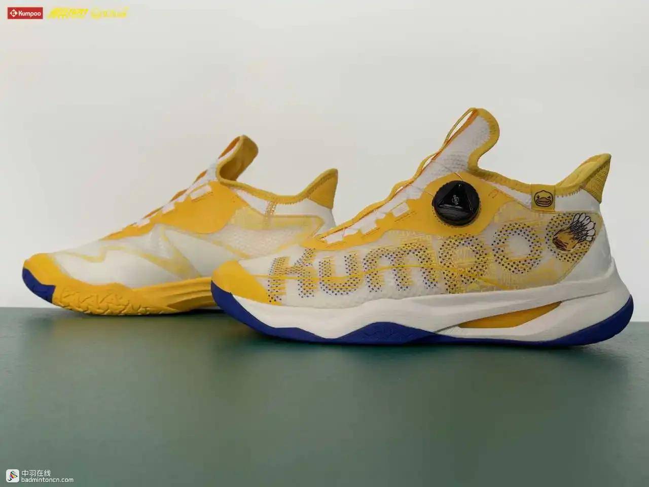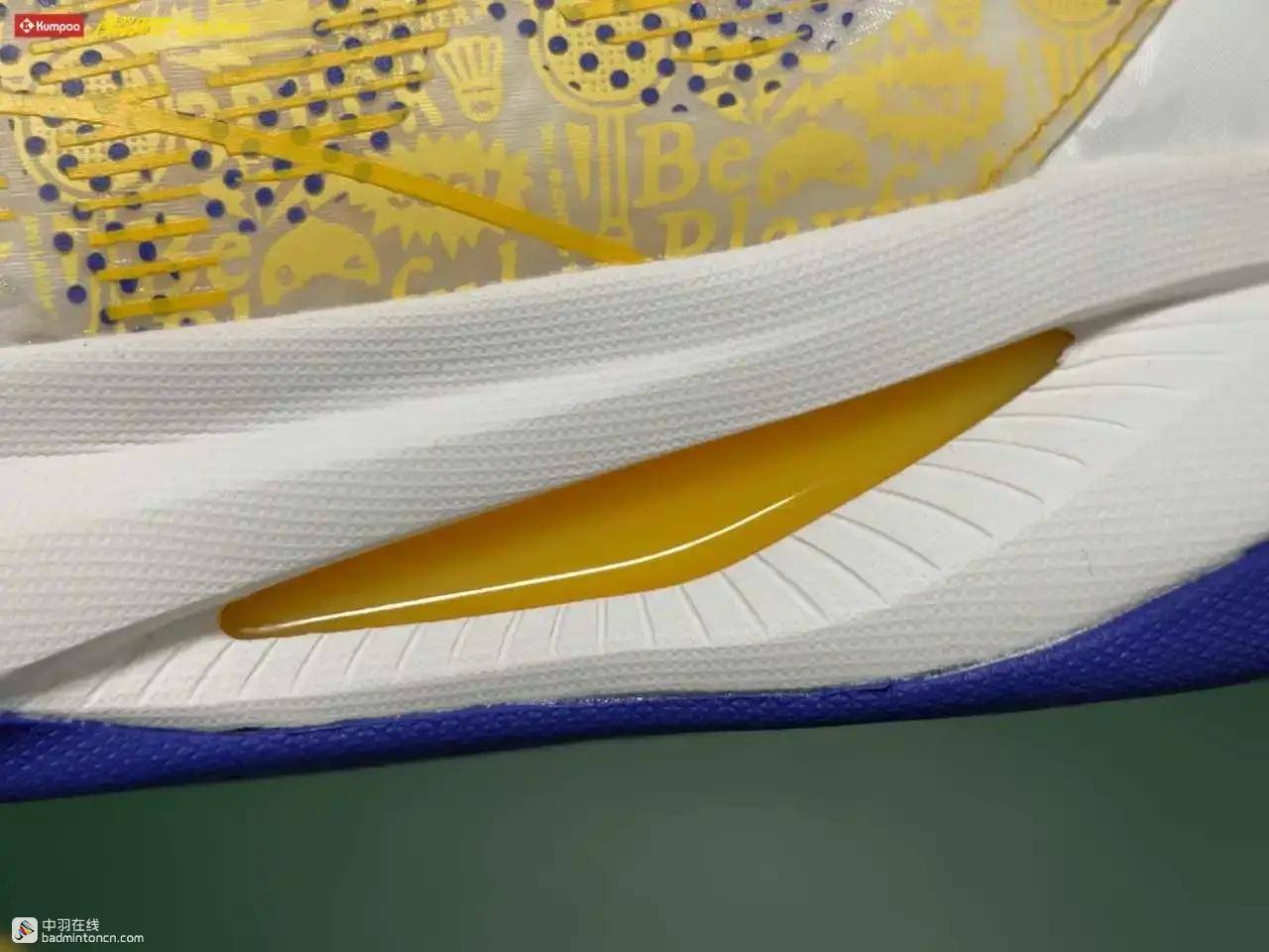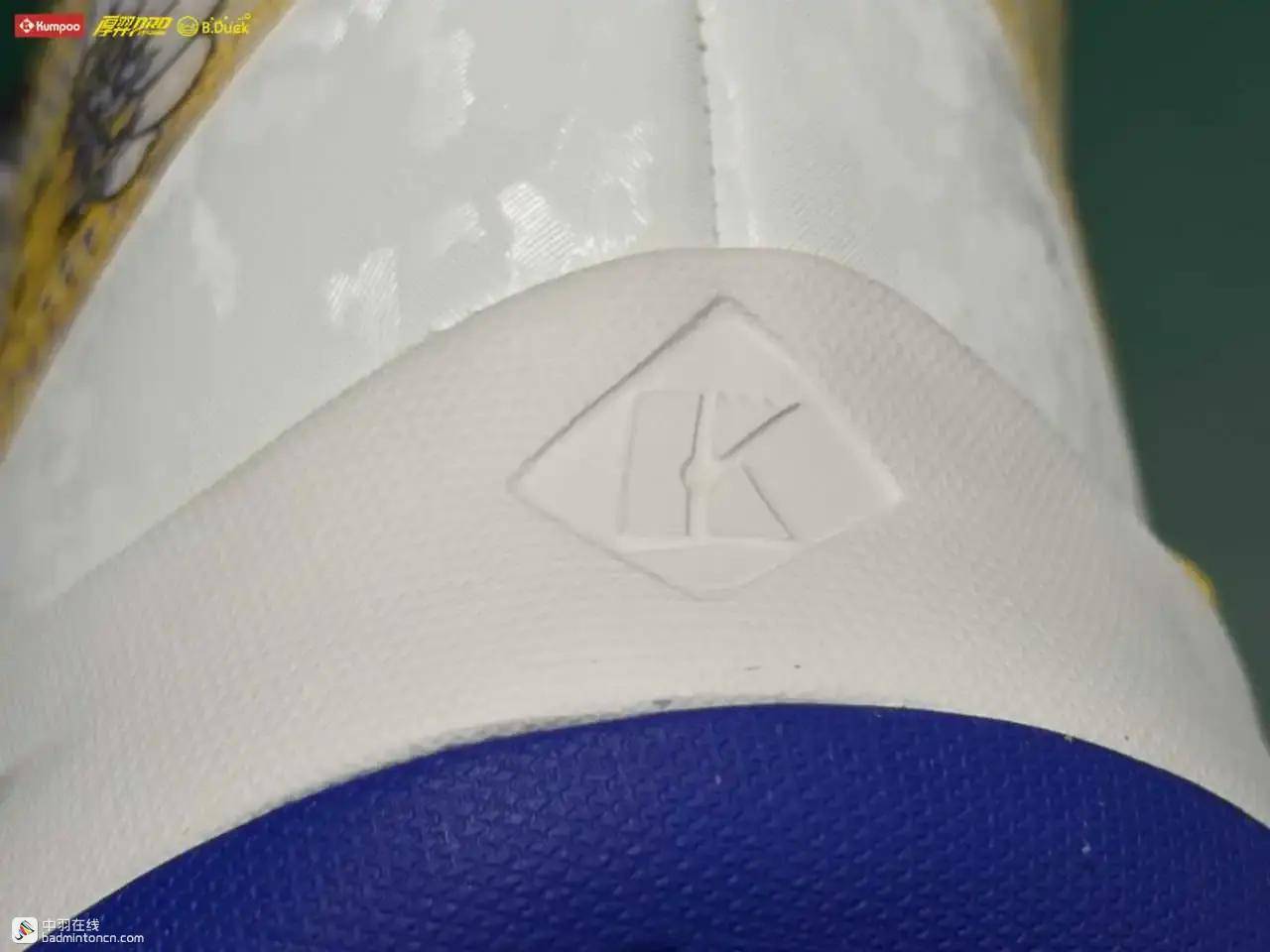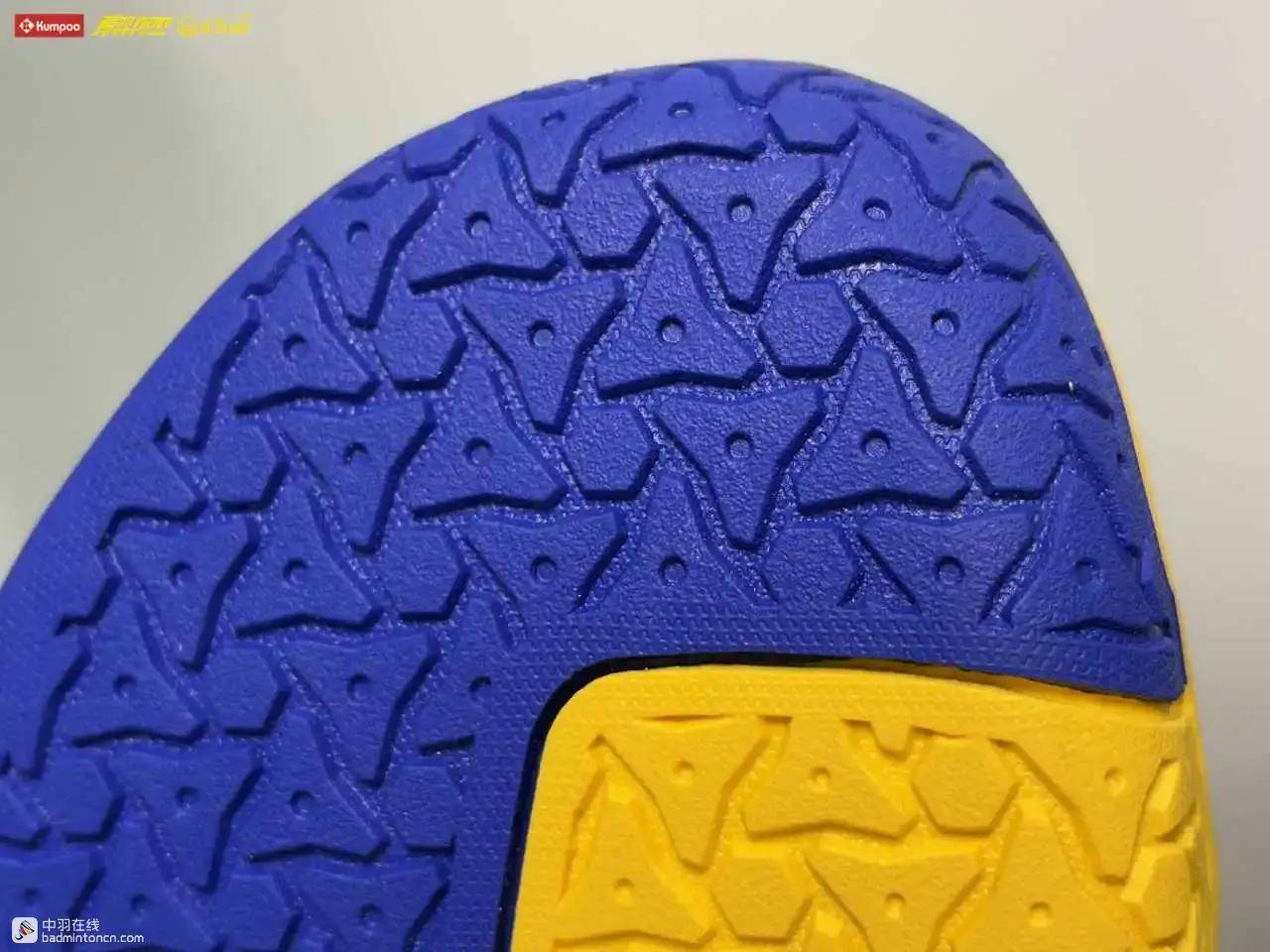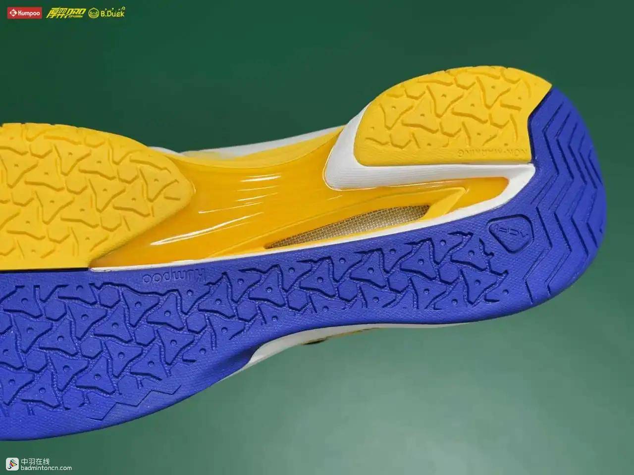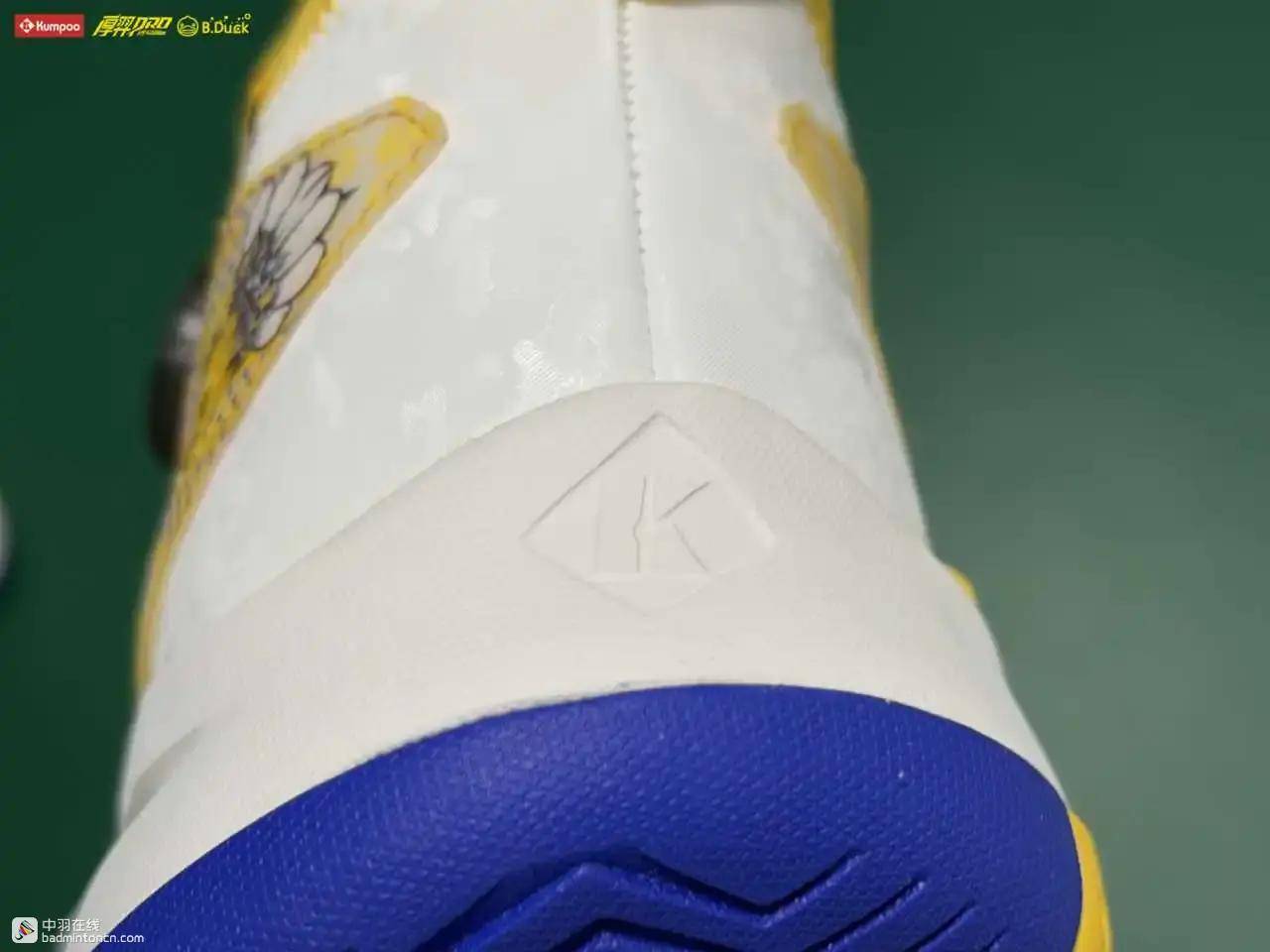 厚羿PRO 小黄鸭的鞋身大面积采用了网布的设计,外表的这层半透明薄膜显得颇为清新时尚,又具有些许科技感。图案方面,厚羿PRO 小黄鸭采用了薰风羽毛球鞋常用的大LOGO设计,品牌名称“Kumpoo”由前掌延伸到后跟,基本占据了整只鞋的外侧,简约而大气,时尚中不失典雅。