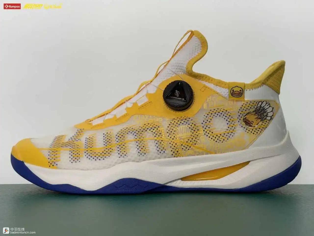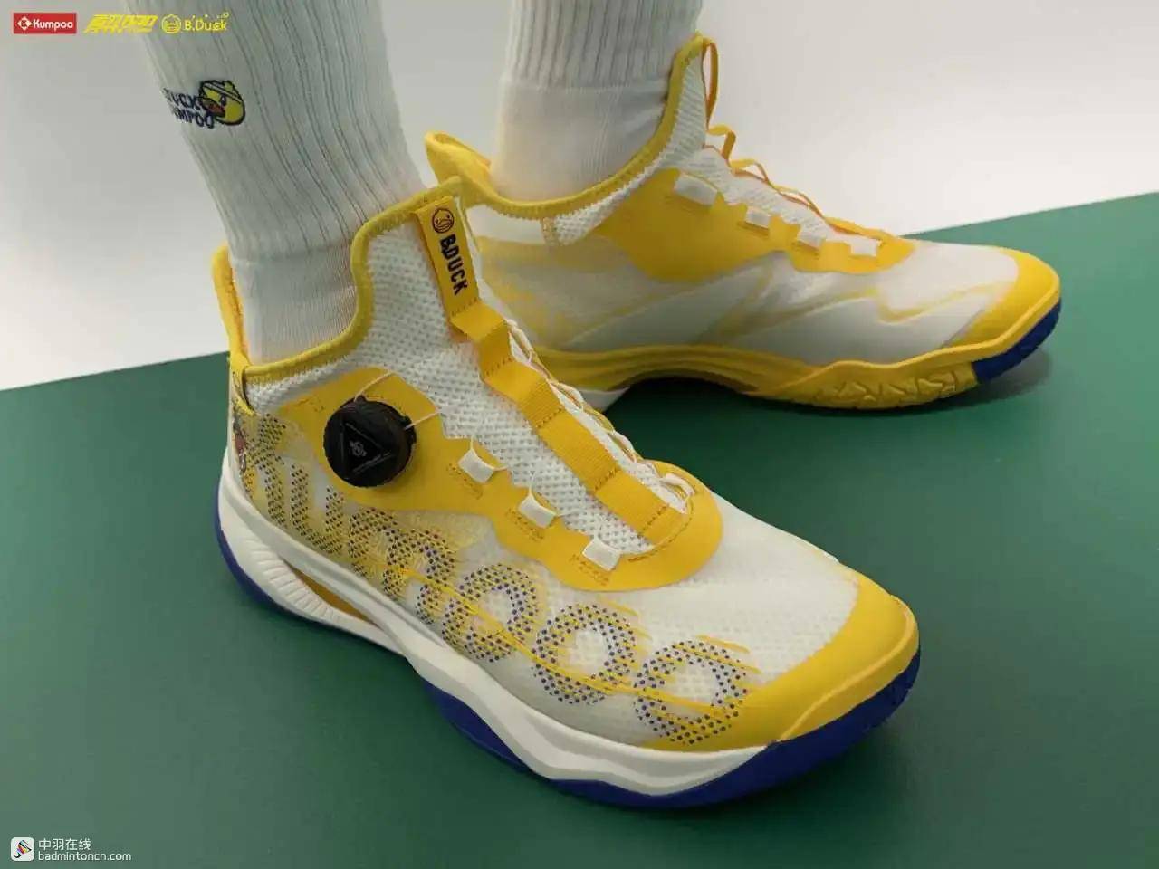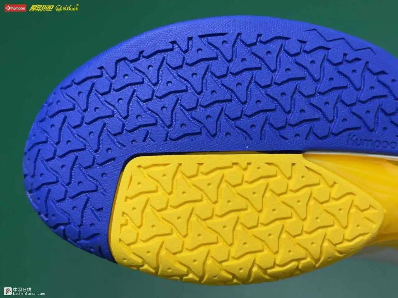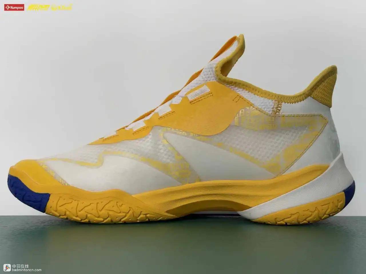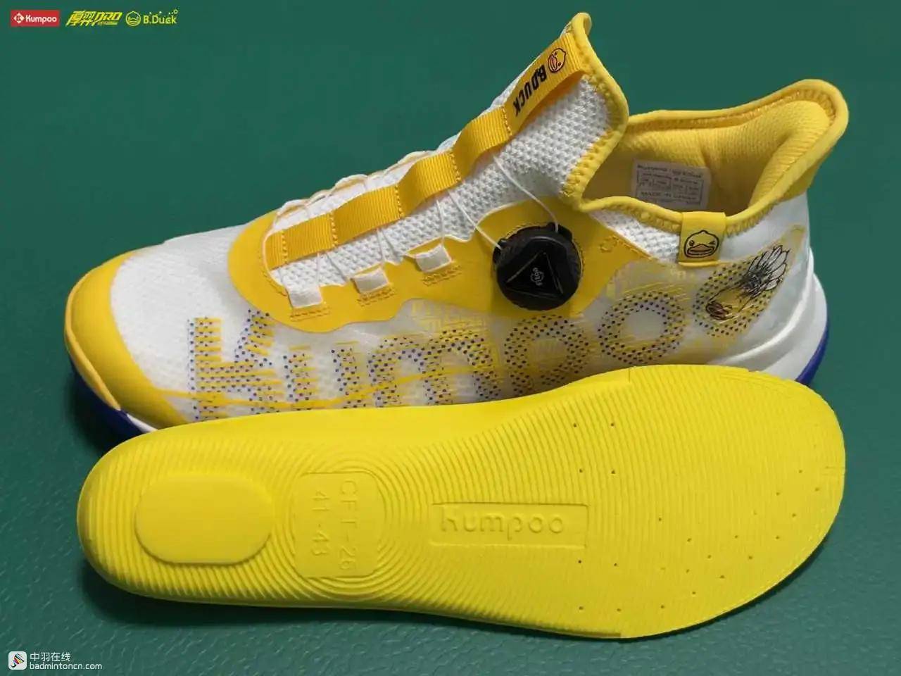 厚羿PRO 小黄鸭的鞋身大面积采用了网布的设计,外表的这层半透明薄膜显得颇为清新时尚,又具有些许科技感。图案方面,厚羿PRO 小黄鸭采用了薰风羽毛球鞋常用的大LOGO设计,品牌名称“Kumpoo”由前掌延伸到后跟,基本占据了整只鞋的外侧,简约而大气,时尚中不失典雅。
