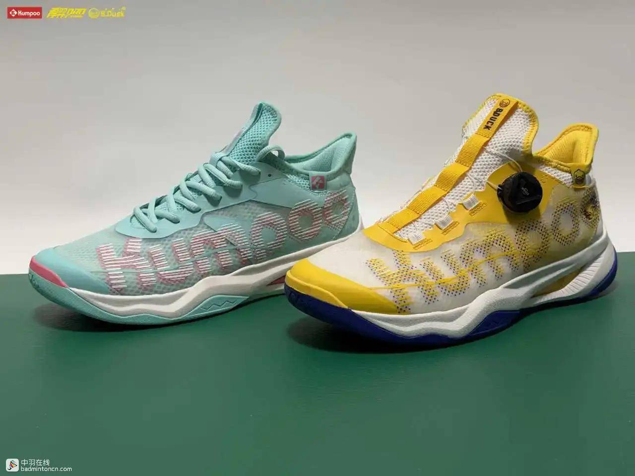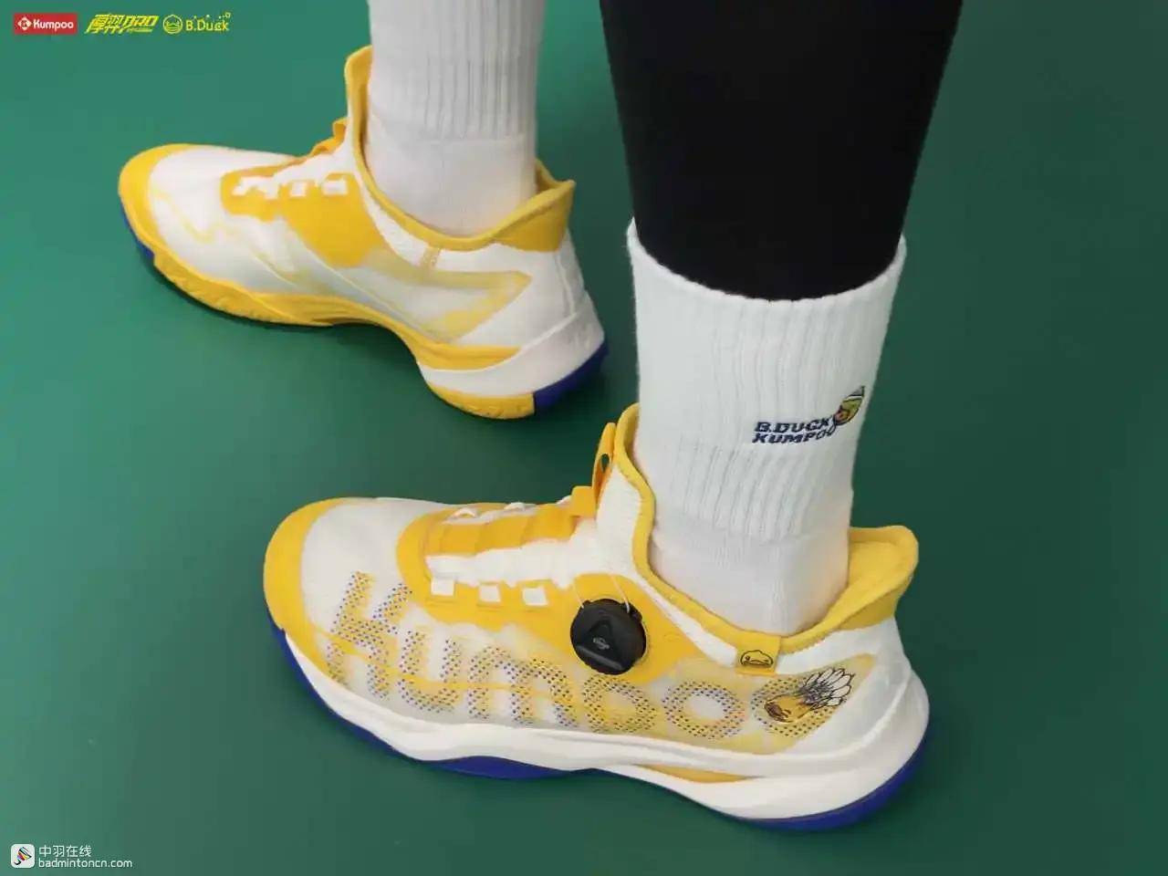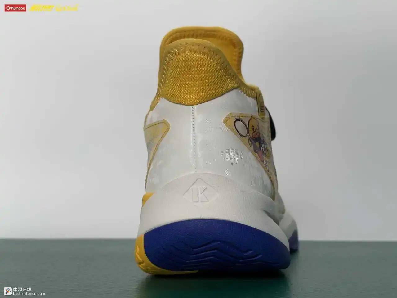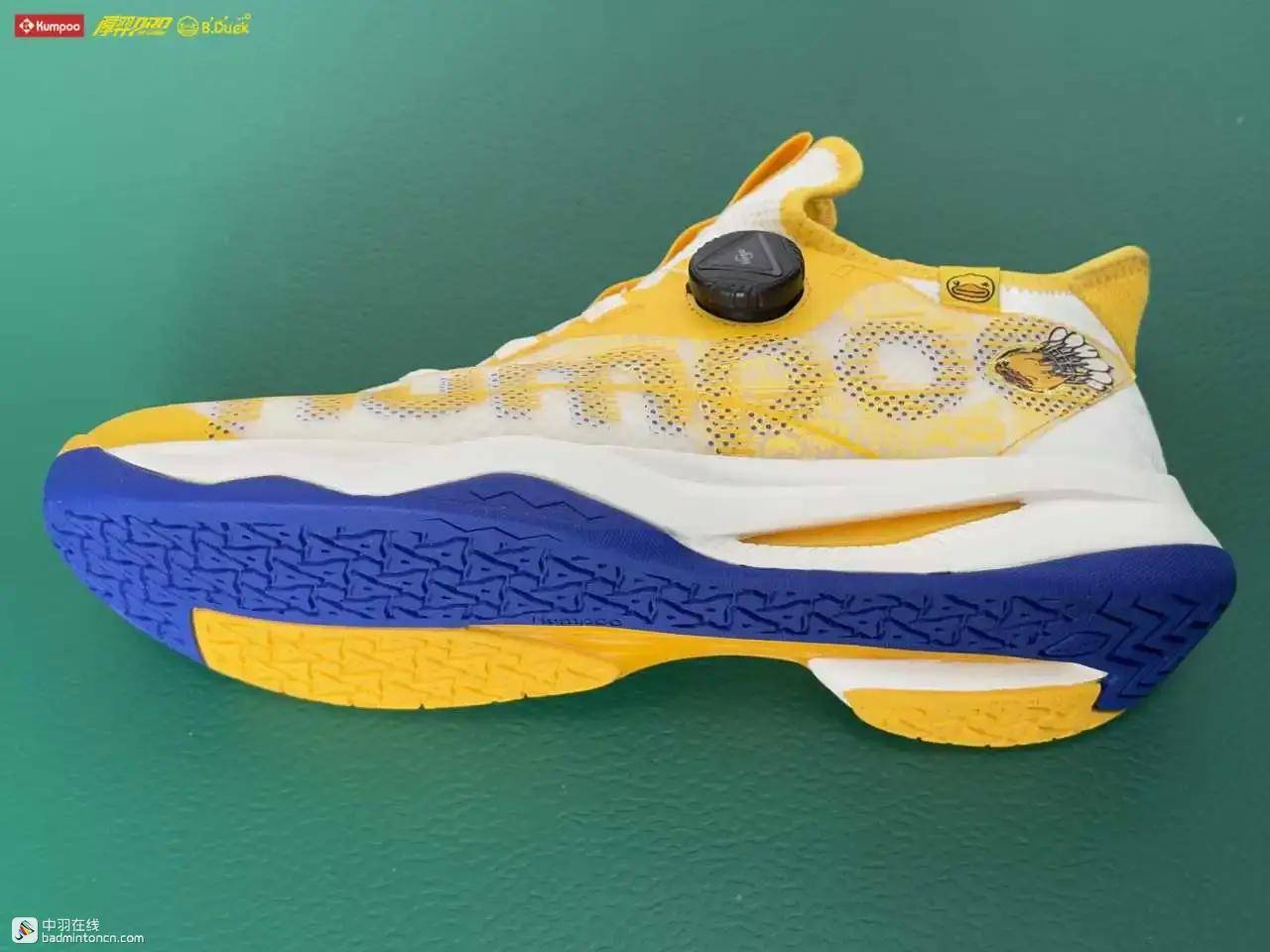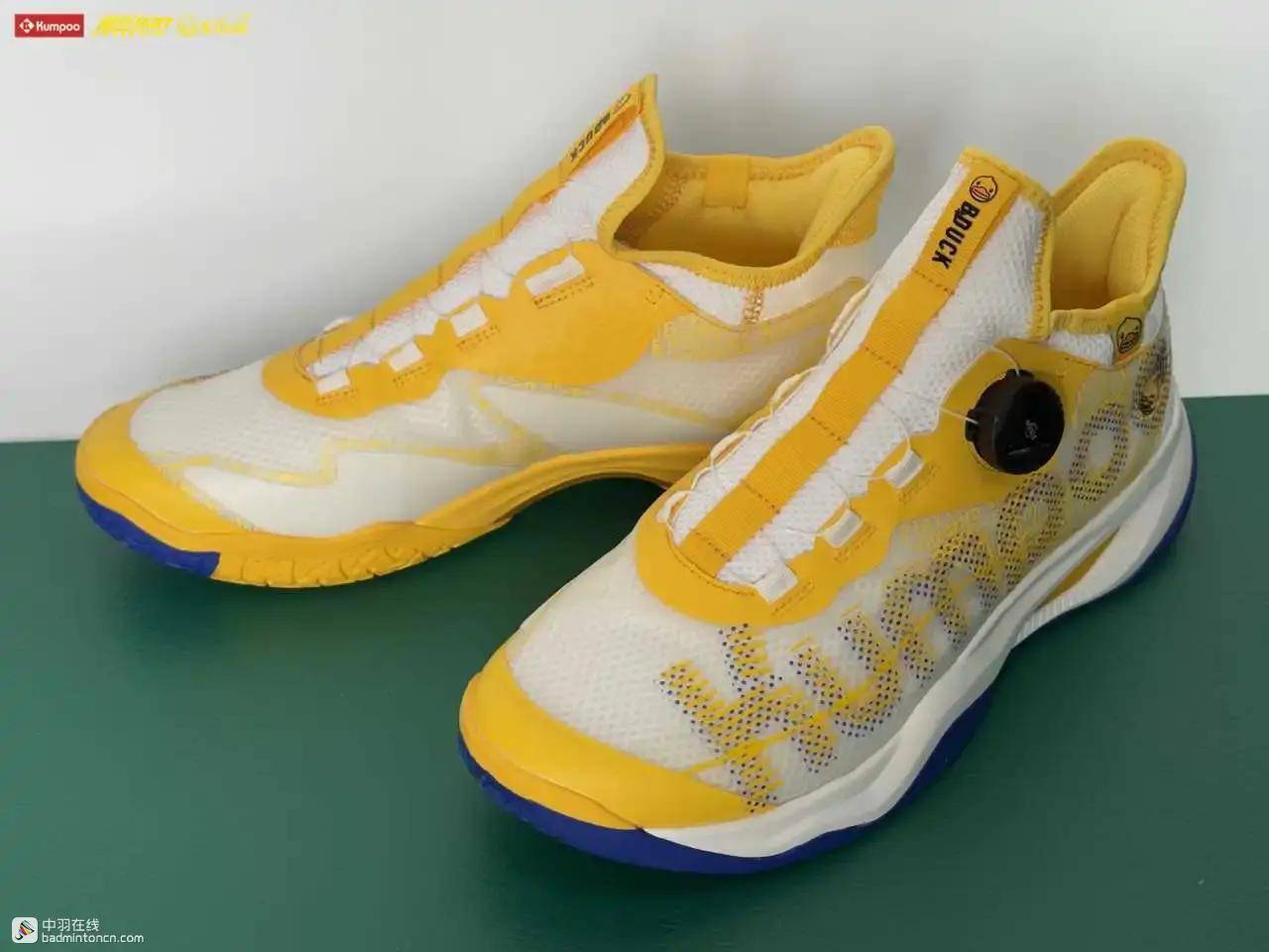 厚羿PRO 小黄鸭的鞋身大面积采用了网布的设计,外表的这层半透明薄膜显得颇为清新时尚,又具有些许科技感。图案方面,厚羿PRO 小黄鸭采用了薰风羽毛球鞋常用的大LOGO设计,品牌名称“Kumpoo”由前掌延伸到后跟,基本占据了整只鞋的外侧,简约而大气,时尚中不失典雅。