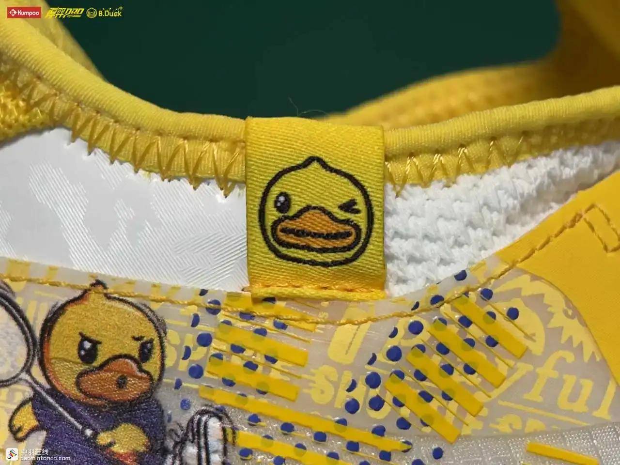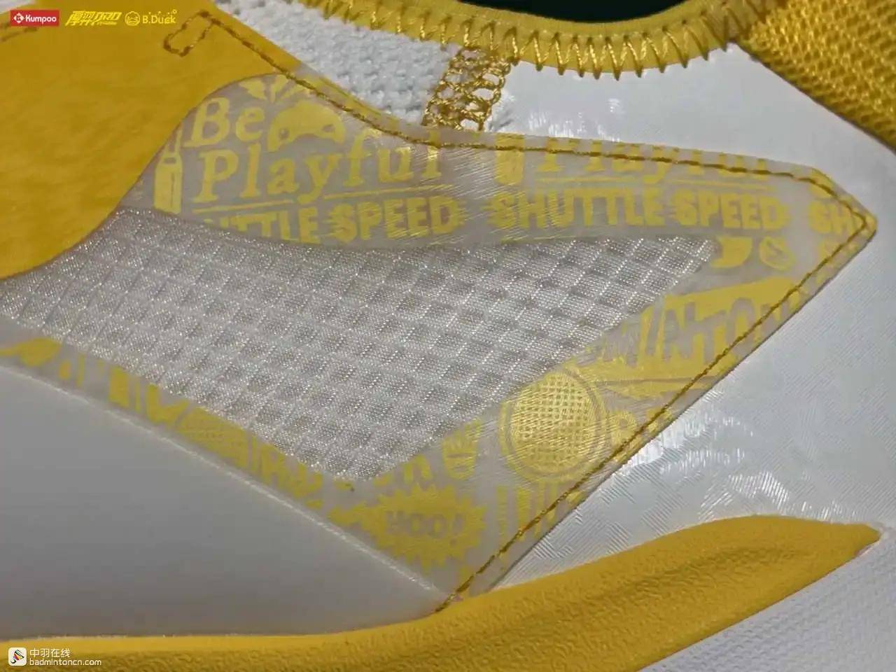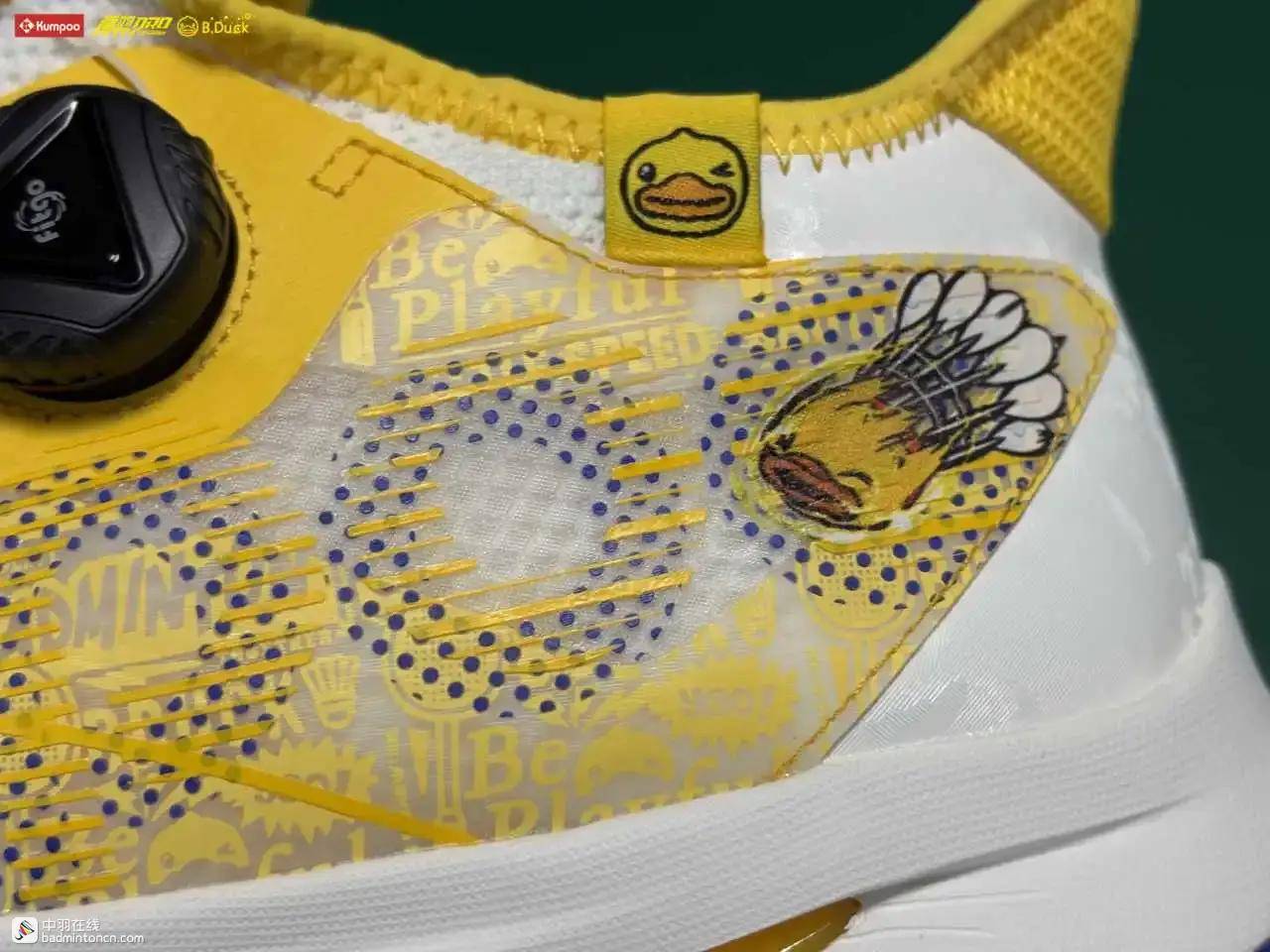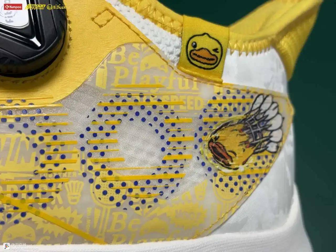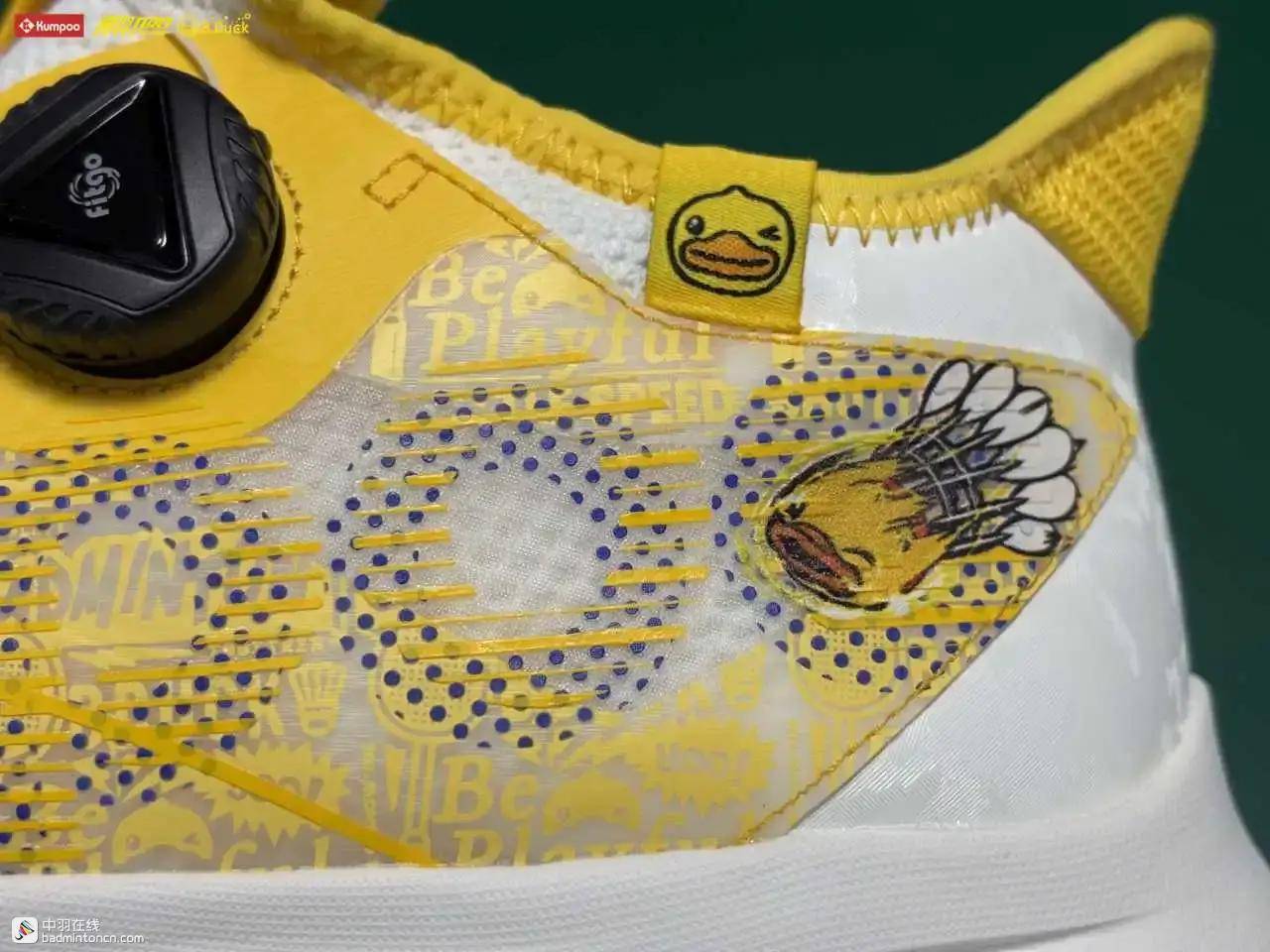 在鞋外侧的中后部、以及内侧鞋面网布的边缘的TPU薄膜上,遍布黄色的图案与文字,内容包括“BADMINTON”、“B. DUCK”、“Be Playful”、“SHUTTLE SPEED”、“yoo!”以及小黄鸭、羽毛球和羽毛球拍图案等等,以版画插图的形式展现“运动”与“快乐”的主题,彰显时代年轻人的时尚态度。