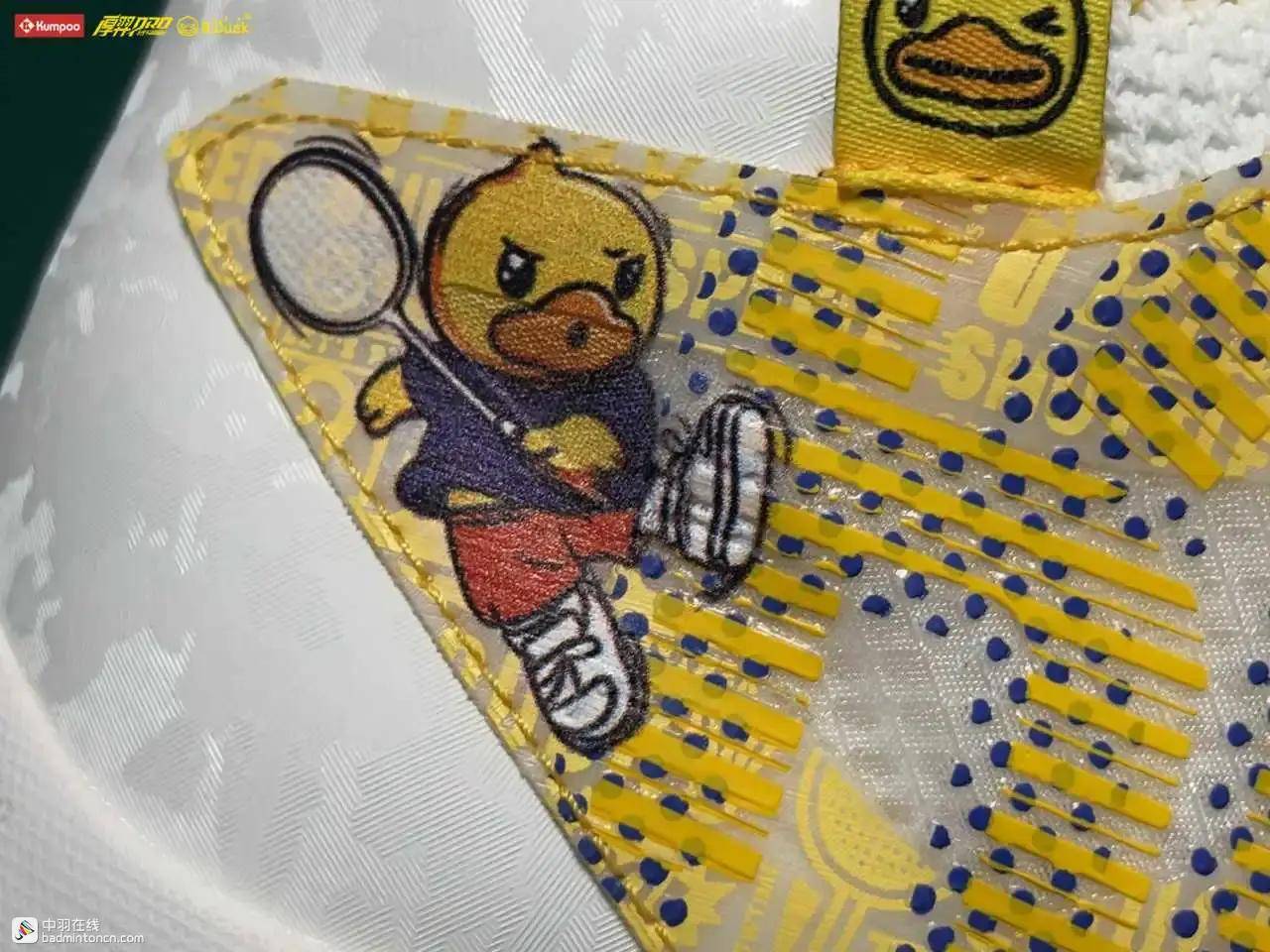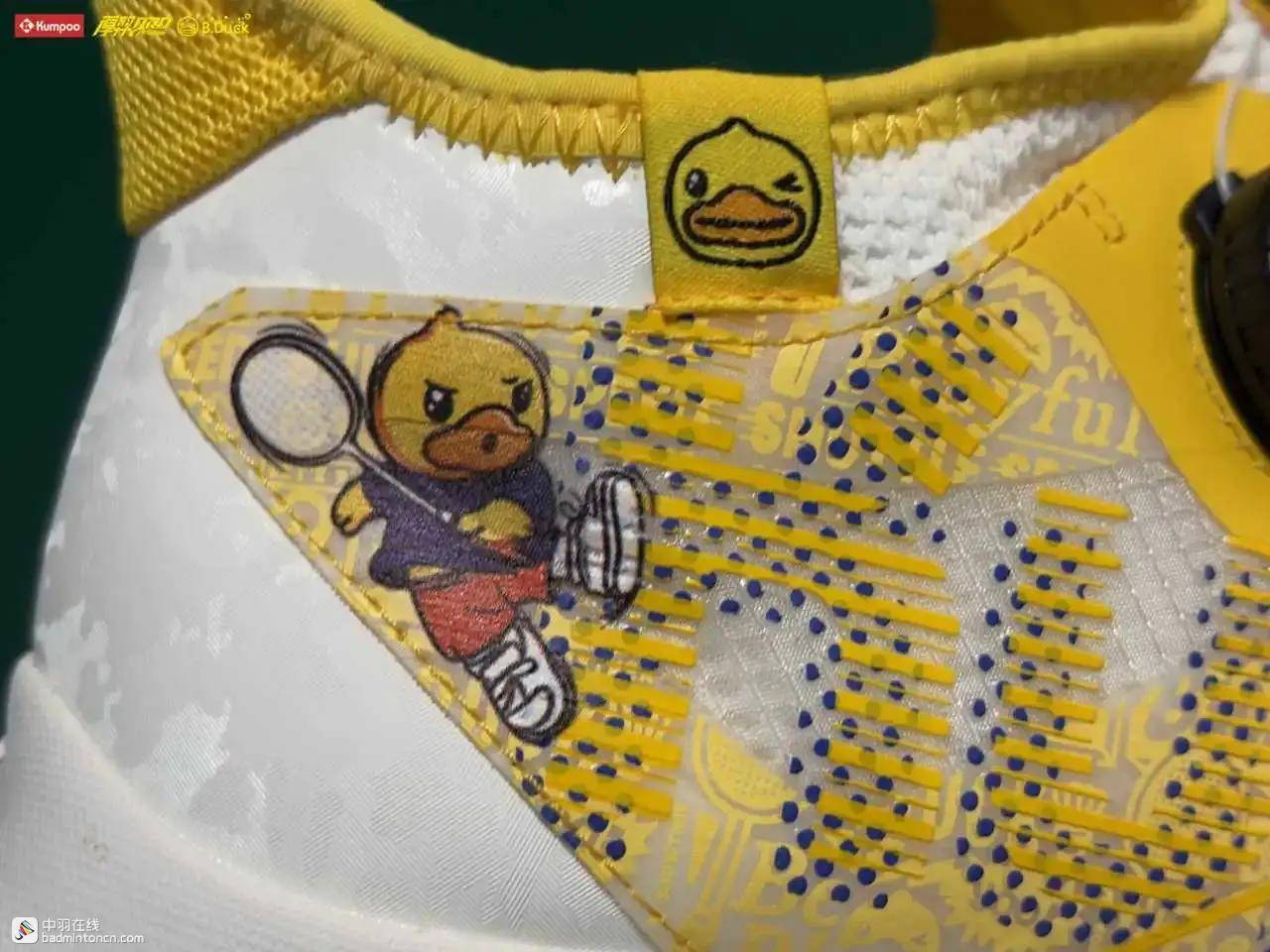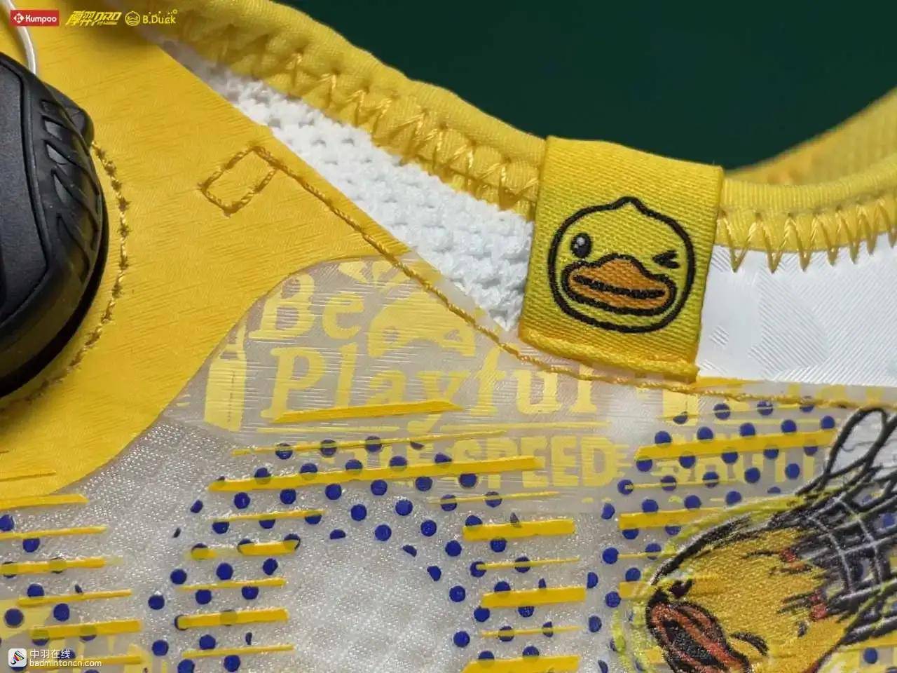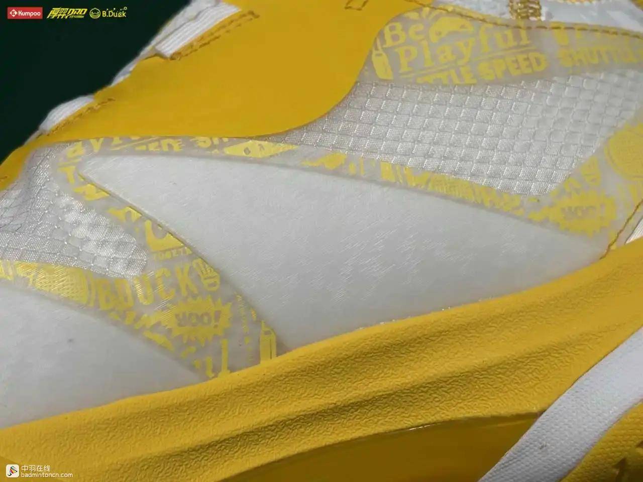 在鞋外侧的中后部、以及内侧鞋面网布的边缘的TPU薄膜上,遍布黄色的图案与文字,内容包括“BADMINTON”、“B. DUCK”、“Be Playful”、“SHUTTLE SPEED”、“yoo!”以及小黄鸭、羽毛球和羽毛球拍图案等等,以版画插图的形式展现“运动”与“快乐”的主题,彰显时代年轻人的时尚态度。