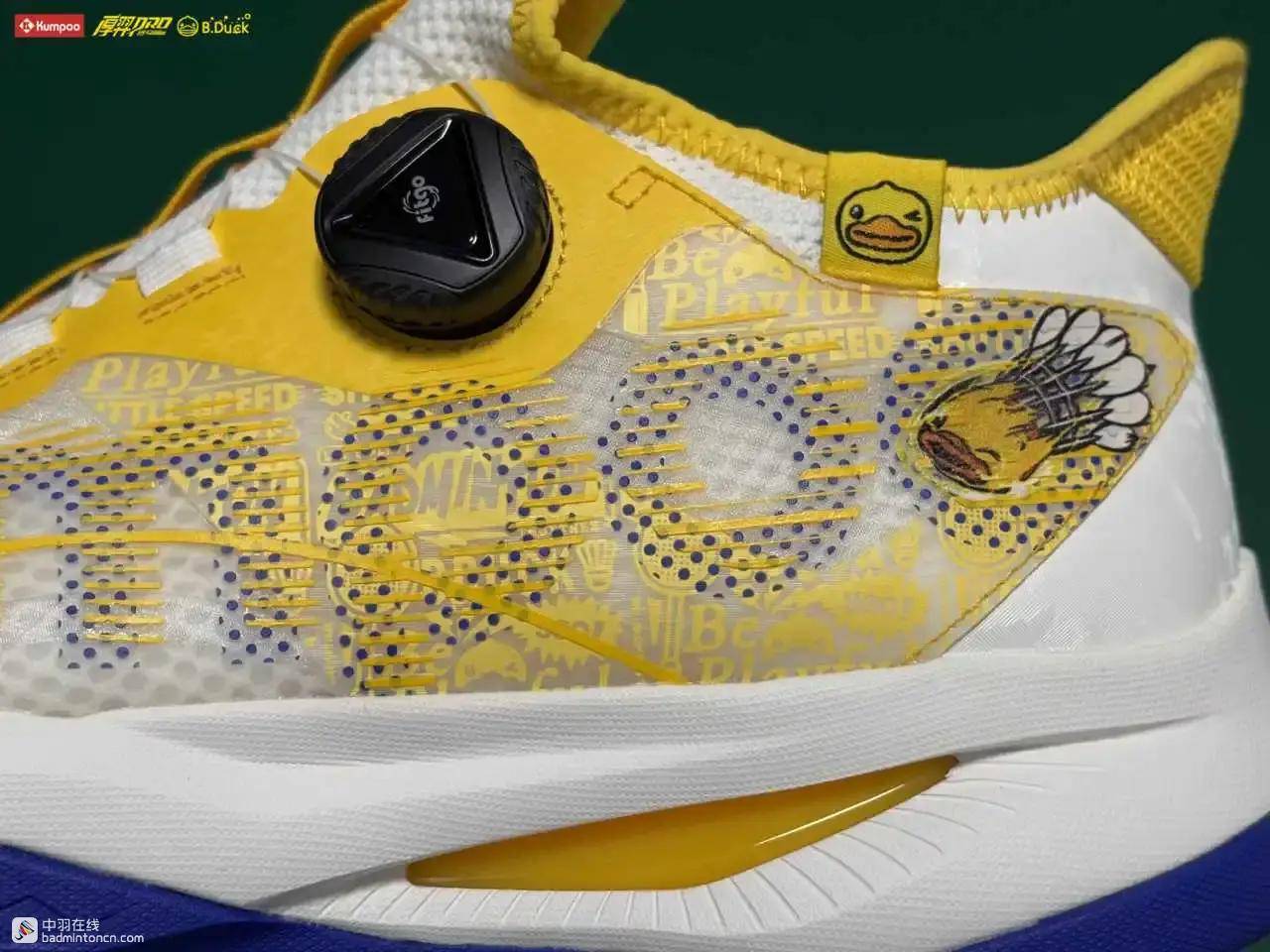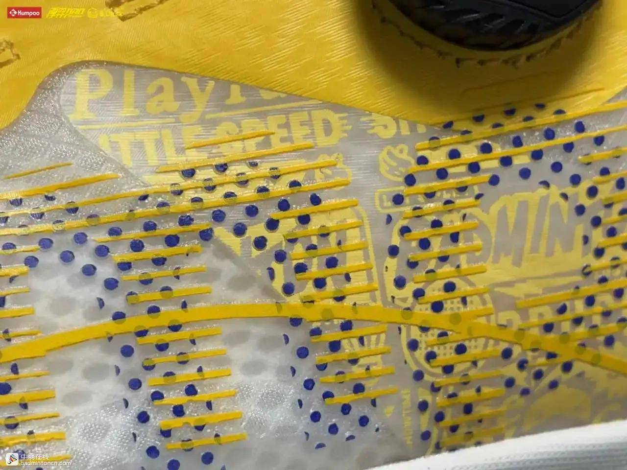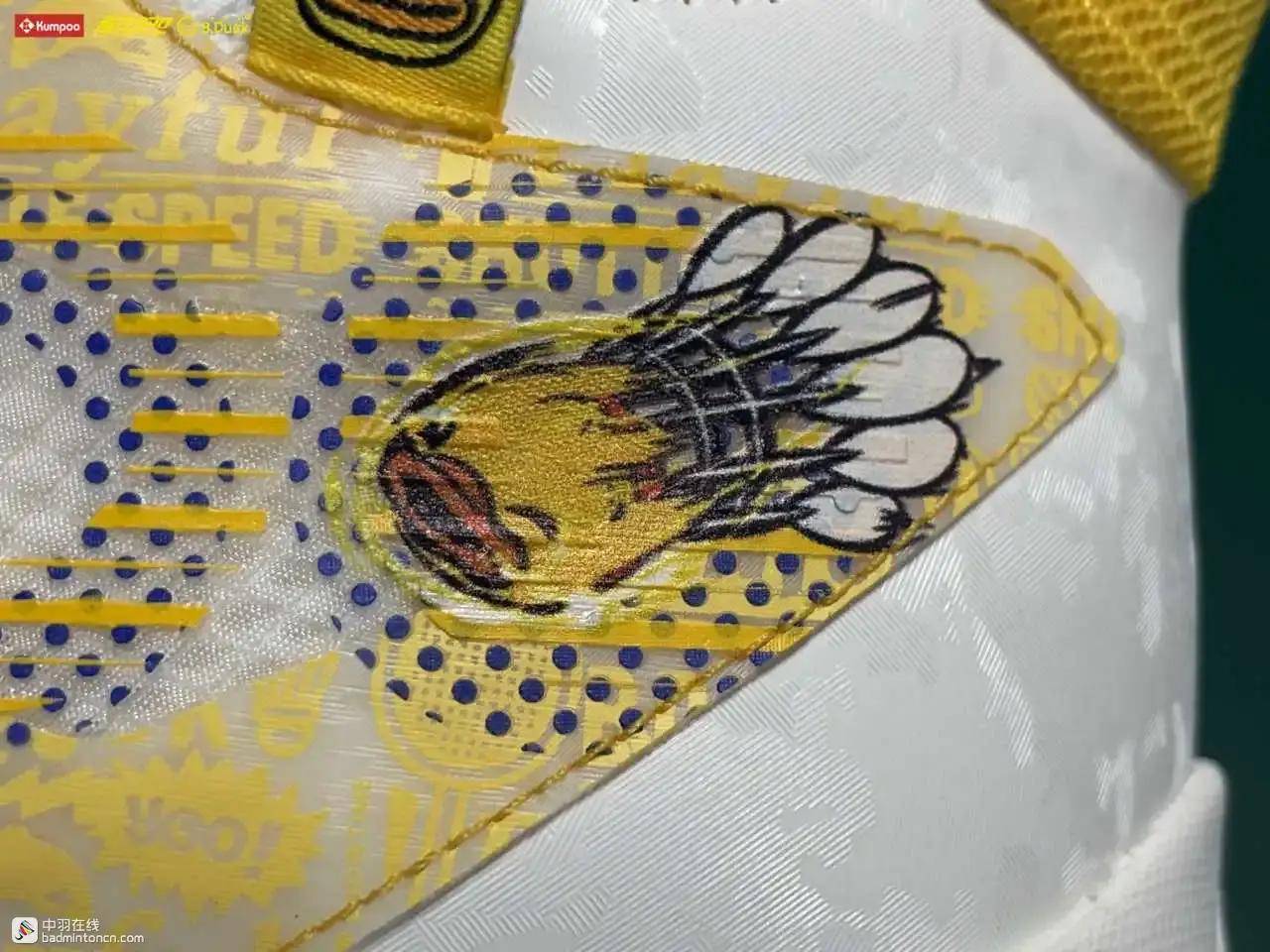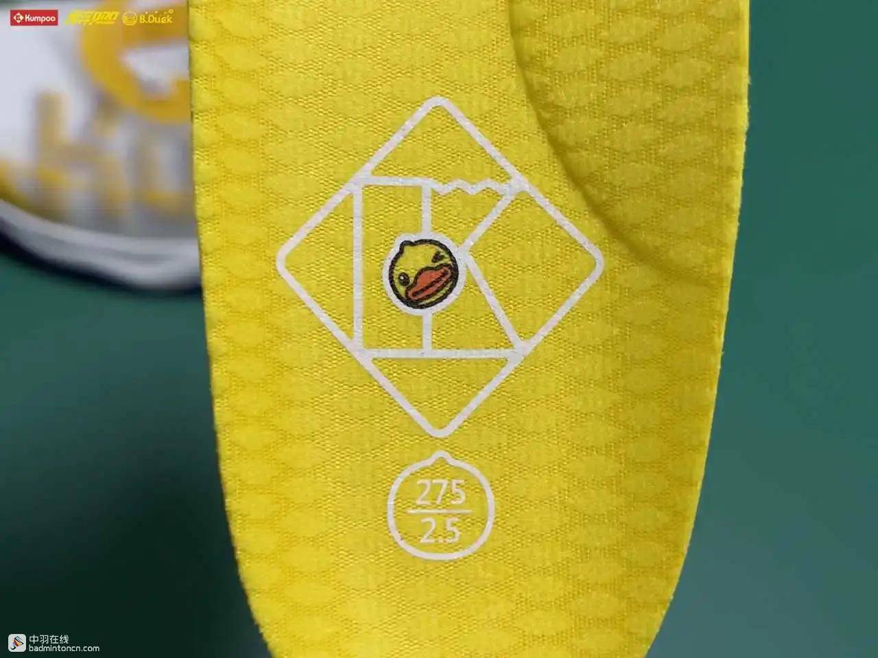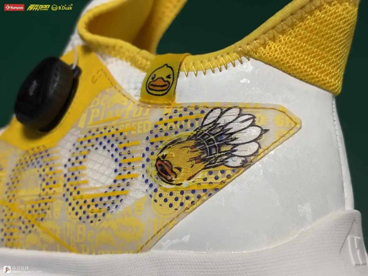 在鞋外侧的中后部、以及内侧鞋面网布的边缘的TPU薄膜上,遍布黄色的图案与文字,内容包括“BADMINTON”、“B. DUCK”、“Be Playful”、“SHUTTLE SPEED”、“yoo!”以及小黄鸭、羽毛球和羽毛球拍图案等等,以版画插图的形式展现“运动”与“快乐”的主题,彰显时代年轻人的时尚态度。