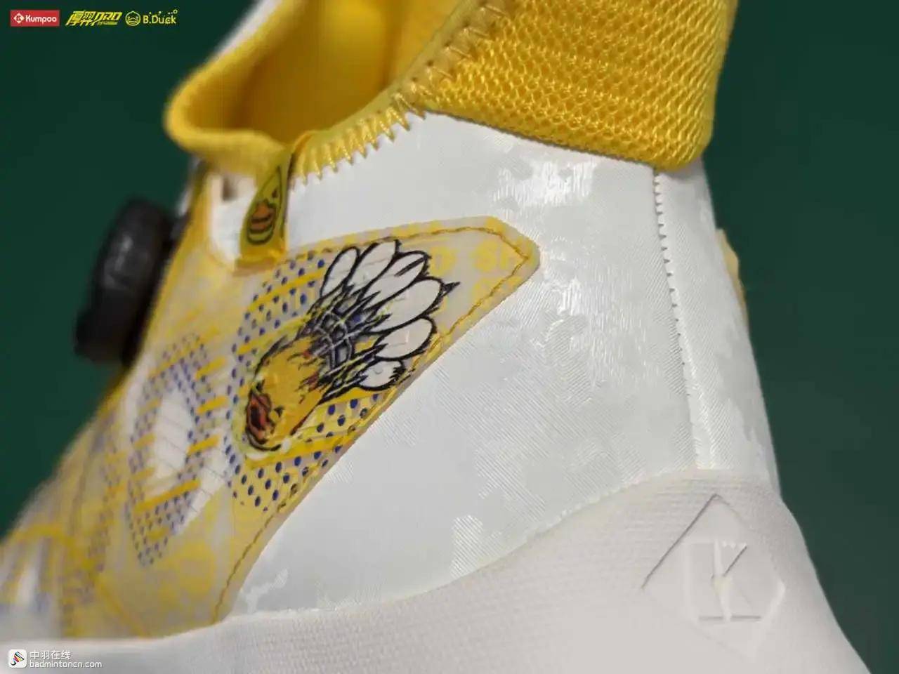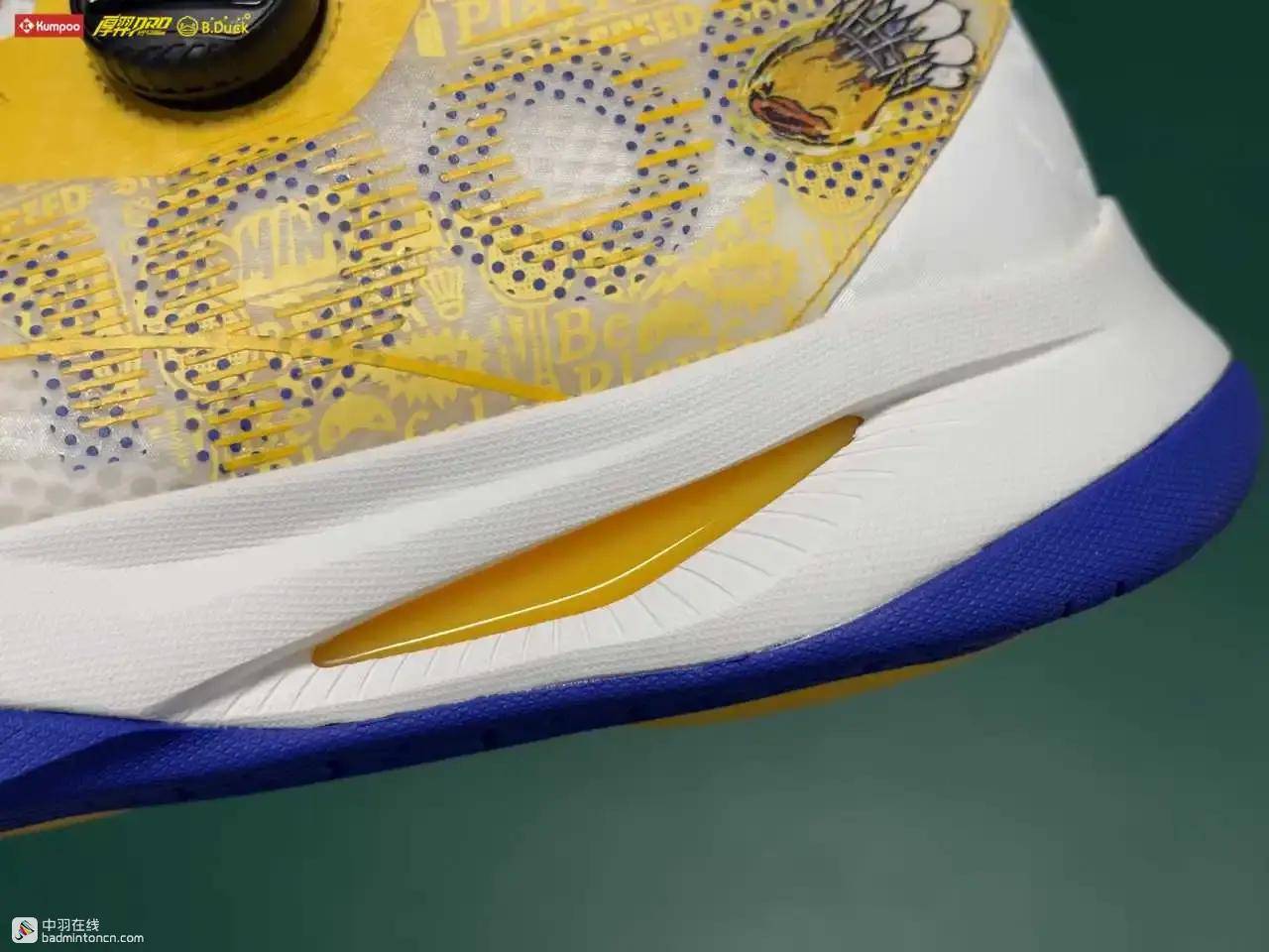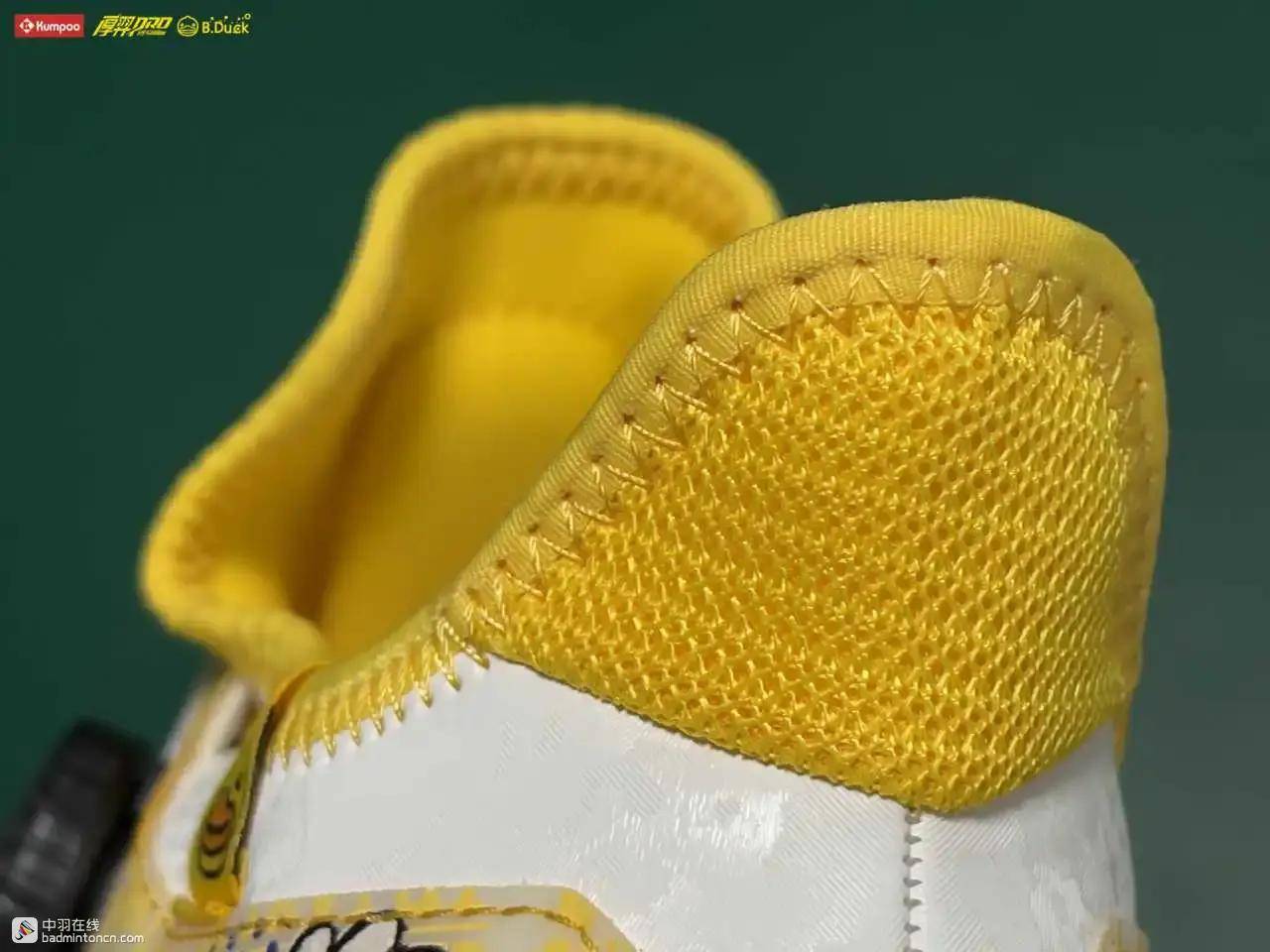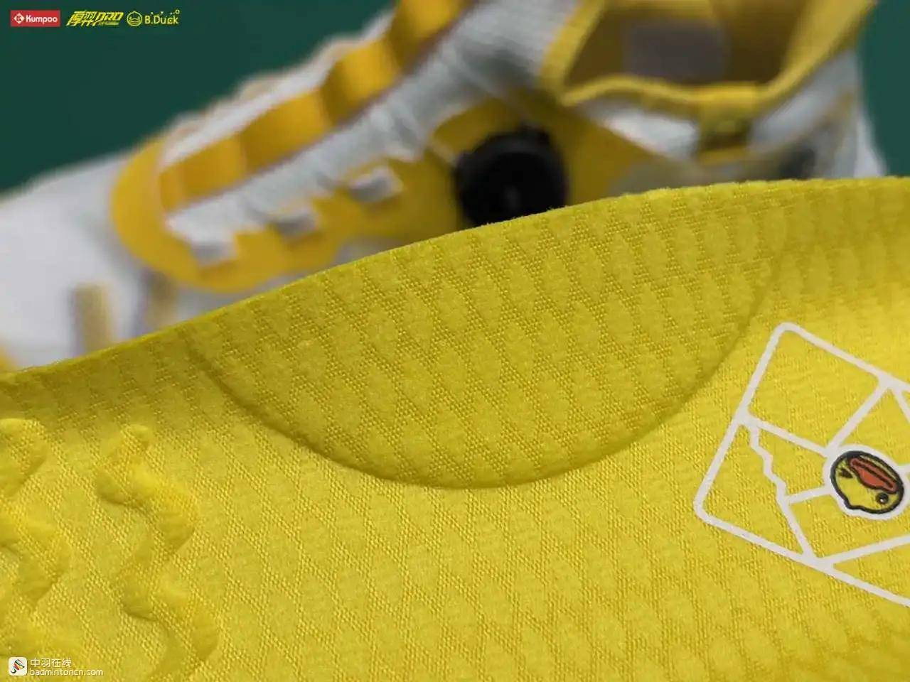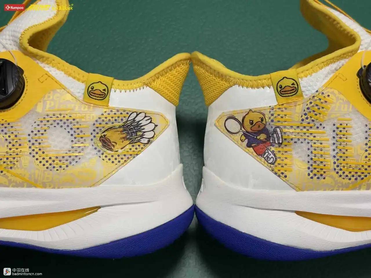 在鞋外侧的中后部、以及内侧鞋面网布的边缘的TPU薄膜上,遍布黄色的图案与文字,内容包括“BADMINTON”、“B. DUCK”、“Be Playful”、“SHUTTLE SPEED”、“yoo!”以及小黄鸭、羽毛球和羽毛球拍图案等等,以版画插图的形式展现“运动”与“快乐”的主题,彰显时代年轻人的时尚态度。
